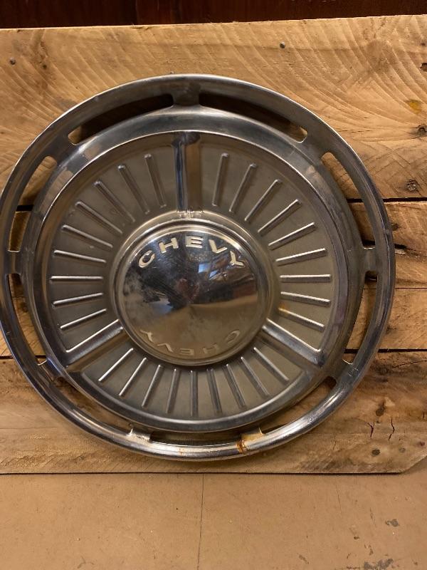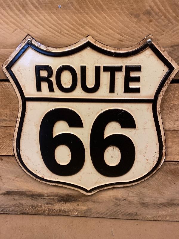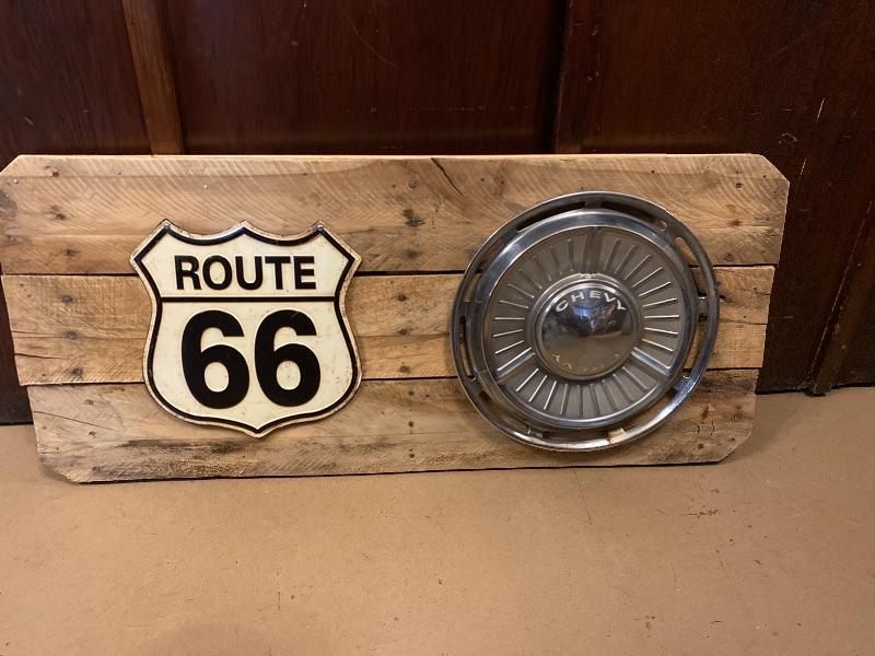 Reproduction Route 66 sign with vintage Chevy Hubcap