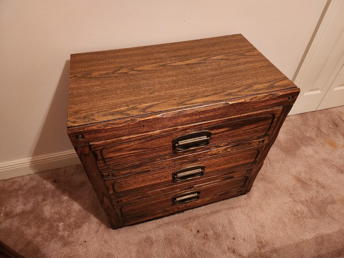 Late 1970's/early 80's - vintage rock maple 3 drawer chest - 30" across, 17" deep, 29.5" tall, good vintage condition.