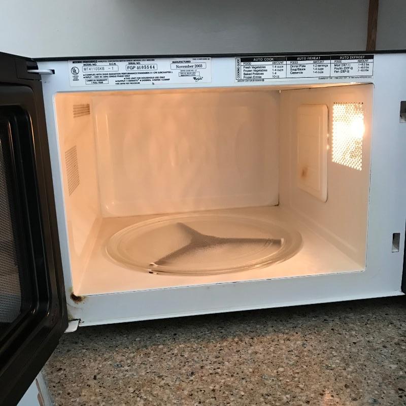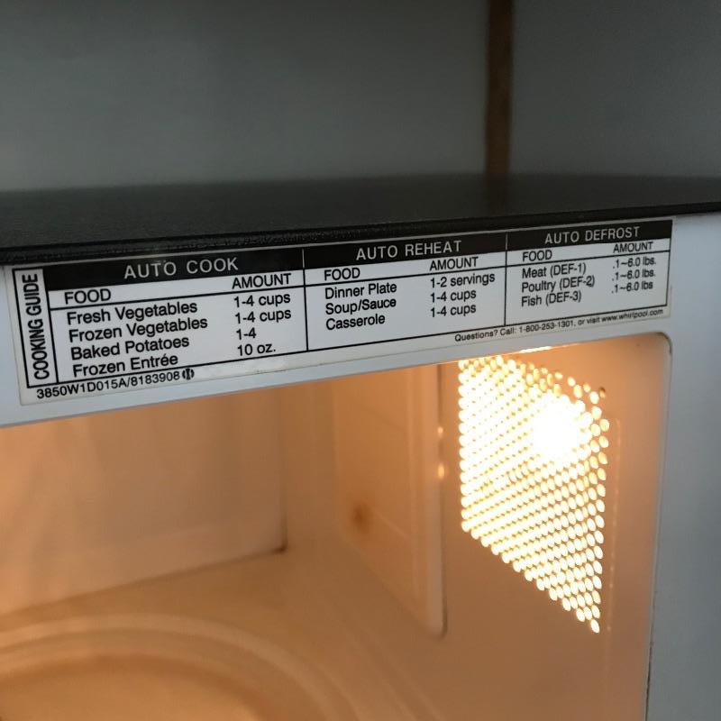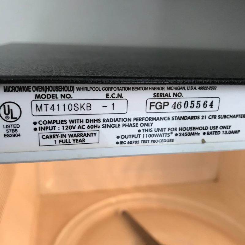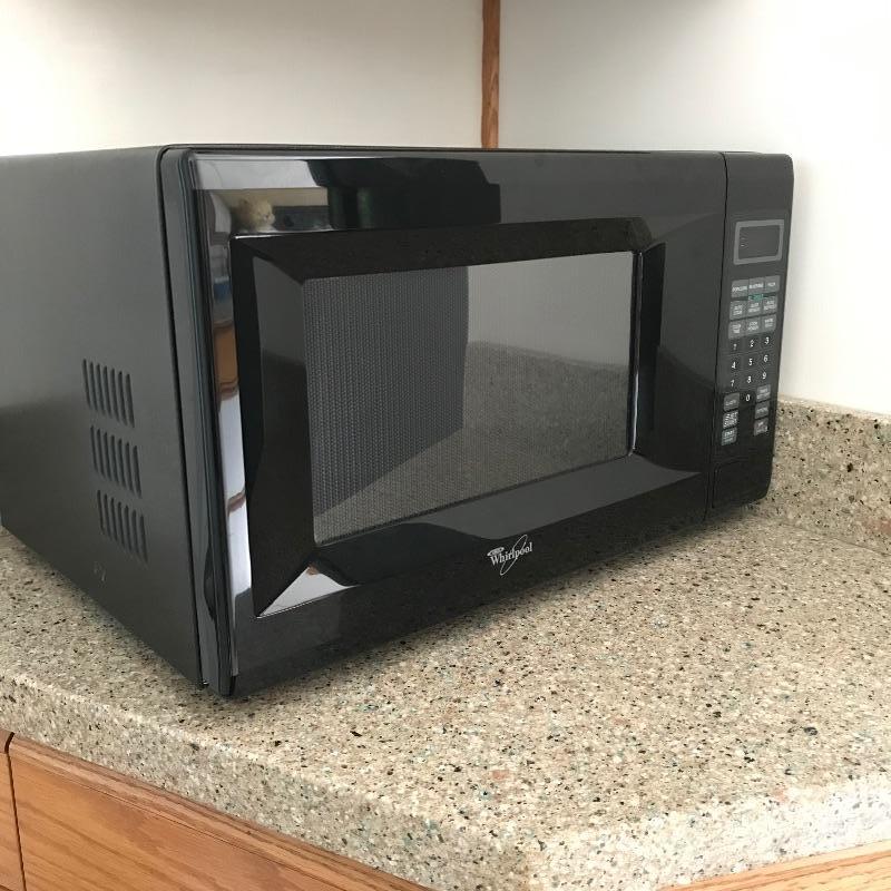 Working Whirlpool Microwave features 1100 watts and a rotating plate. Microwave is clean and works well. Perfect for a smaller space, appliance measures approximately 20” x 15” x 12”. See images for model number. Local pick up only.