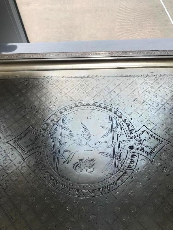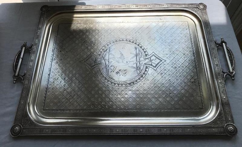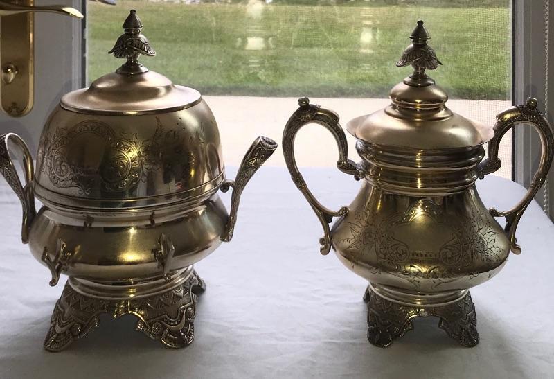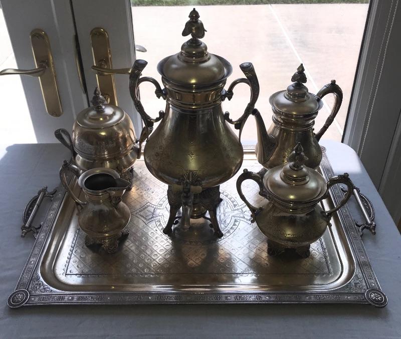 Quadruple plated. 6 pieces. Measurements and pieces are as follows Tray-29” long, 19” wide, Samovar- 18” tall, Teapot- 12” tall, Creamer pitcher- 6” tall (missing lid) , Sugar dish- 10” tall and Warmer- 10-1/2” tall. Eastlake Victorian pattern