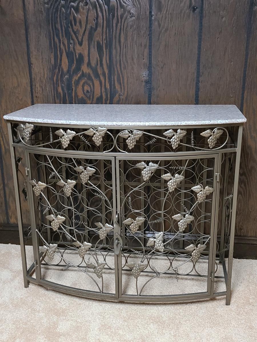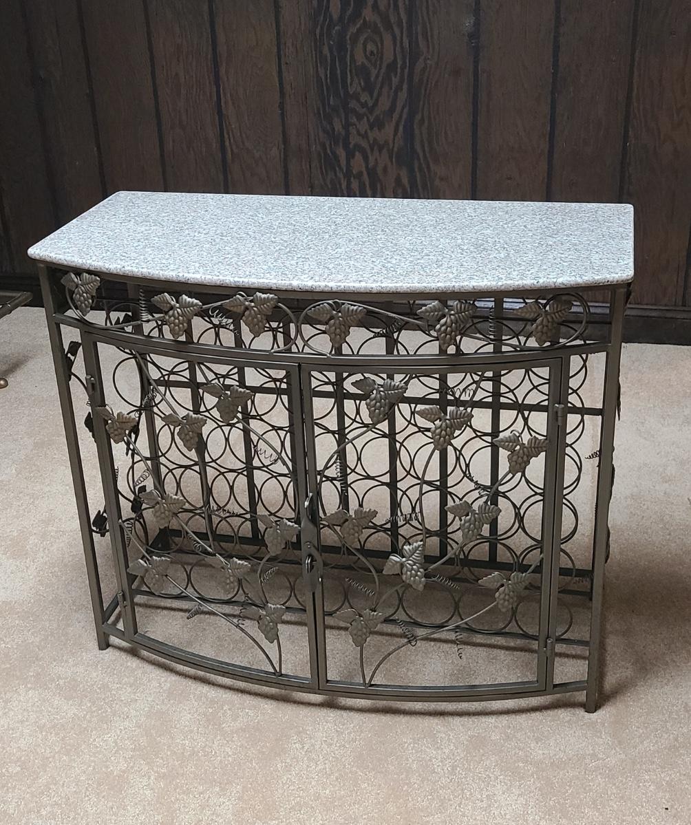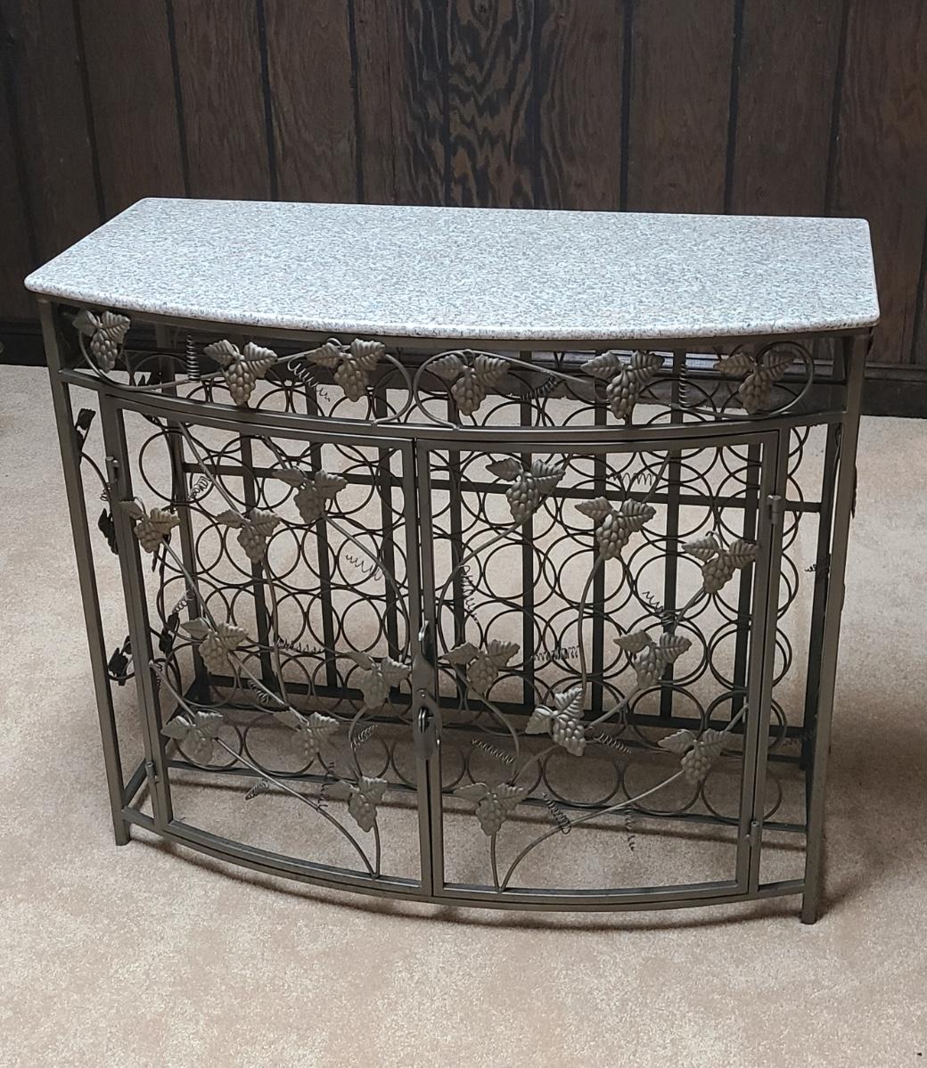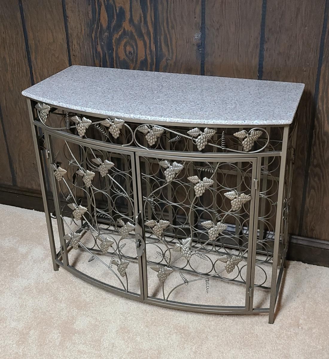This lovely piece has a metal base with grape leaf design with opening front doors. The top looks to be natural stone and the client believes it to be quartz. Please see the close up pictures of the stone and the coloring. This is top heavy but is manageable to move, it is located in the basement and will need to be carried up one flight of stairs and out the front door. Please bring help to move. Please see all pictures as they are the best representation of the items. The pictures show condition, measurements if taken, and what is included in the lot. Due to the large amount that we photograph and the time frame, we are not always able to take measurements. All items unless noted, are pre-owned and have been used. If you purchased furniture, you must bring help. We do not allow one person to carry large furniture out on their own. Bring help, tools and a truck for the safety of our client’s homes, and your personal safety. Company policy. Thank you.