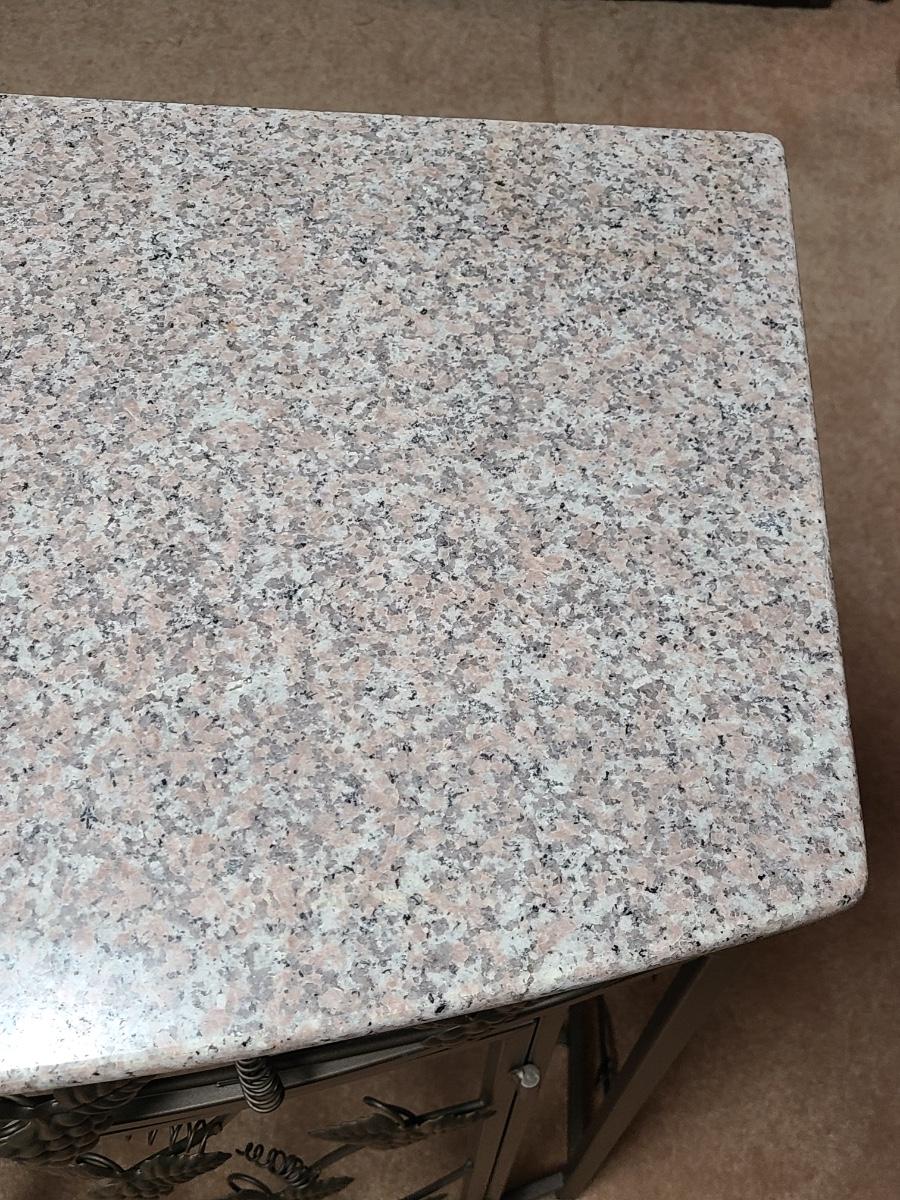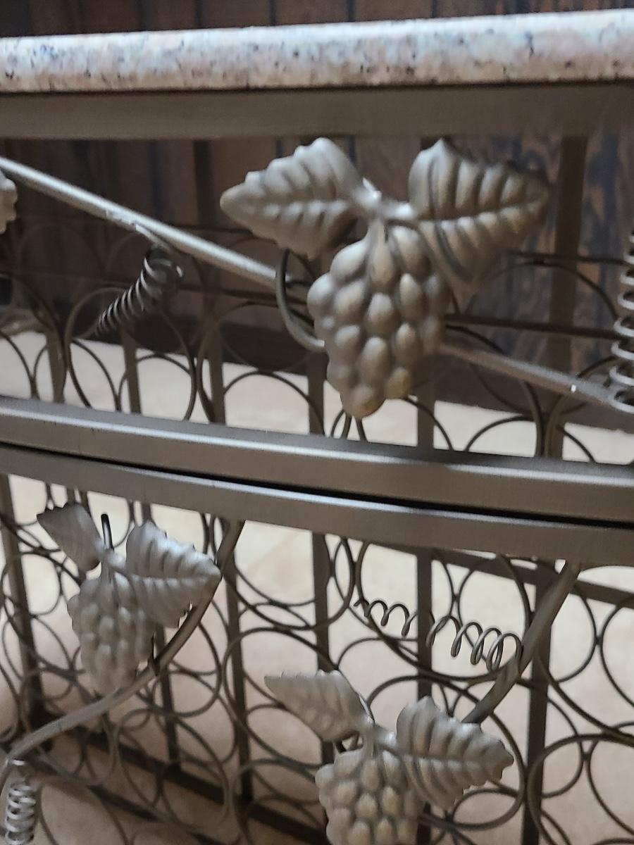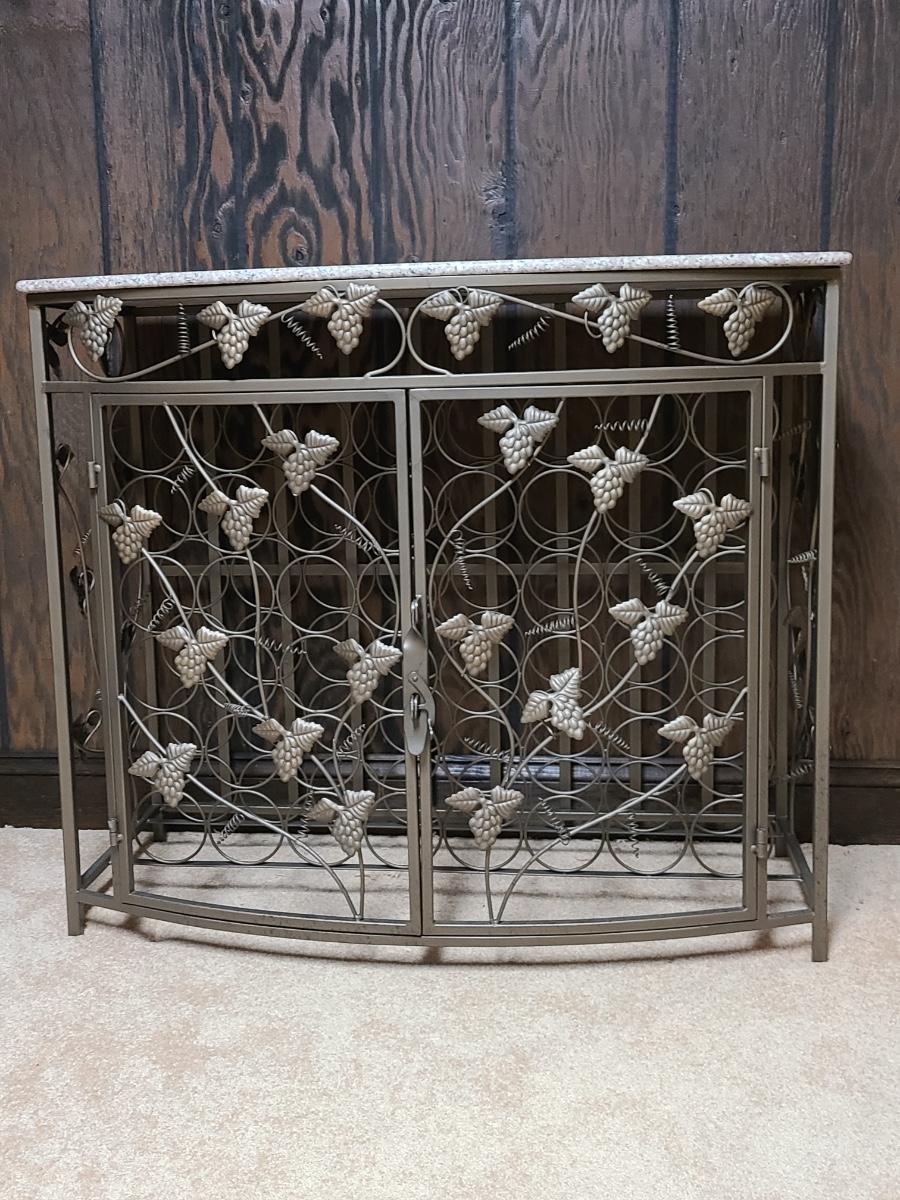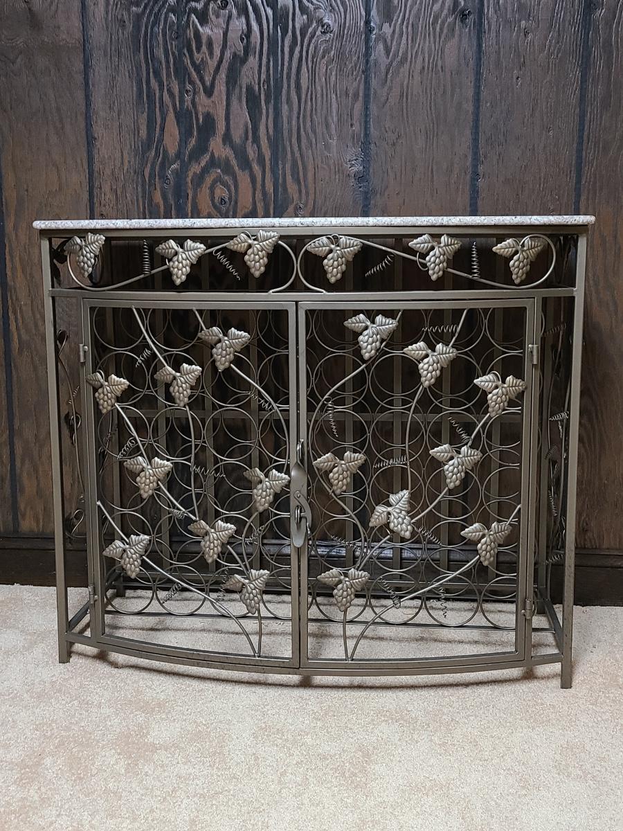 This lovely piece has a metal base with grape leaf design with opening front doors. The top looks to be natural stone and the client believes it to be quartz. Please see the close up pictures of the stone and the coloring. This is top heavy but is manageable to move, it is located in the basement and will need to be carried up one flight of stairs and out the front door. Please bring help to move. Please see all pictures as they are the best representation of the items. The pictures show condition, measurements if taken, and what is included in the lot. Due to the large amount that we photograph and the time frame, we are not always able to take measurements. All items unless noted, are pre-owned and have been used. If you purchased furniture, you must bring help. We do not allow one person to carry large furniture out on their own. Bring help, tools and a truck for the safety of our client’s homes, and your personal safety. Company policy. Thank you.