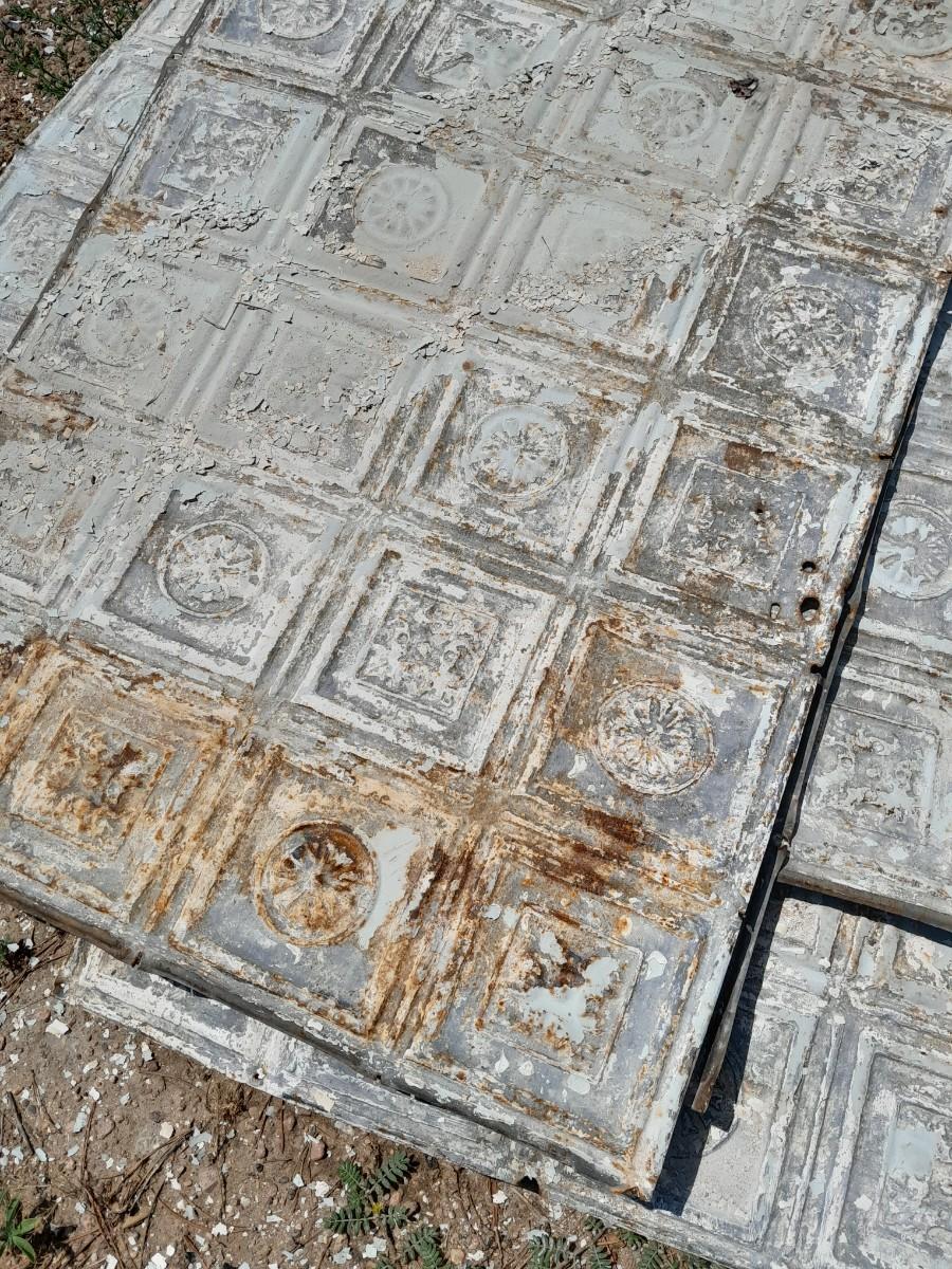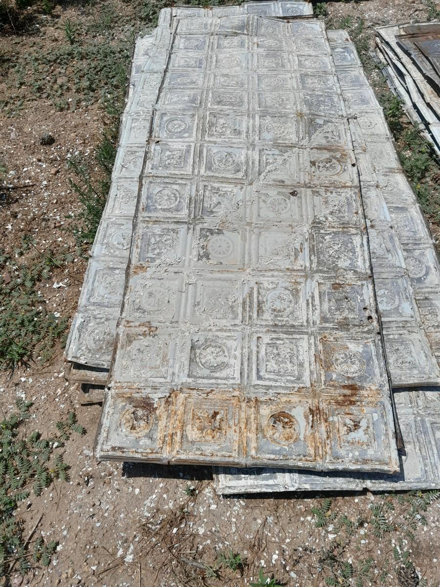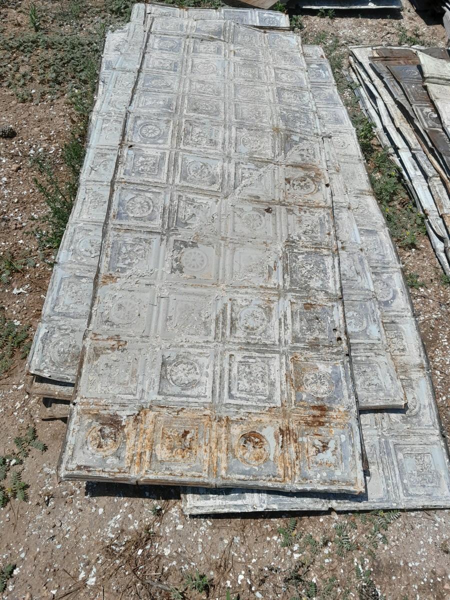 TEN SHEETS TOTAL --- VINTAGE METAL SHEETING WITH RAISED DESIGN THIS SHEETING HAS BEEN PREVIOUSLY PAINTED, AND THE PAINT IS CHIPPING OFF. THERE IS ALSO SOME RUST. APPROX 6' X 24"