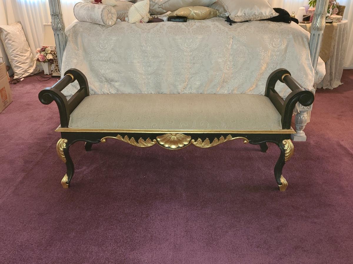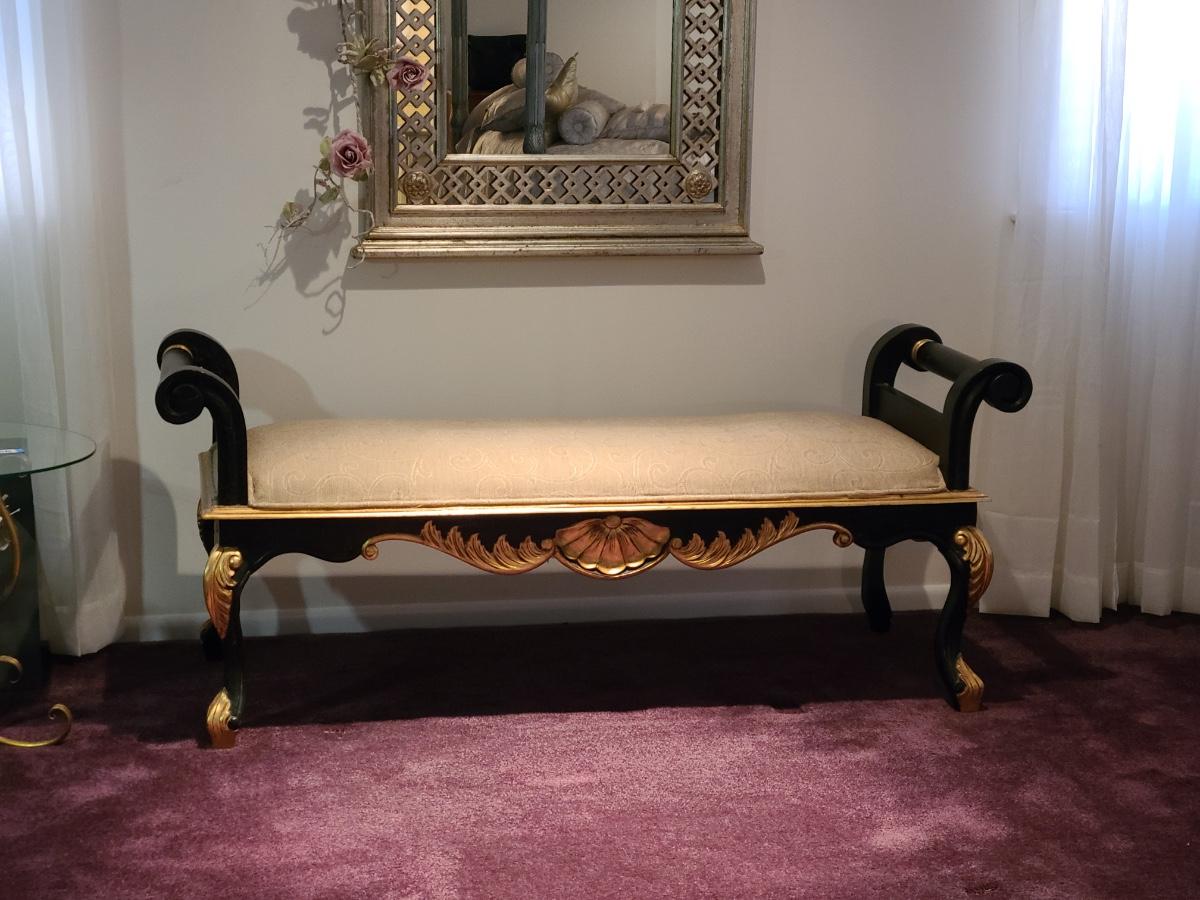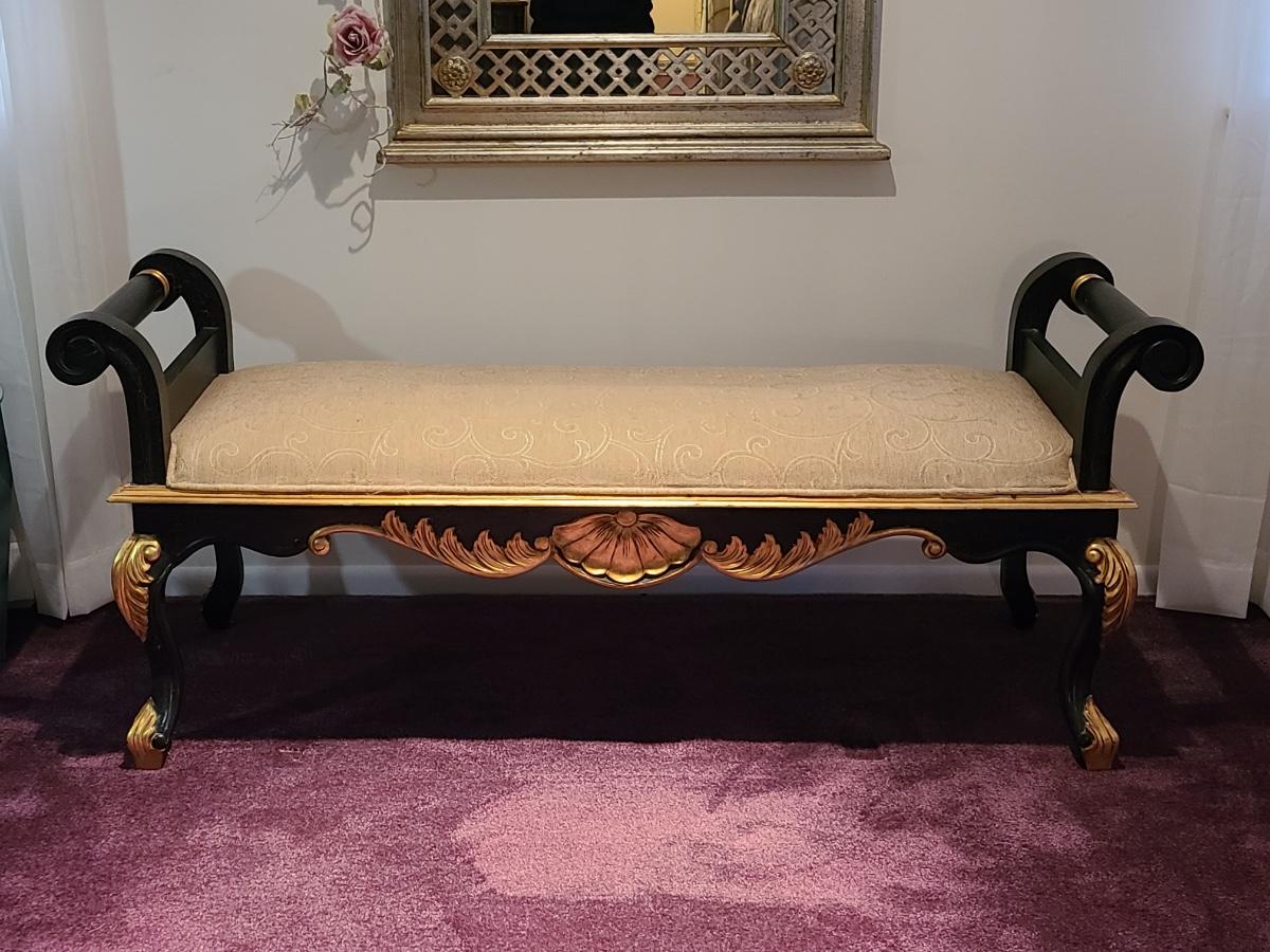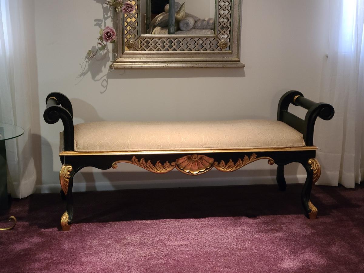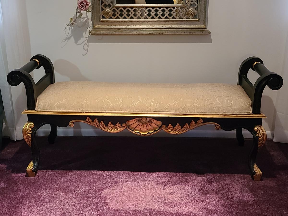 This piece is gorgeous and functional! Gold accents on black with character distressing. The cushioned seat is clean, soft, and has swirl accents. Perfect for any room in the home! Please see all pictures as they are the best representation of the items. The pictures show condition, measurements if taken, and what is included in the lot. Due to the large amount that we photograph and the time frame, we are not always able to take measurements. All items unless noted, are pre-owned and have been used. If you purchased furniture, you must bring help. We do not allow one person to carry large furniture out on their own. Bring help, tools and a truck for the safety of our client’s homes, and your personal safety. Company policy. Thank you.