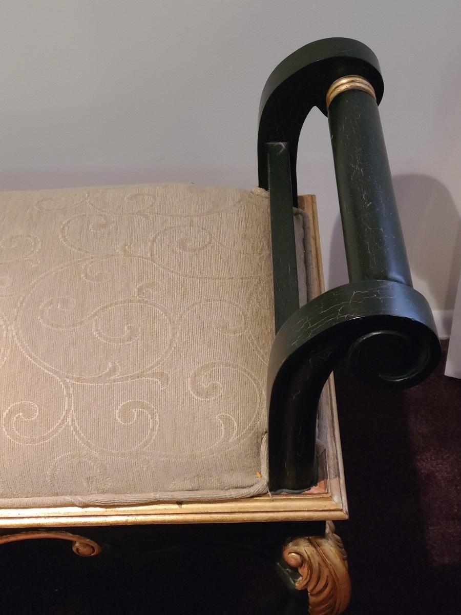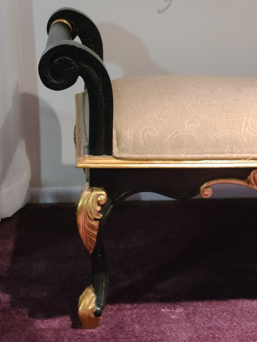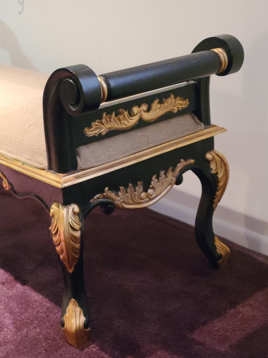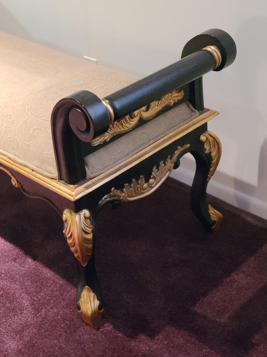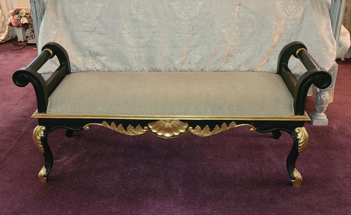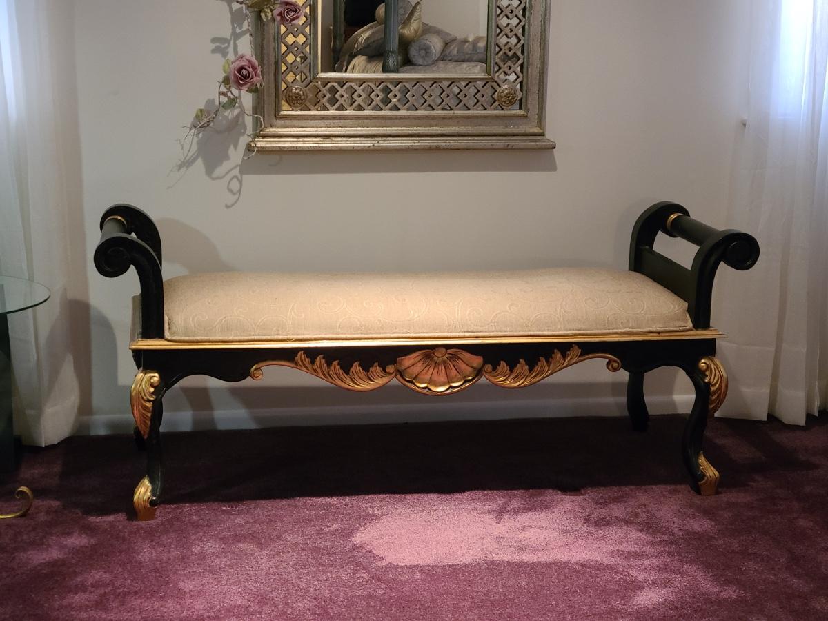 This piece is gorgeous and functional! Gold accents on black with character distressing. The cushioned seat is clean, soft, and has swirl accents. Perfect for any room in the home! Please see all pictures as they are the best representation of the items. The pictures show condition, measurements if taken, and what is included in the lot. Due to the large amount that we photograph and the time frame, we are not always able to take measurements. All items unless noted, are pre-owned and have been used. If you purchased furniture, you must bring help. We do not allow one person to carry large furniture out on their own. Bring help, tools and a truck for the safety of our client’s homes, and your personal safety. Company policy. Thank you.