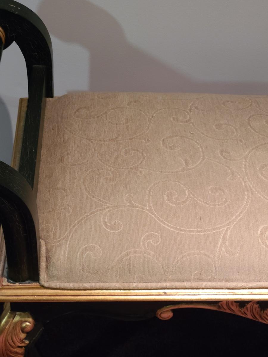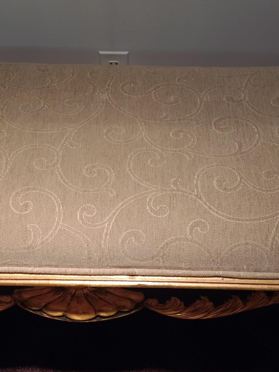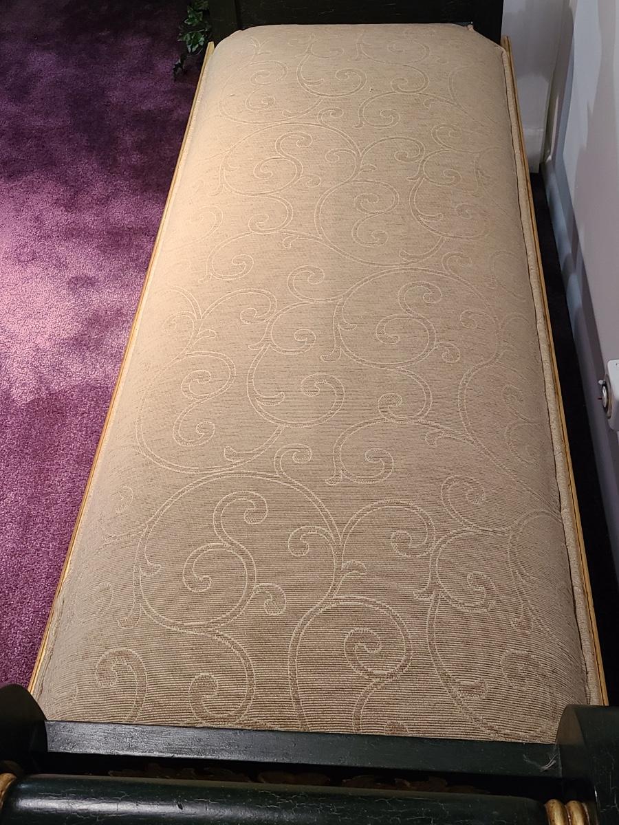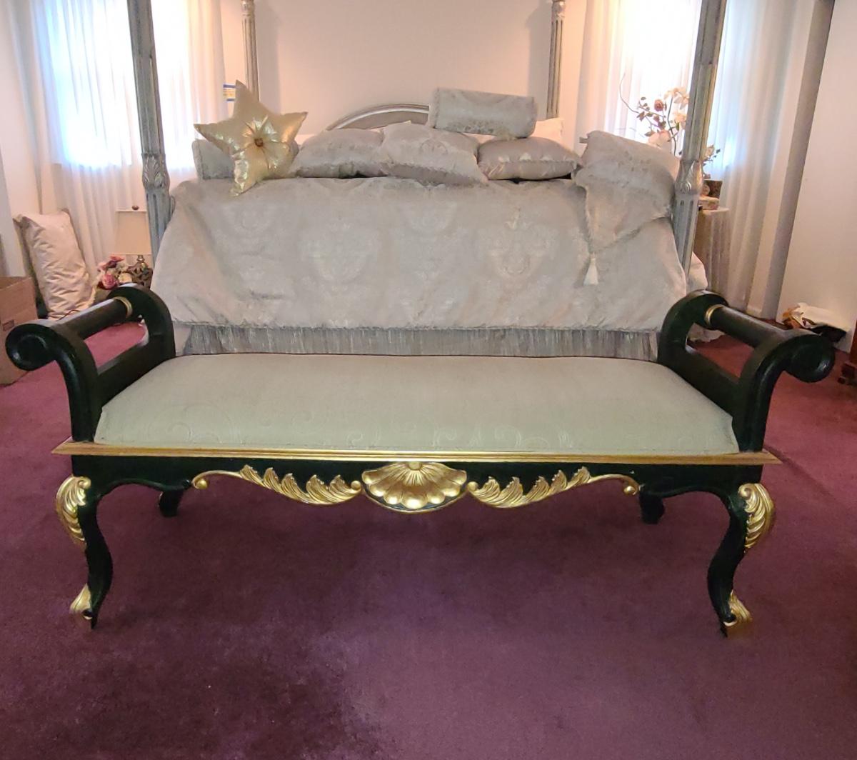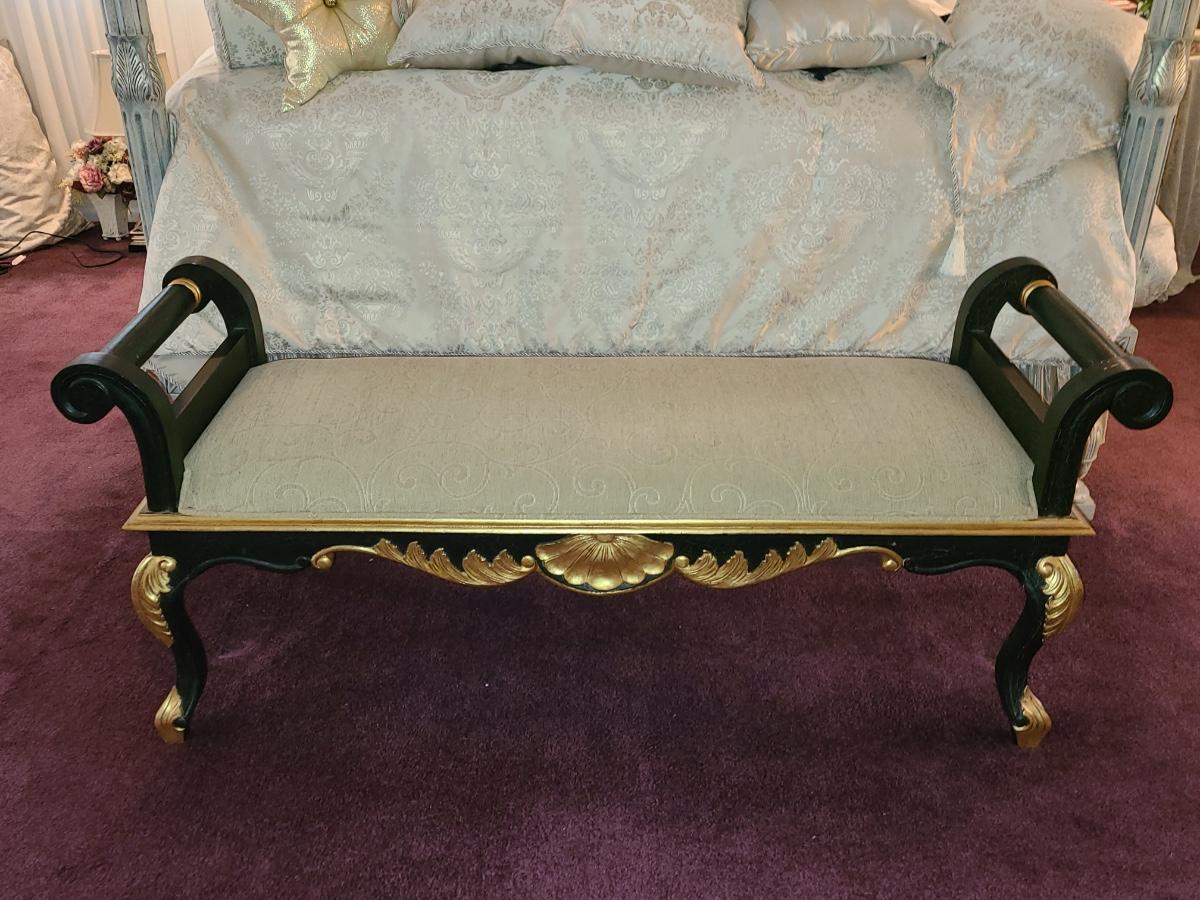This piece is gorgeous and functional! Gold accents on black with character distressing. The cushioned seat is clean, soft, and has swirl accents. Perfect for any room in the home! Please see all pictures as they are the best representation of the items. The pictures show condition, measurements if taken, and what is included in the lot. Due to the large amount that we photograph and the time frame, we are not always able to take measurements. All items unless noted, are pre-owned and have been used. If you purchased furniture, you must bring help. We do not allow one person to carry large furniture out on their own. Bring help, tools and a truck for the safety of our client’s homes, and your personal safety. Company policy. Thank you.