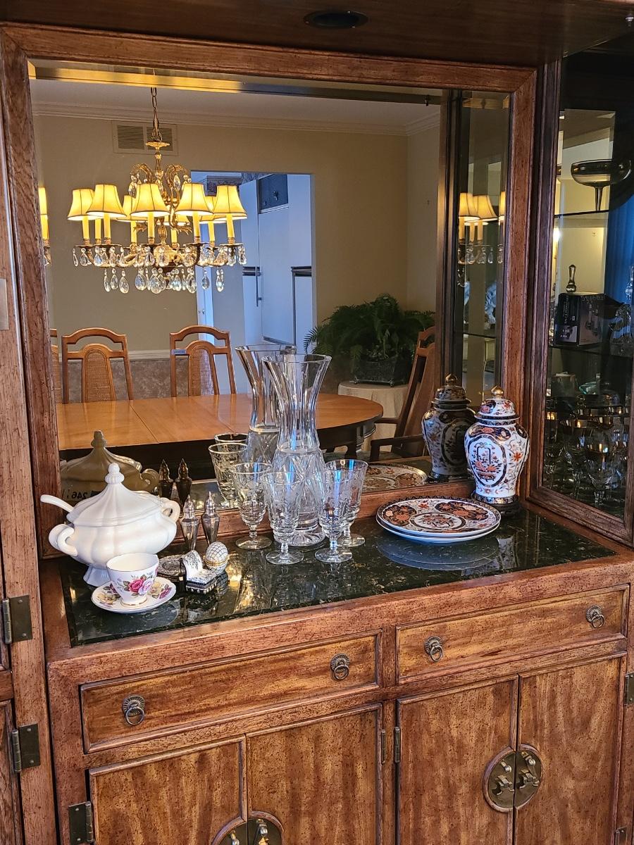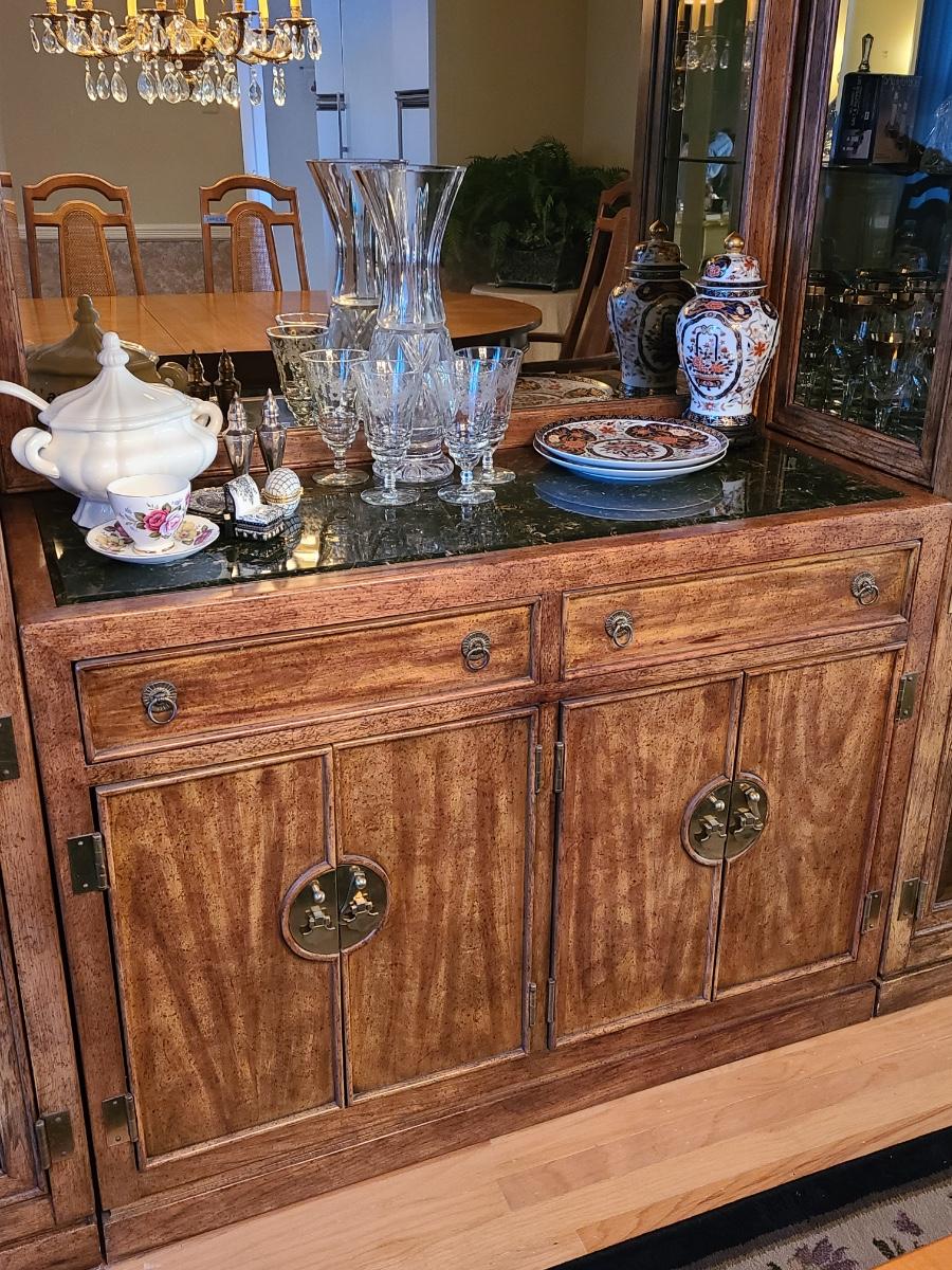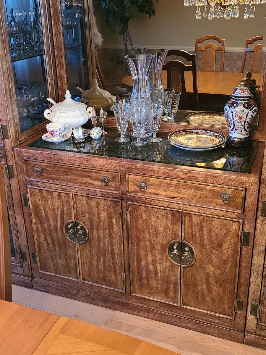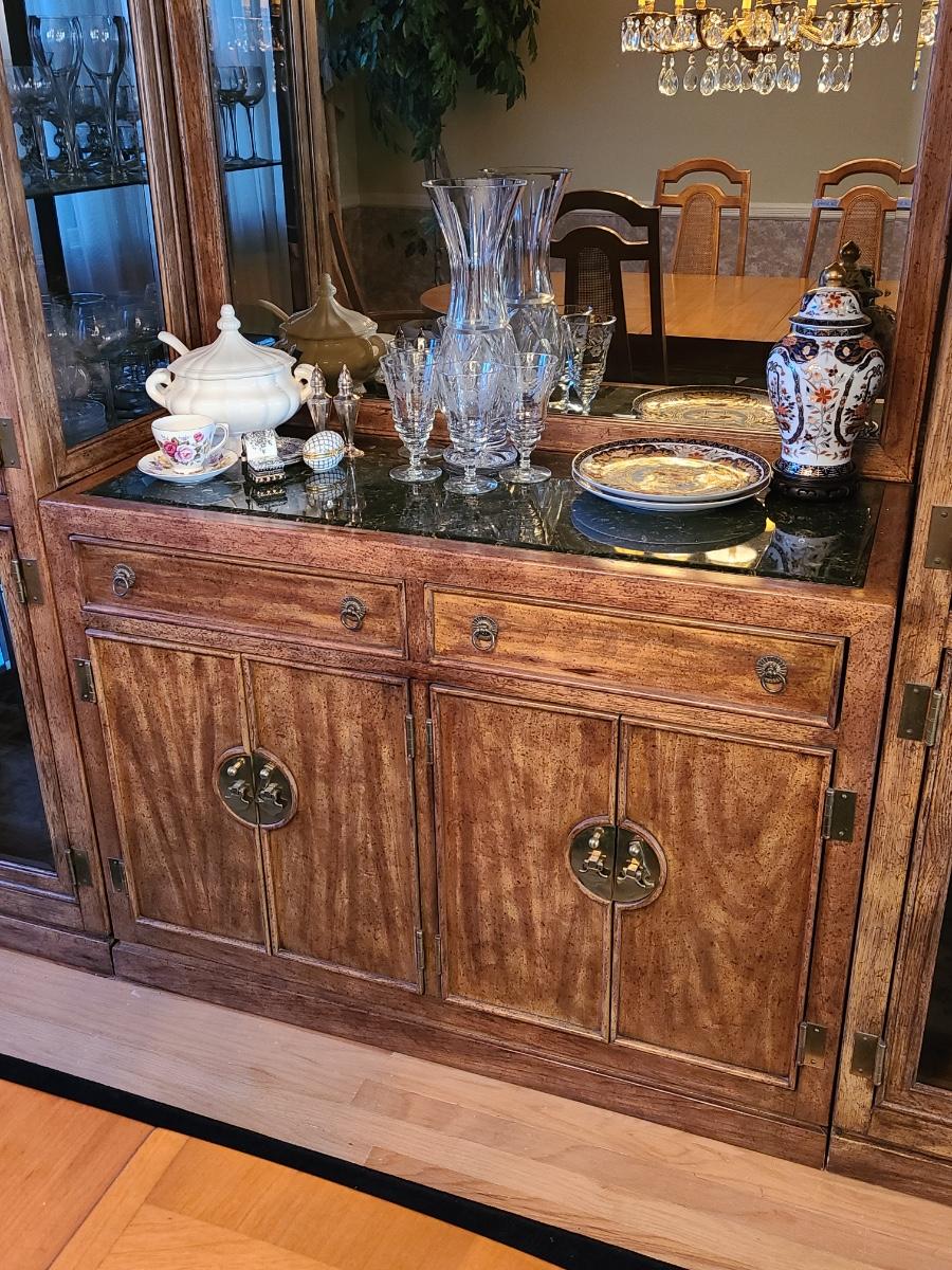 44Wx17Dx33 inches high. This piece is part of a unit that we are breaking up into three in case people want one part of the unit since they can stand alone. If you want all three, then you will need to bid on all three. This is for the center display chest that can serve as storage, a bar, or a media/entryway console. The top is black marble designed, and has two drawers and two cabinets underneath. The hardware is brass. The mirror is a separate piece behind it that is included with this piece which makes it perfect for an entryway! Glassware not included. Please see all pictures as they are the best representation of the items. The pictures show condition, measurements if taken, and what is included in the lot. Due to the large amount that we photograph and the time frame, we are not always able to take measurements. All items unless noted, are pre-owned and have been used. If you purchased furniture, you must bring help. We do not allow one person to carry large furniture out on their own. Bring help, tools and a truck for the safety of our client’s homes, and your personal safety. Company policy. Thank you.