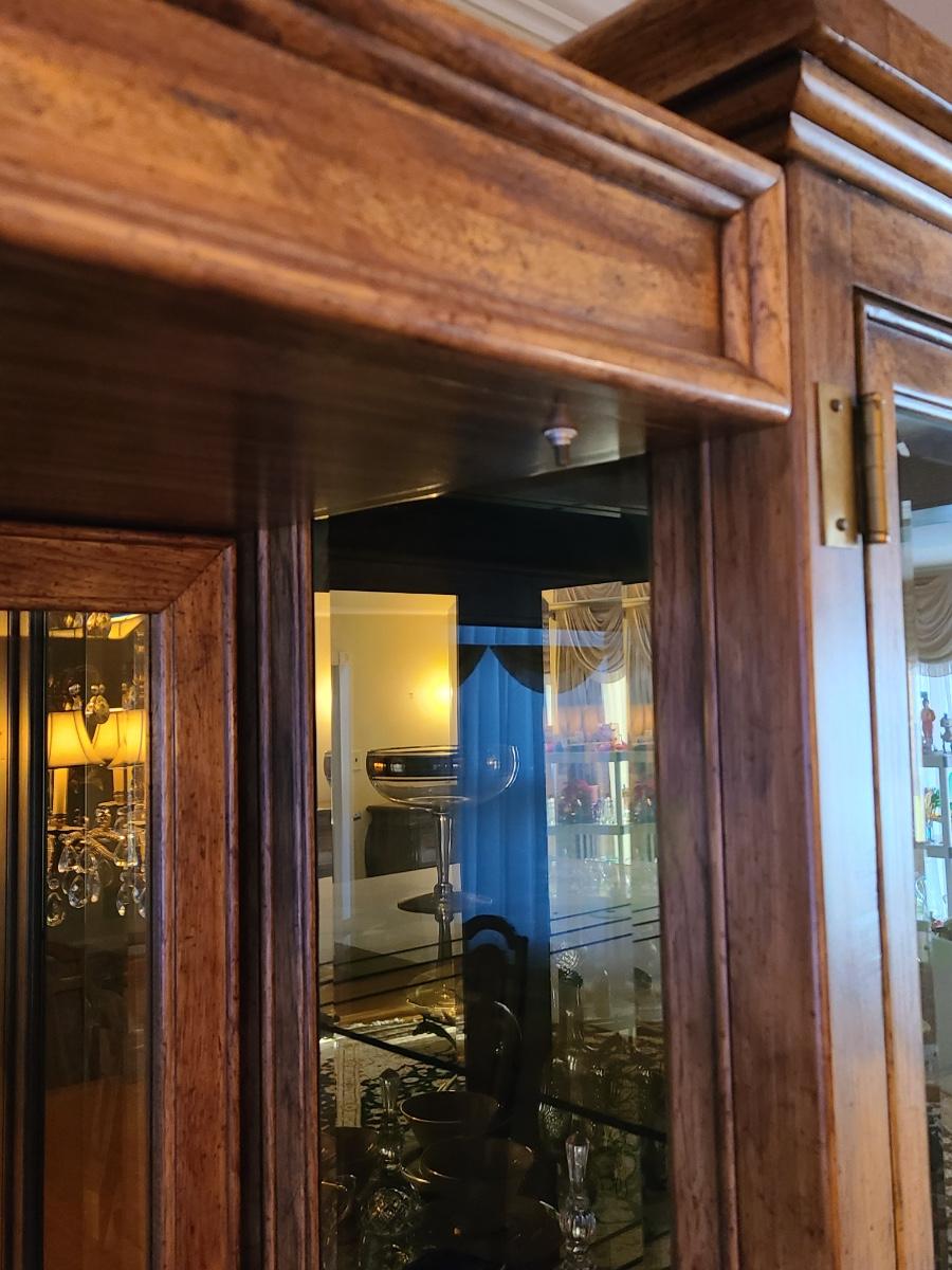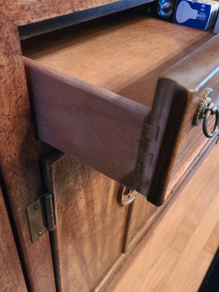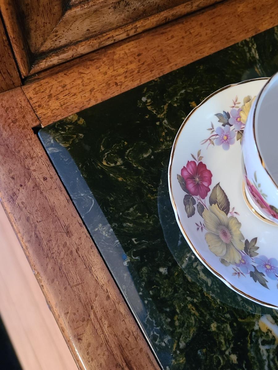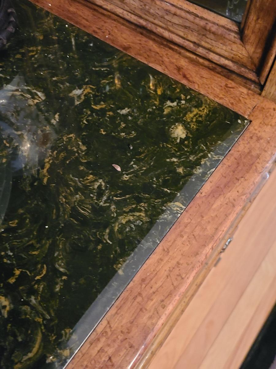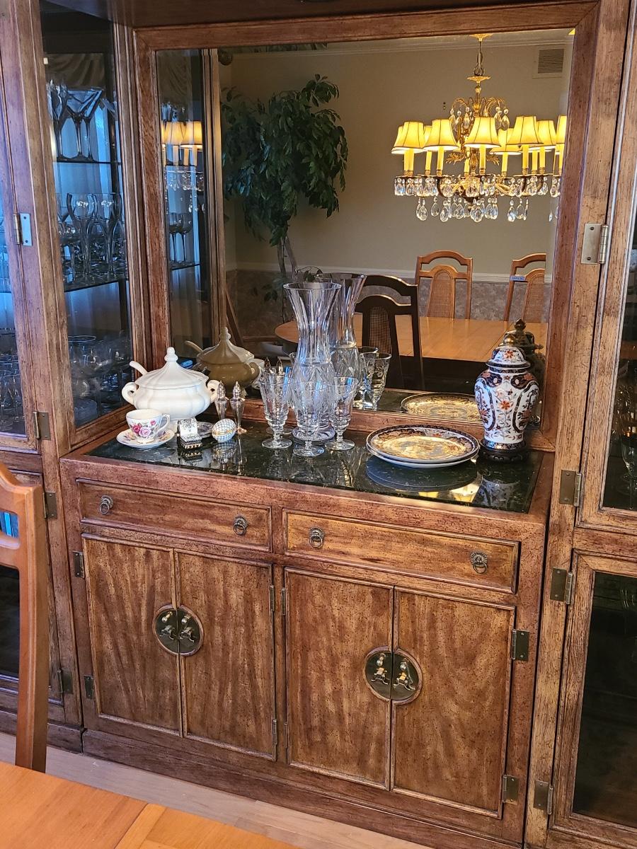 44Wx17Dx33 inches high. This piece is part of a unit that we are breaking up into three in case people want one part of the unit since they can stand alone. If you want all three, then you will need to bid on all three. This is for the center display chest that can serve as storage, a bar, or a media/entryway console. The top is black marble designed, and has two drawers and two cabinets underneath. The hardware is brass. The mirror is a separate piece behind it that is included with this piece which makes it perfect for an entryway! Glassware not included. Please see all pictures as they are the best representation of the items. The pictures show condition, measurements if taken, and what is included in the lot. Due to the large amount that we photograph and the time frame, we are not always able to take measurements. All items unless noted, are pre-owned and have been used. If you purchased furniture, you must bring help. We do not allow one person to carry large furniture out on their own. Bring help, tools and a truck for the safety of our client’s homes, and your personal safety. Company policy. Thank you.