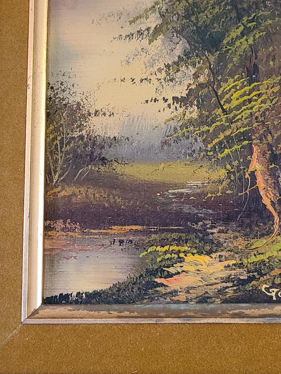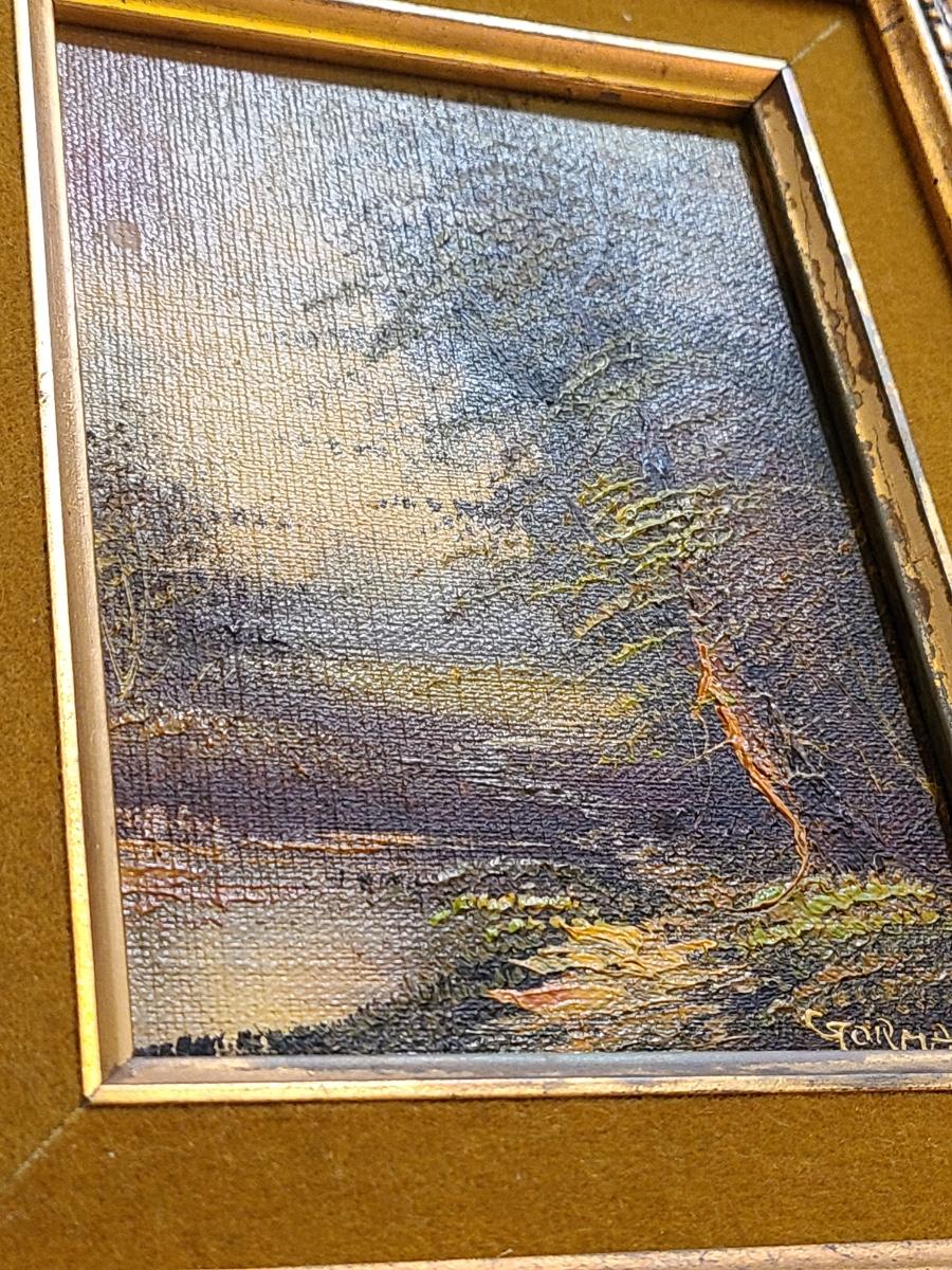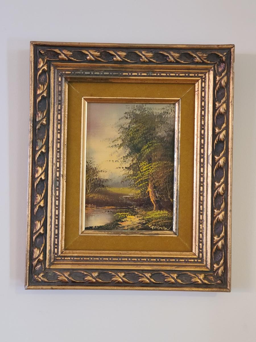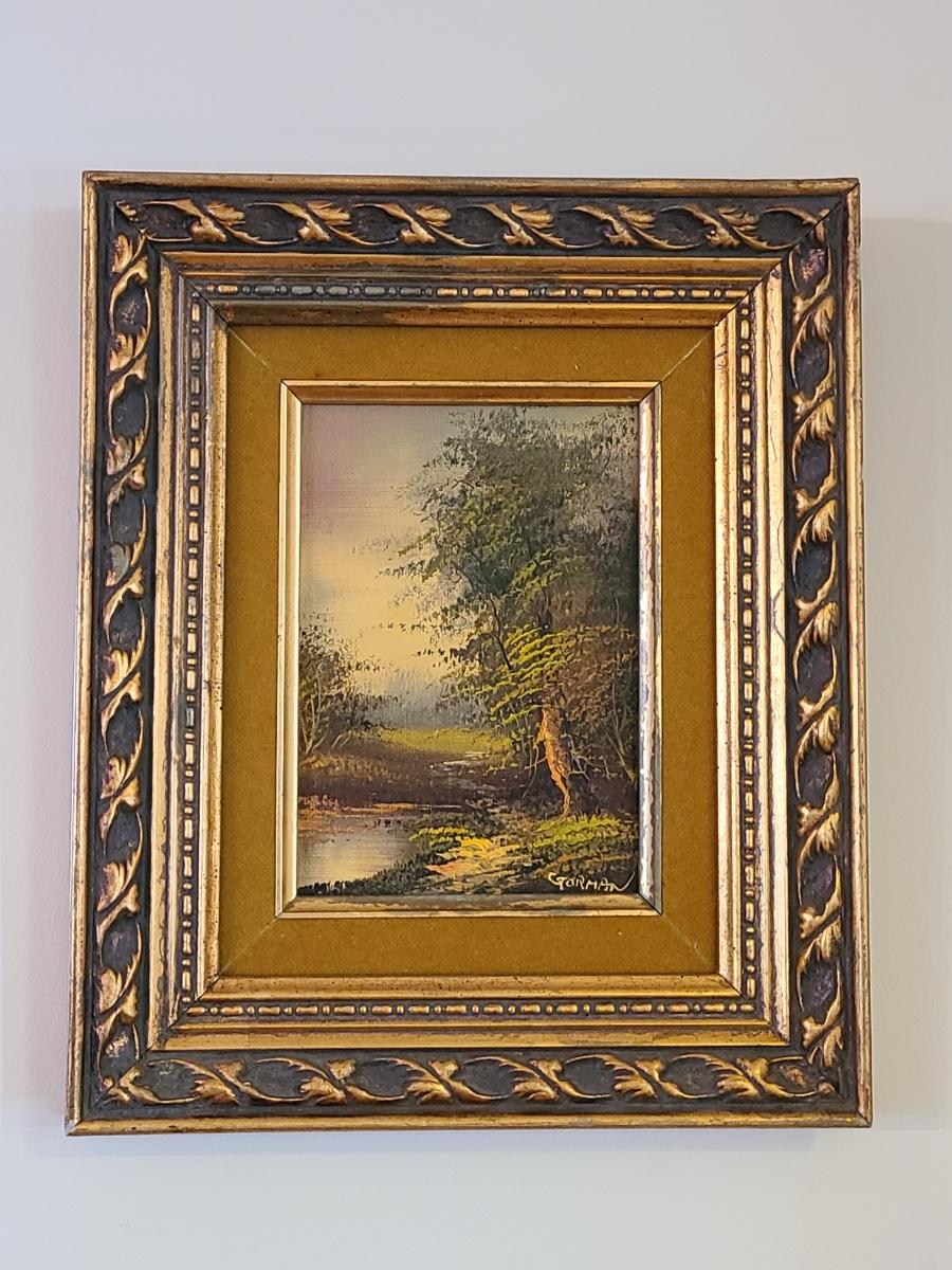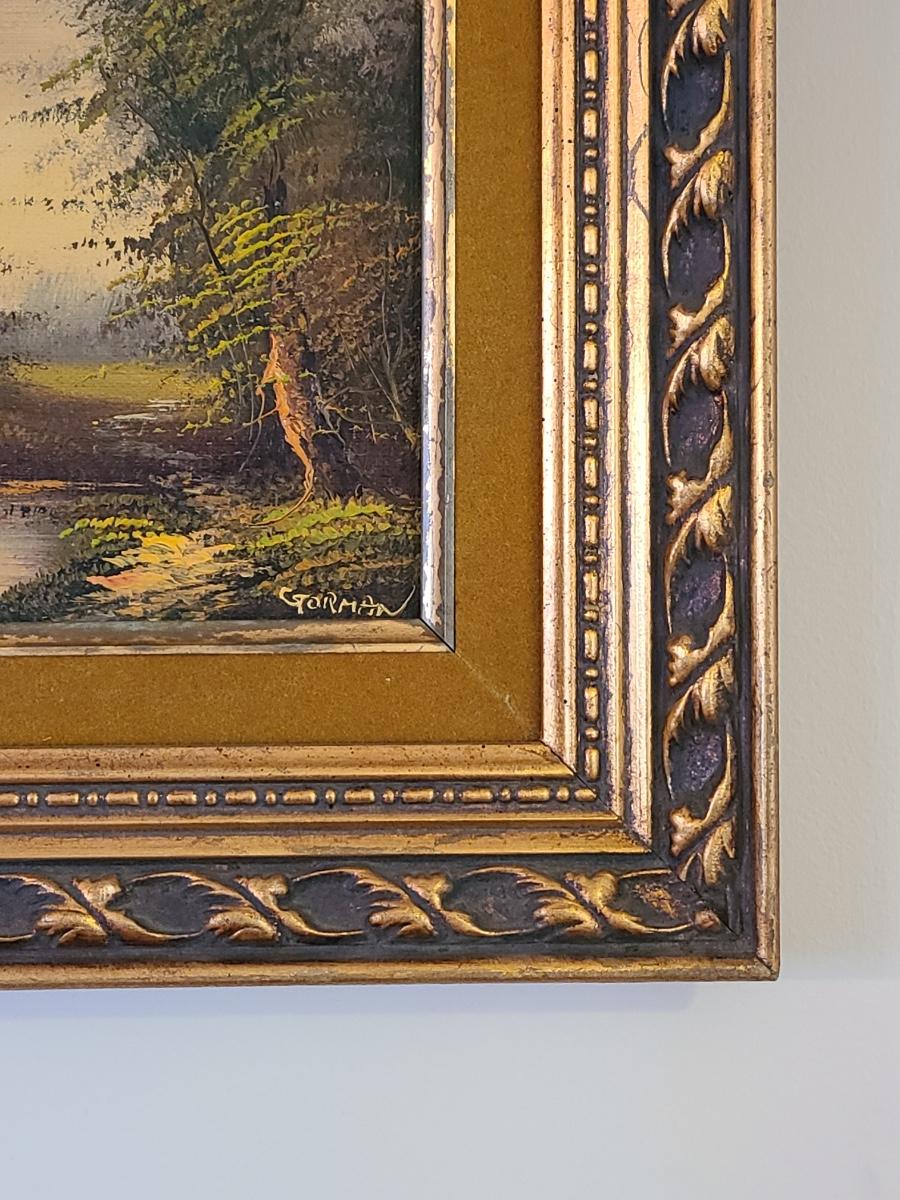 This petite 10x12 inch painting is signed "Gorman" and is painted on wood. This looks to be oils. Please see the close ups of the brush strokes to make a determination. This gives off a beautiful glow from the landscape with a display light shining on. Please see all pictures as they are the best representation of the items. The pictures show condition, measurements if taken, and what is included in the lot. Due to the large amount that we photograph and the time frame, we are not always able to take measurements. All items unless noted, are pre-owned and have been used. If you purchased furniture, you must bring help. We do not allow one person to carry large furniture out on their own. Bring help, tools and a truck for the safety of our client’s homes, and your personal safety. Company policy. Thank you.