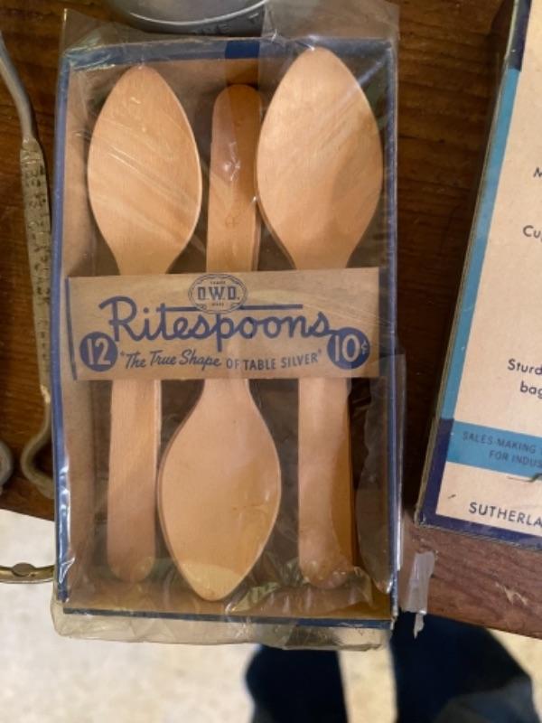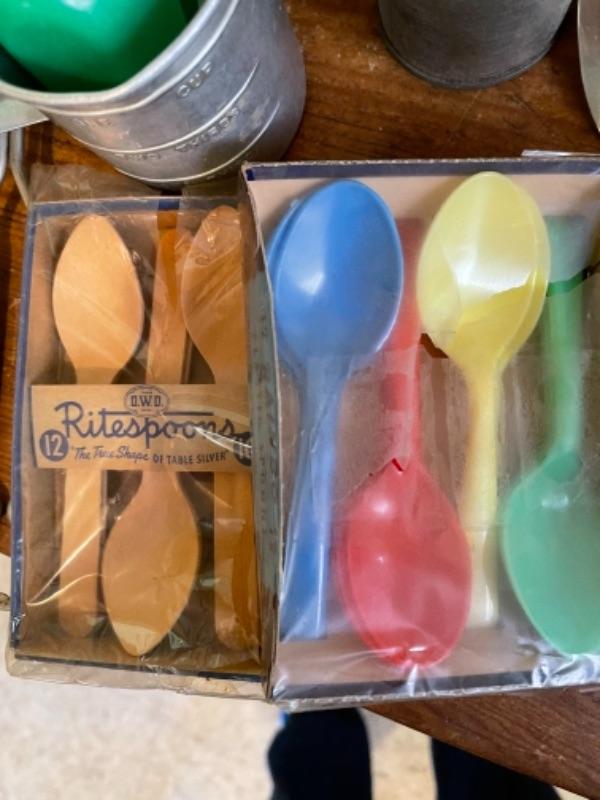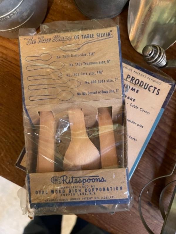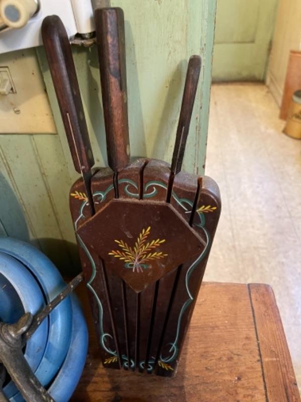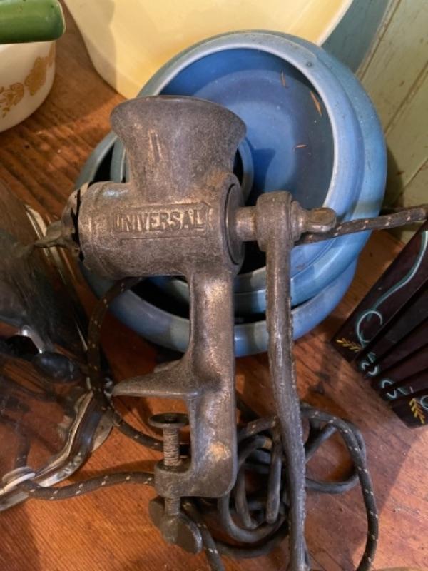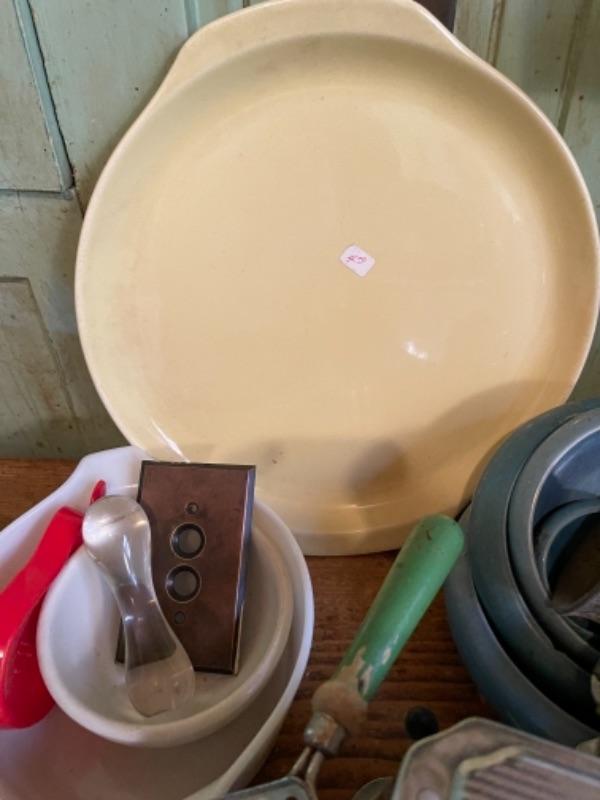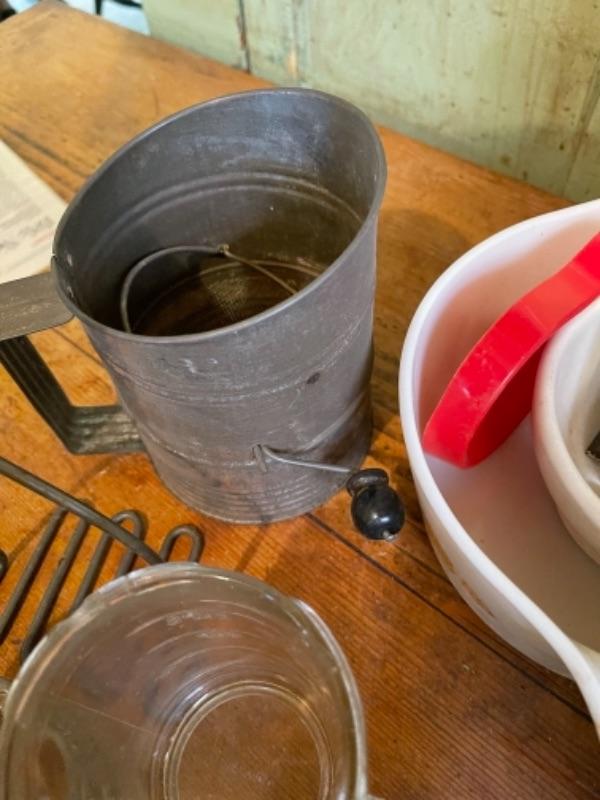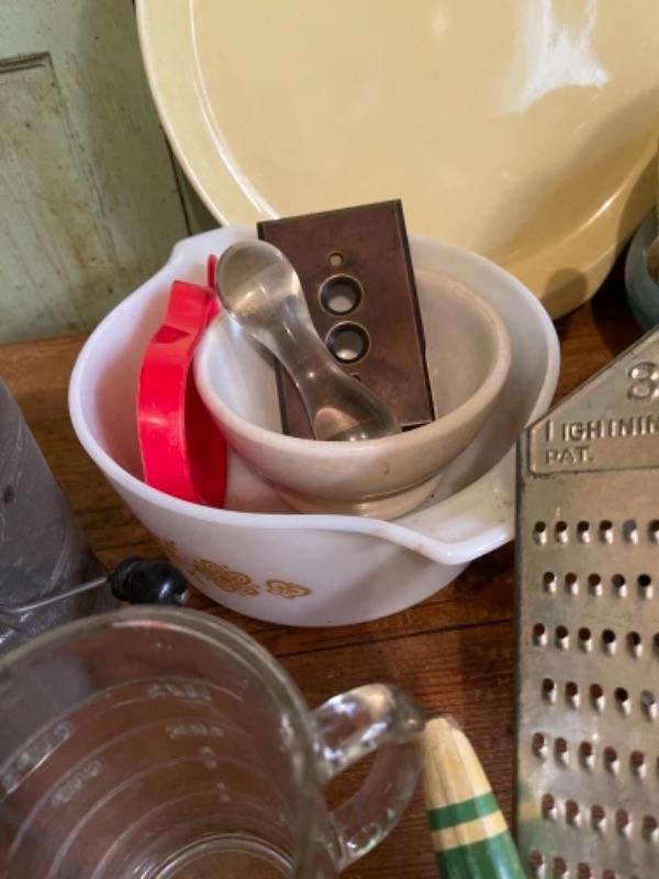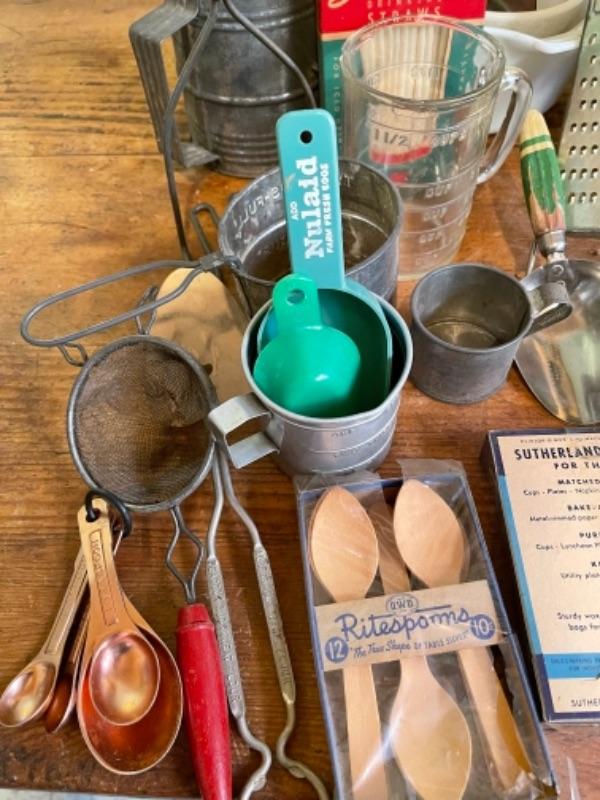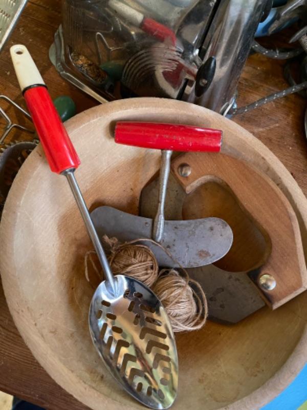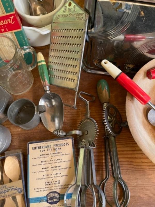 Lot 66K. Vintage kitchenware“”measuring cup, sifter, hand-held beaters, Waring blender, graters, mid-century salad tongs, wall-mounted knife block, platter, chopping blades, wooden bowl, blue ceramic bowls--$95