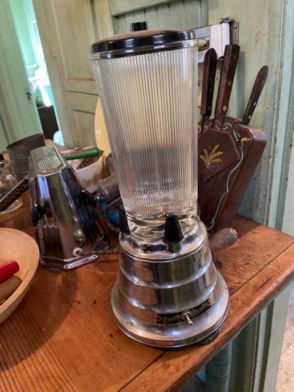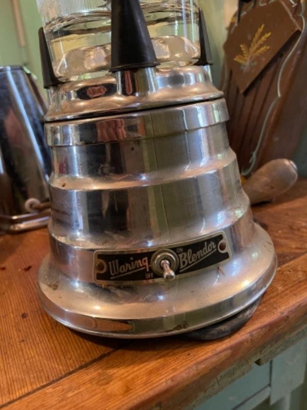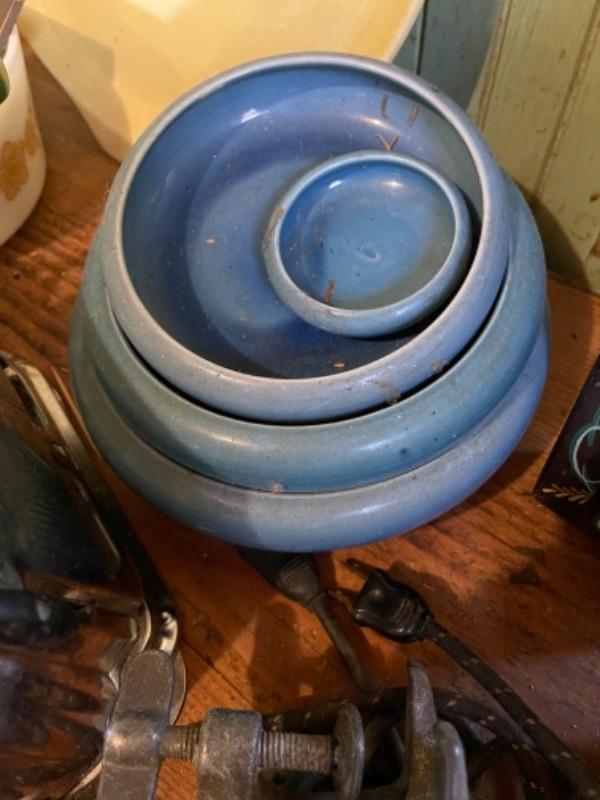 Lot 66K. Vintage kitchenware- Waring blender, graters, mid-century salad tongs, wooden bowl, blue ceramic bowls, etc--$95