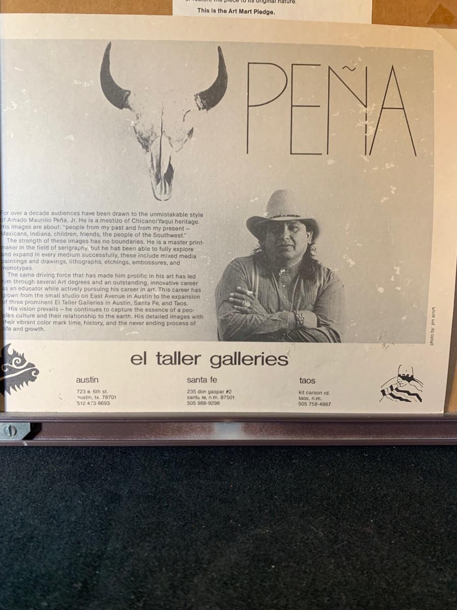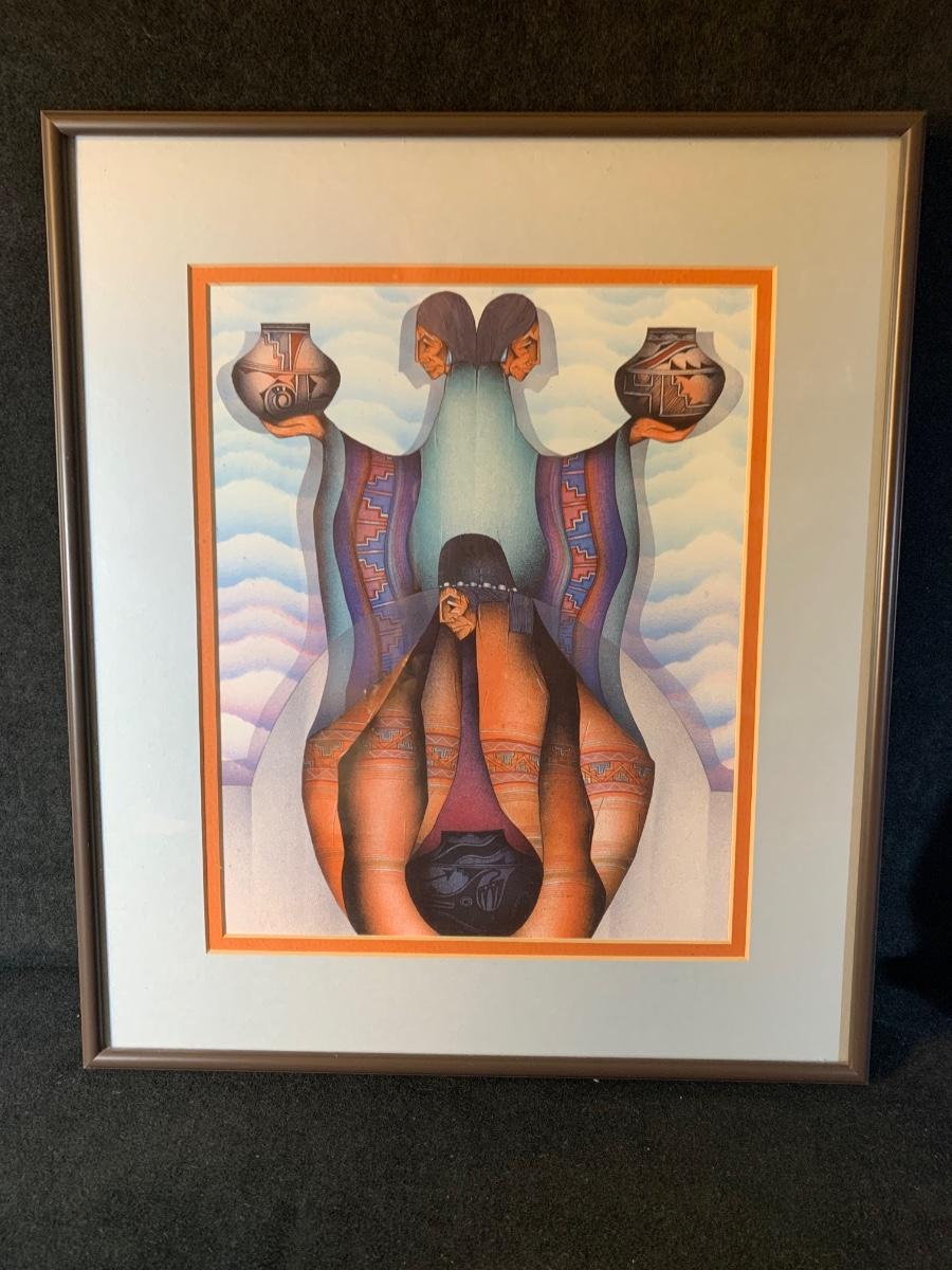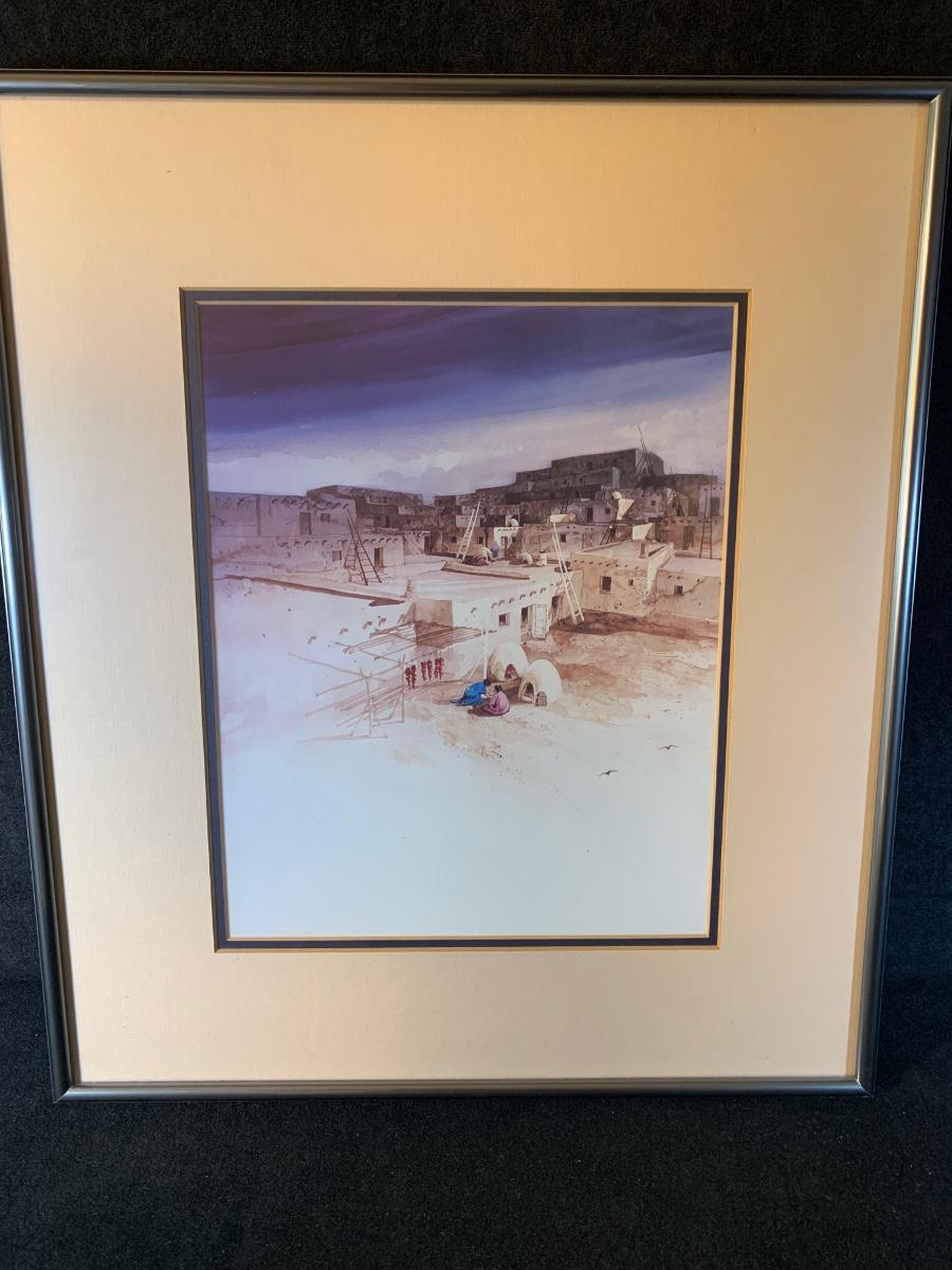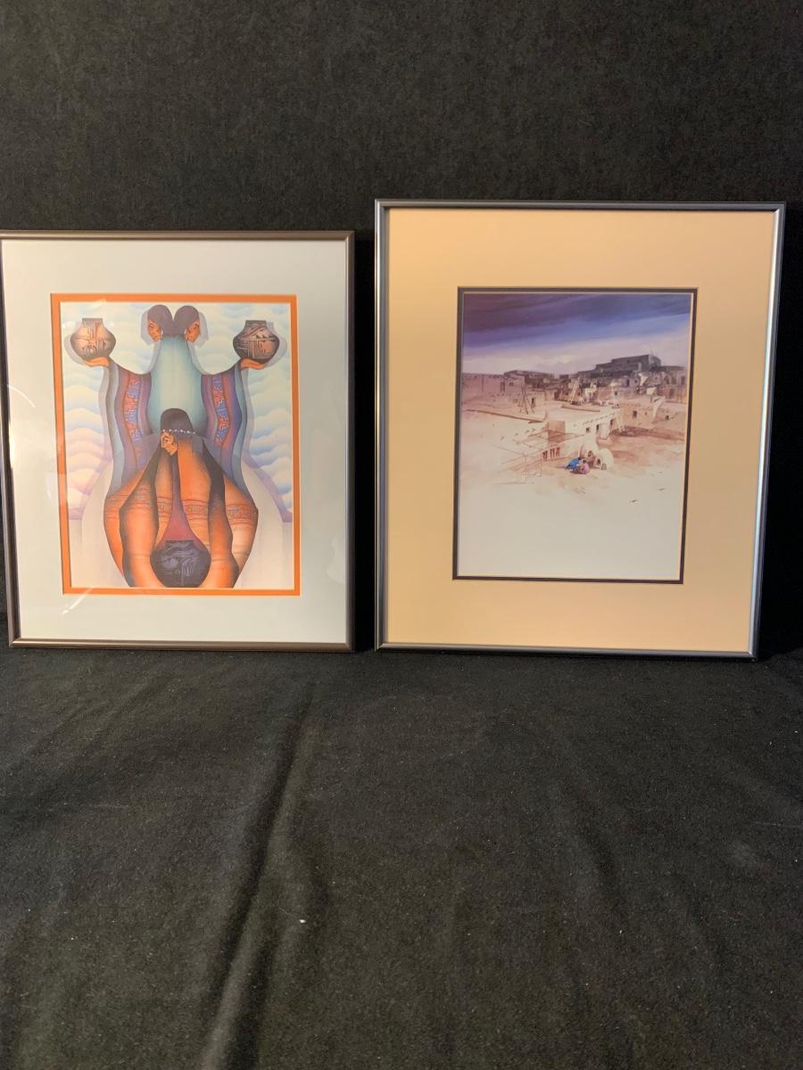 Framed American Indian print measures 12 1/4" x 14 1/4". Framed Pueblo Village print measures 13 3/8" x 15 1/4".