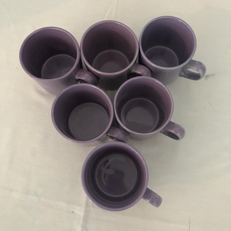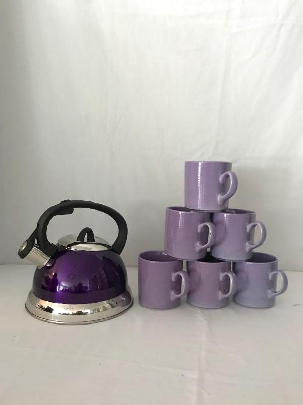 Here’s a lot just for you! They say purple is the color of royalty. Bright purple tea kettle that just looks great. We’ve paired the kettle with six lightly textured mugs for your royal friends. One mug appears to have a chip that occurred during manufacturing and has glaze covering it. See photos. No shipping.