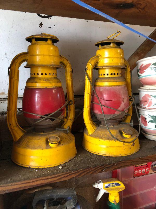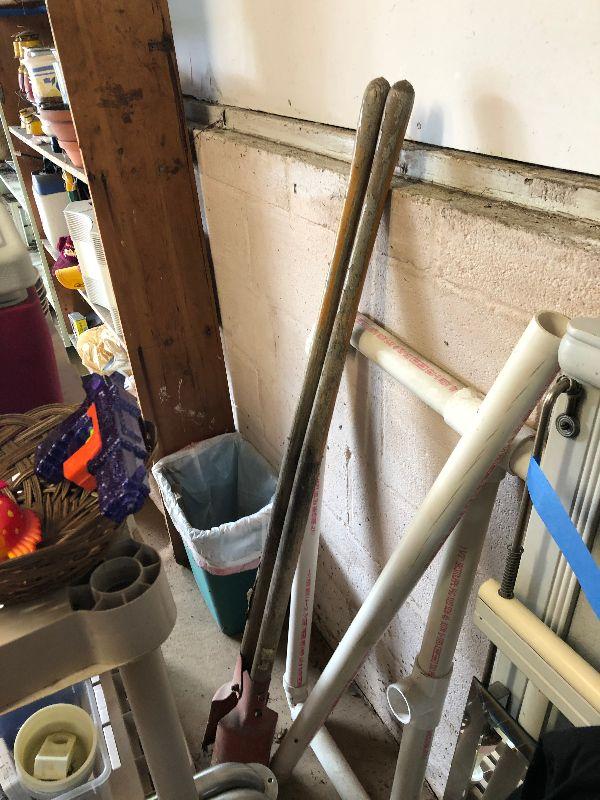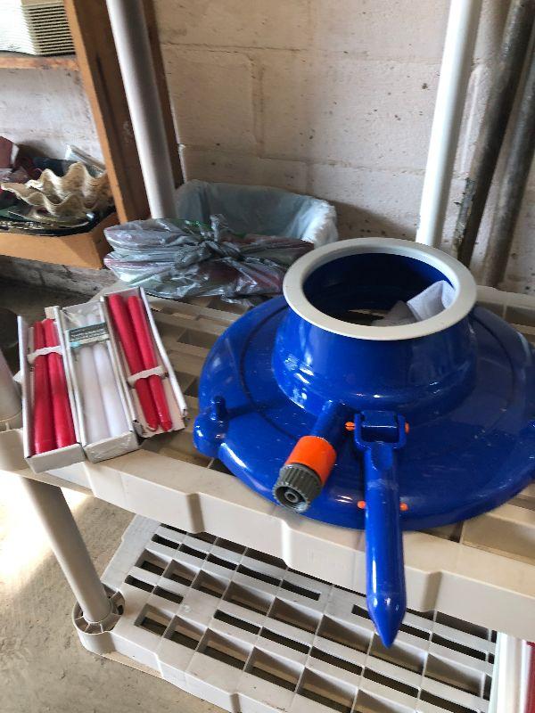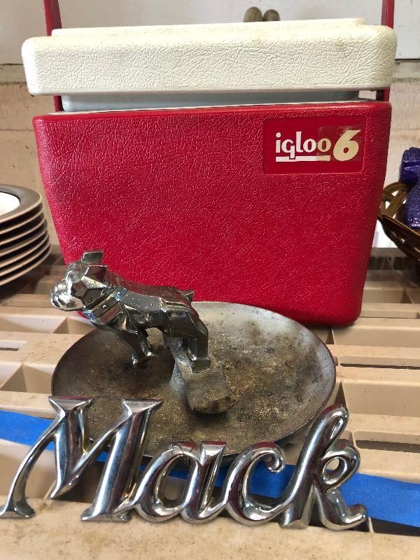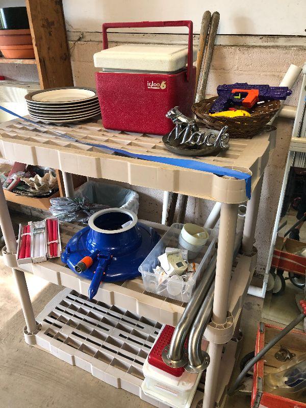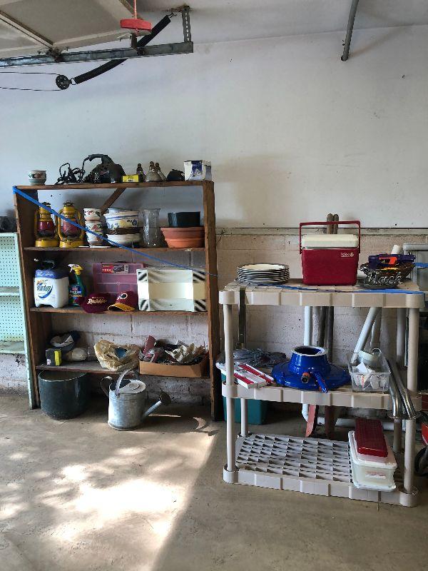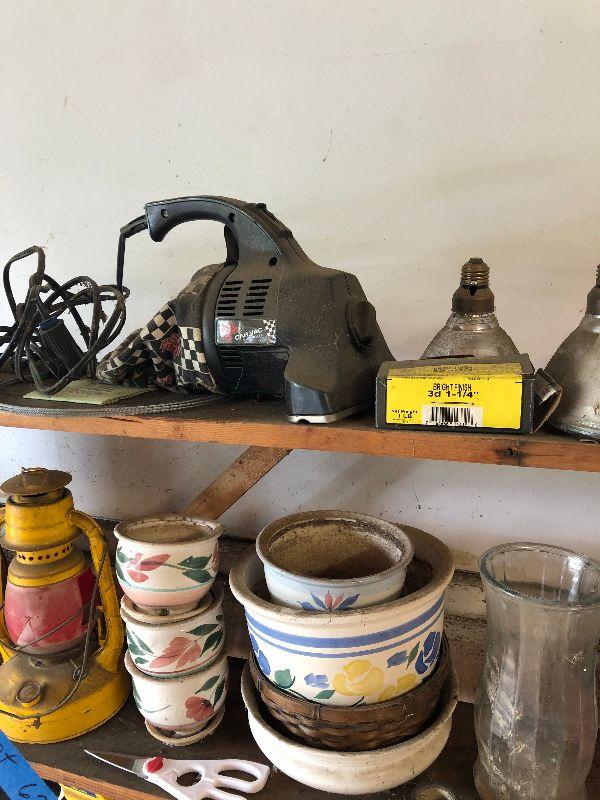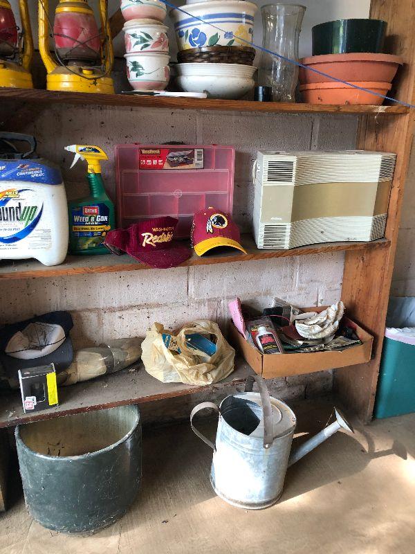 Metal watering can, paint, dishes, pots/planters, cooler, roundup and other miscellaneous items.