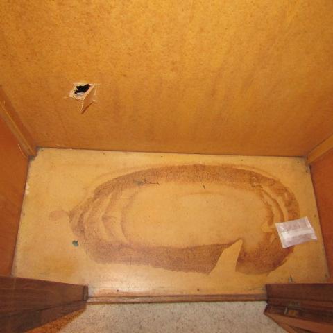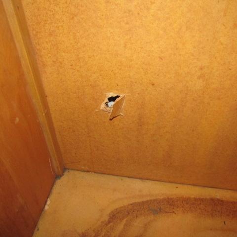 THERE IS A GOLF BALL SIZE HOLE IN THE BACK WALL AND THE FLOOR IS STAINED