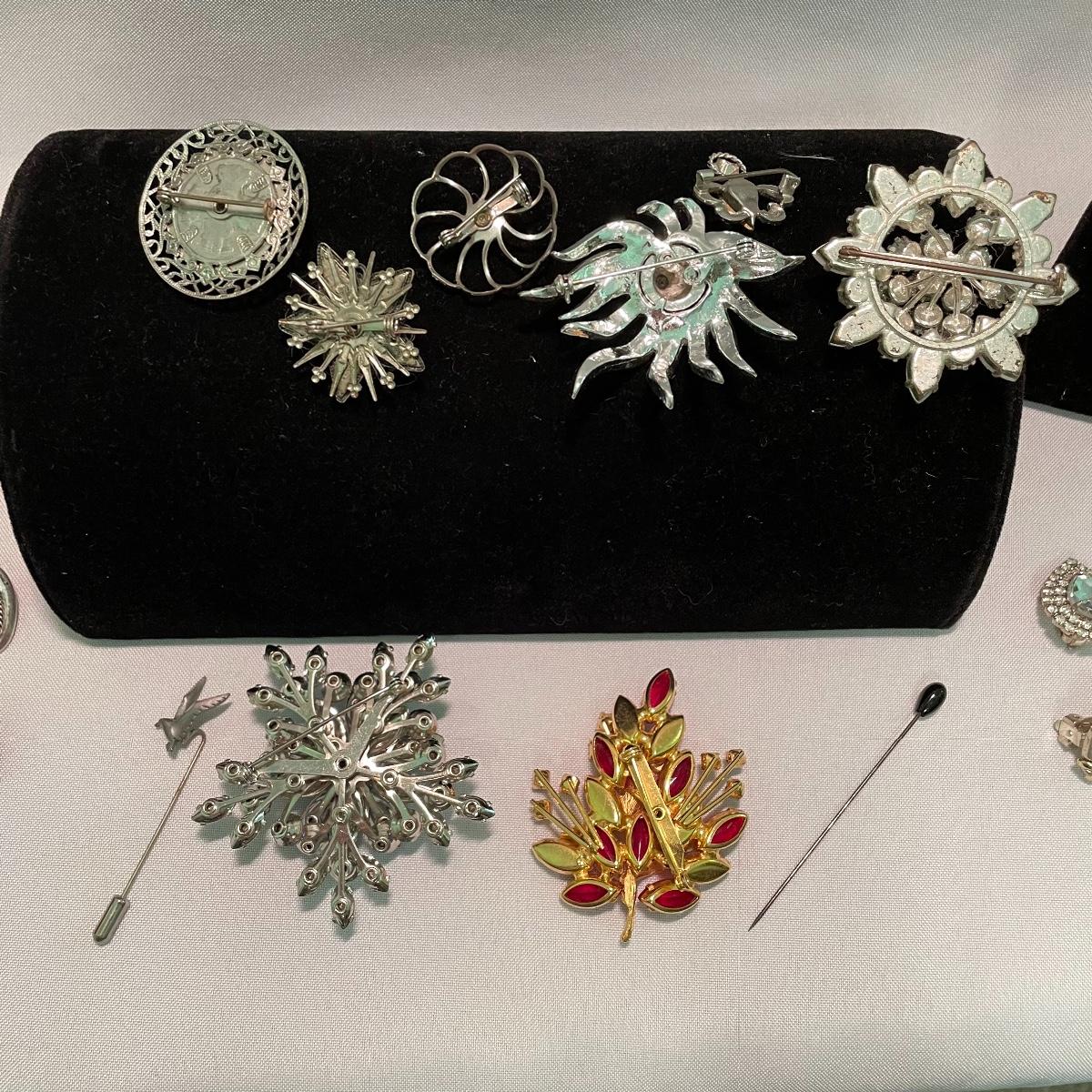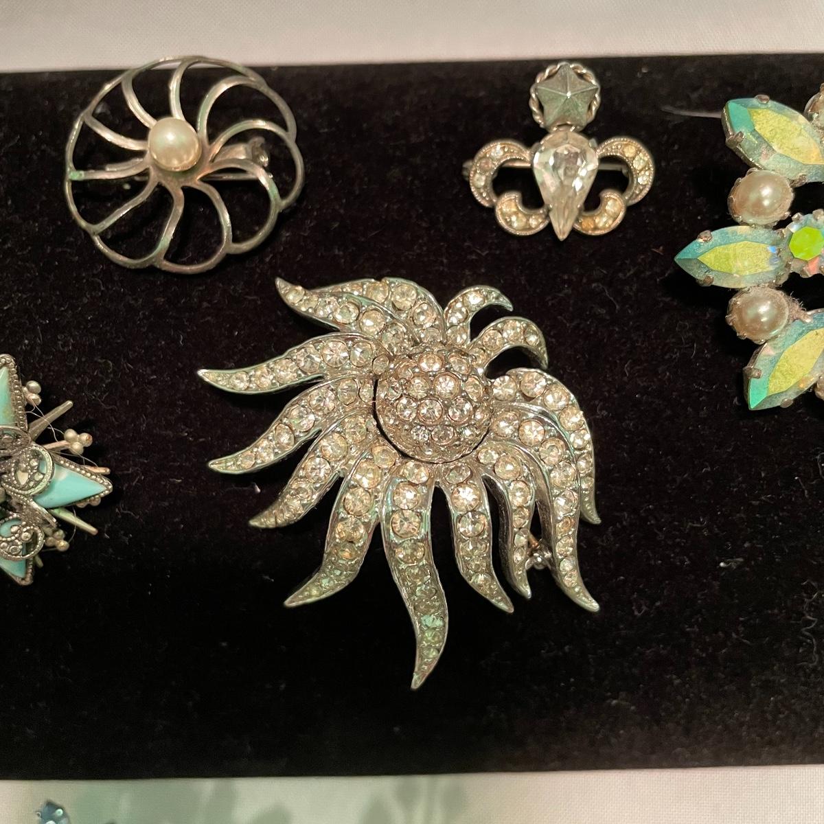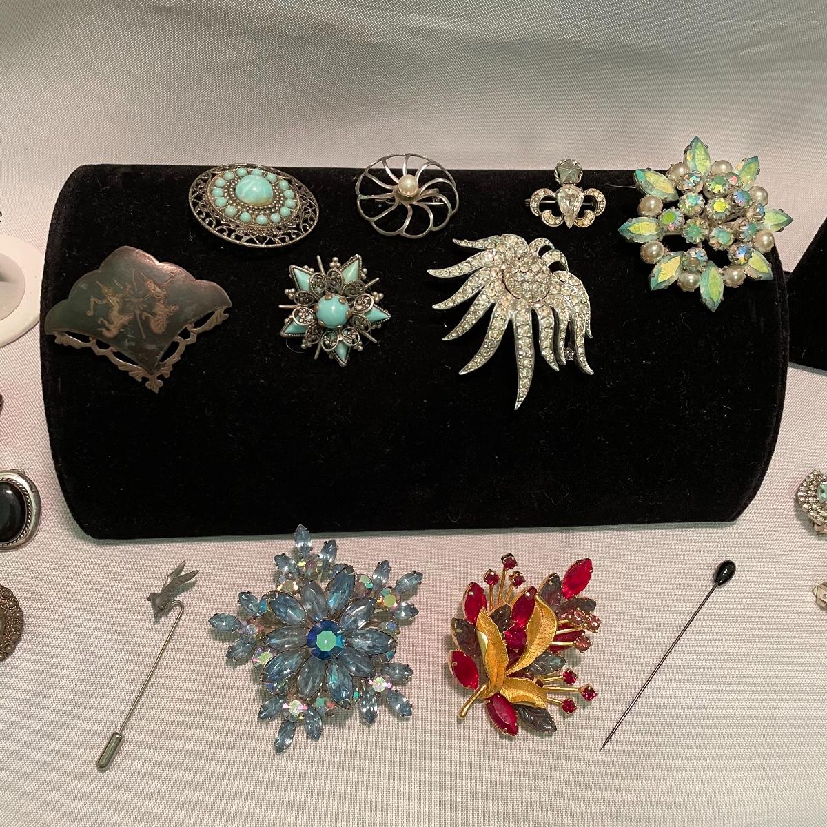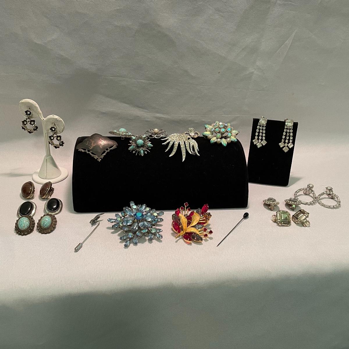 Here’s a great mix of subtle and bold to highlight your look. Lot features nine brooches including a fascinating sterling piece. Lot also includes eight pairs of clip earrings and two delicate looking pins. Shipping available.