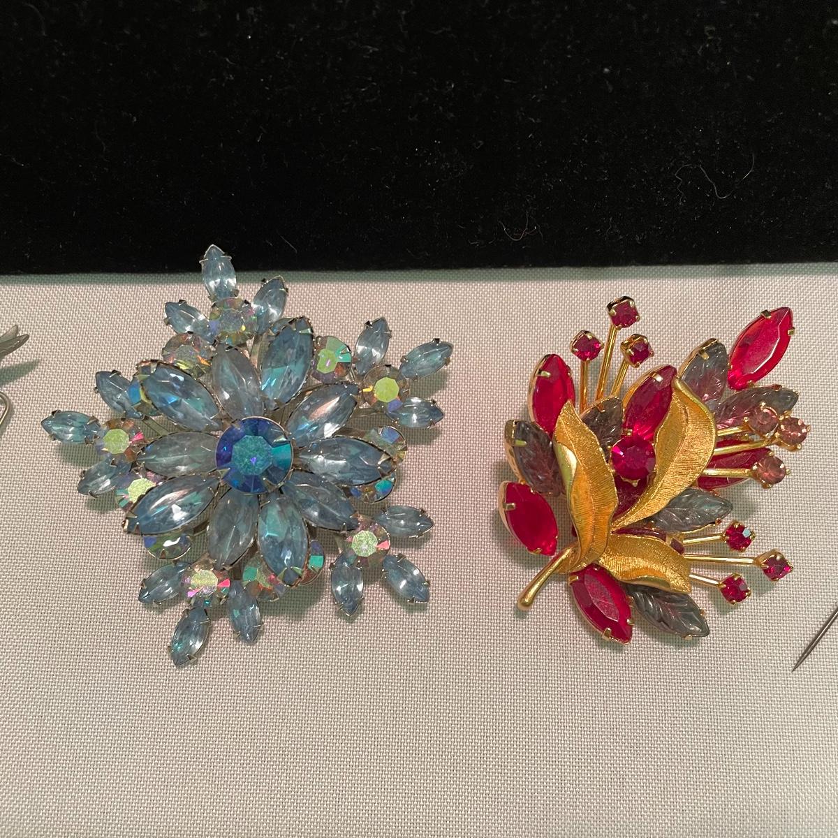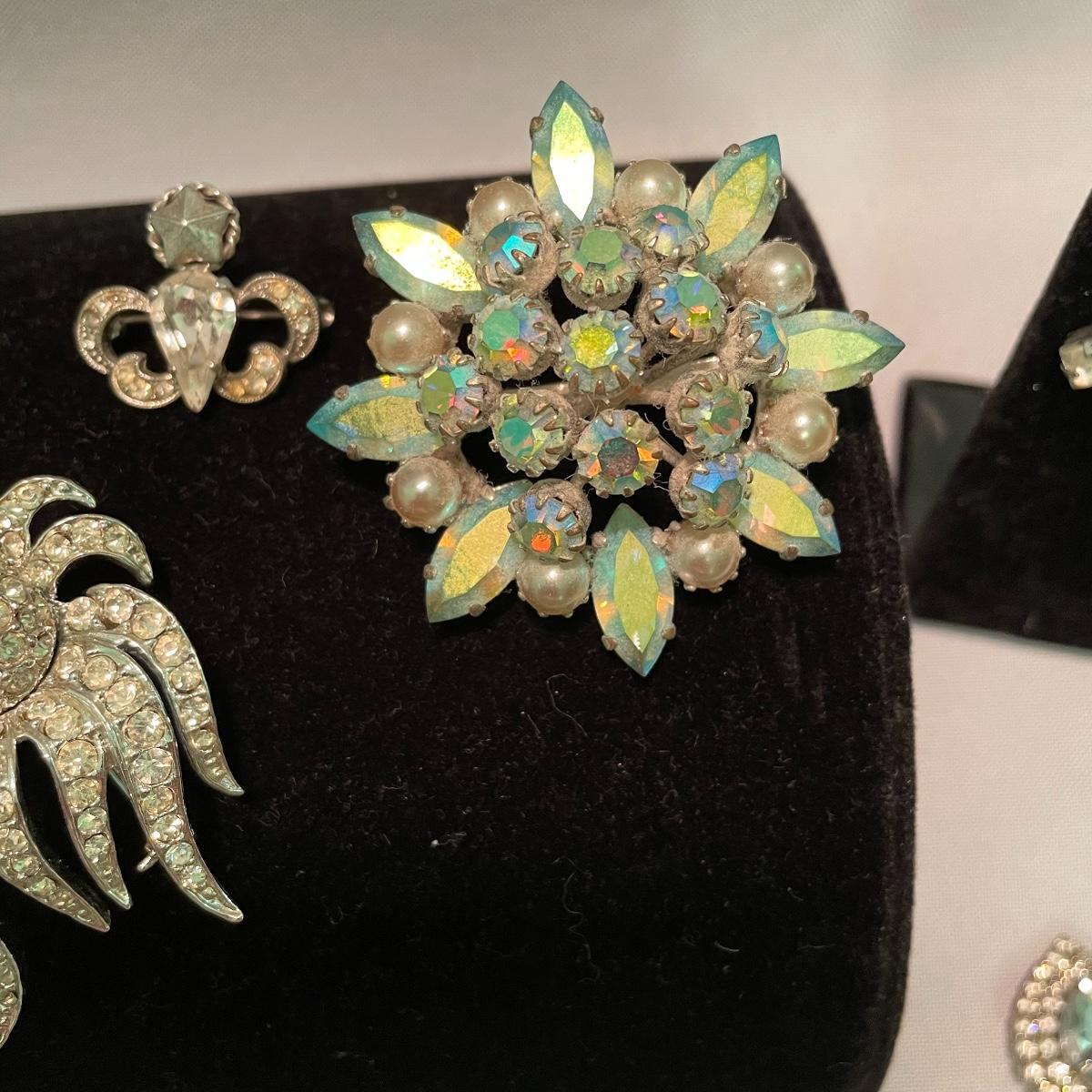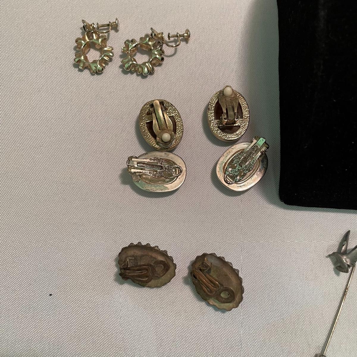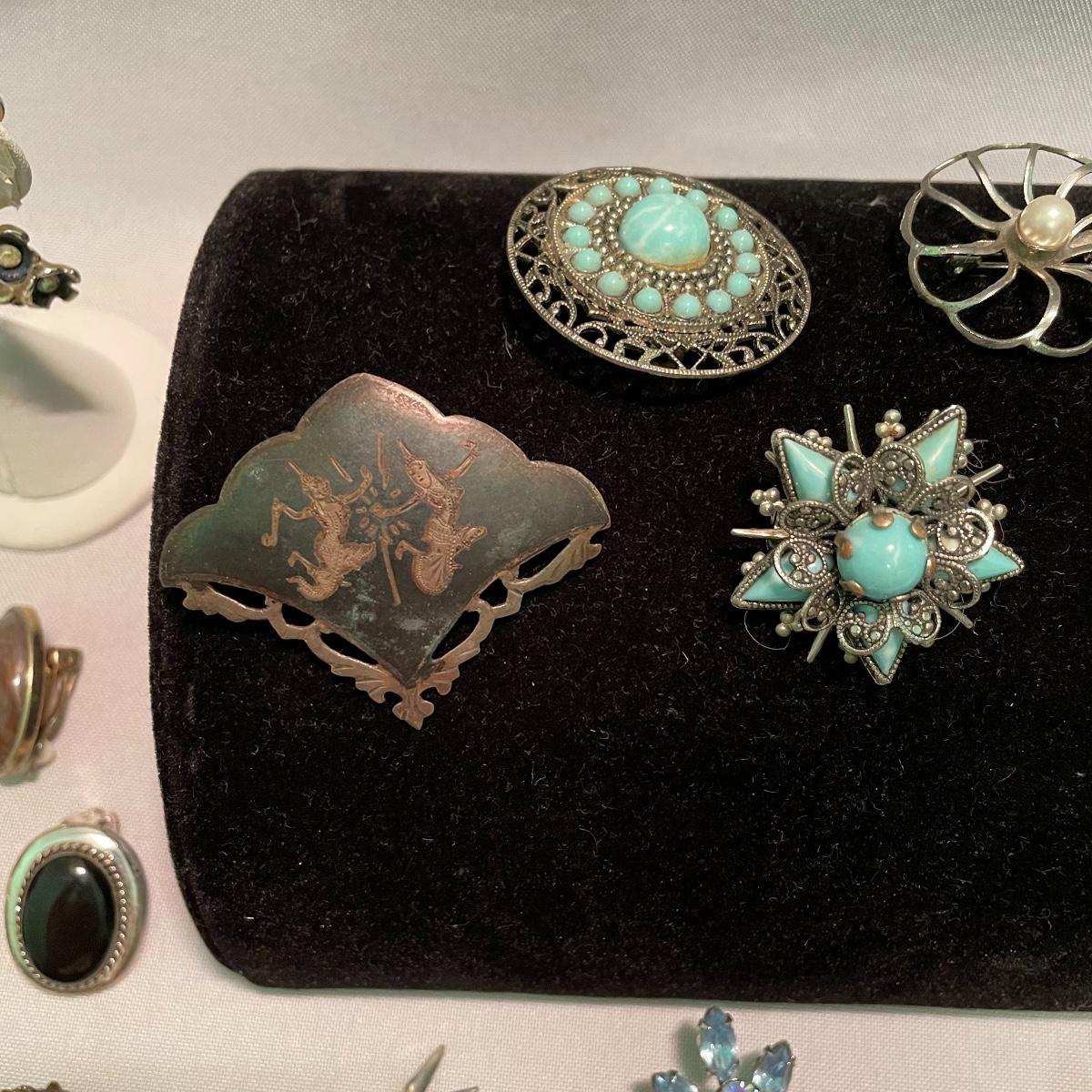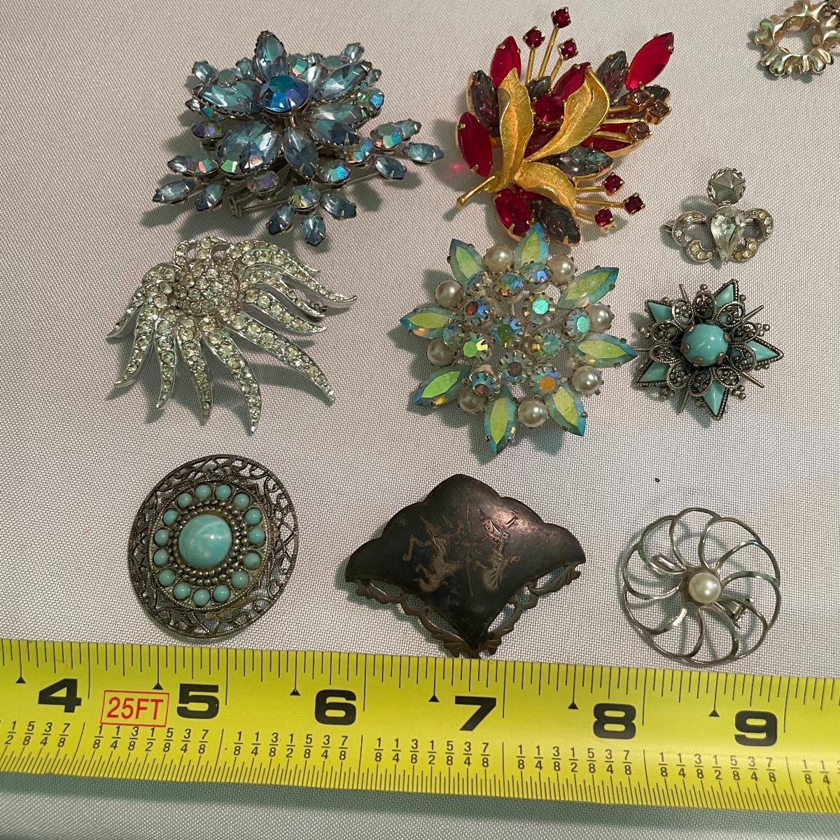 Here’s a great mix of subtle and bold to highlight your look. Lot features nine brooches including a fascinating sterling piece. Lot also includes eight pairs of clip earrings and two delicate looking pins. Shipping available.