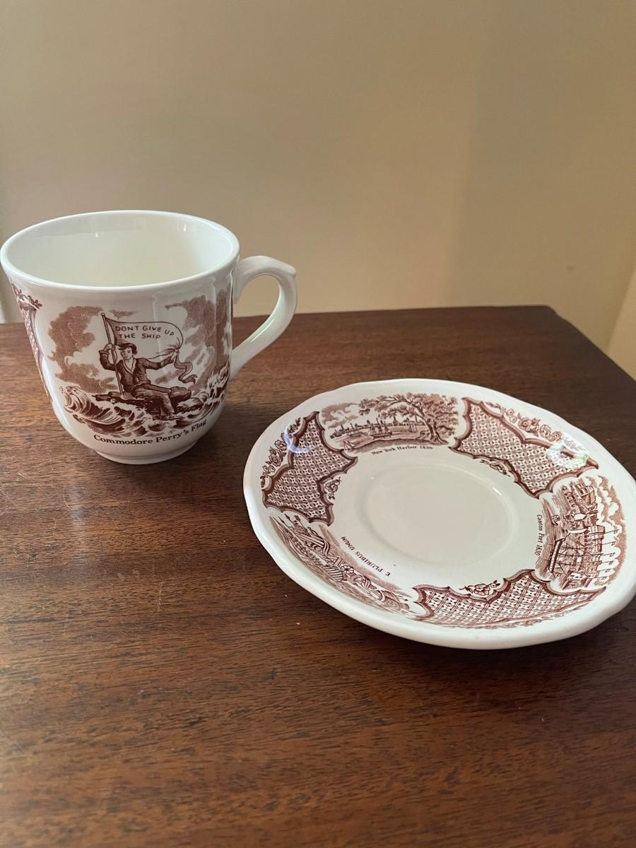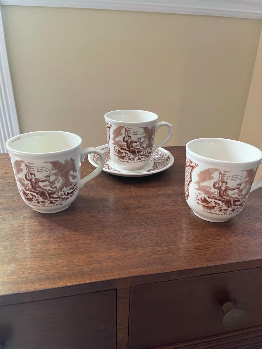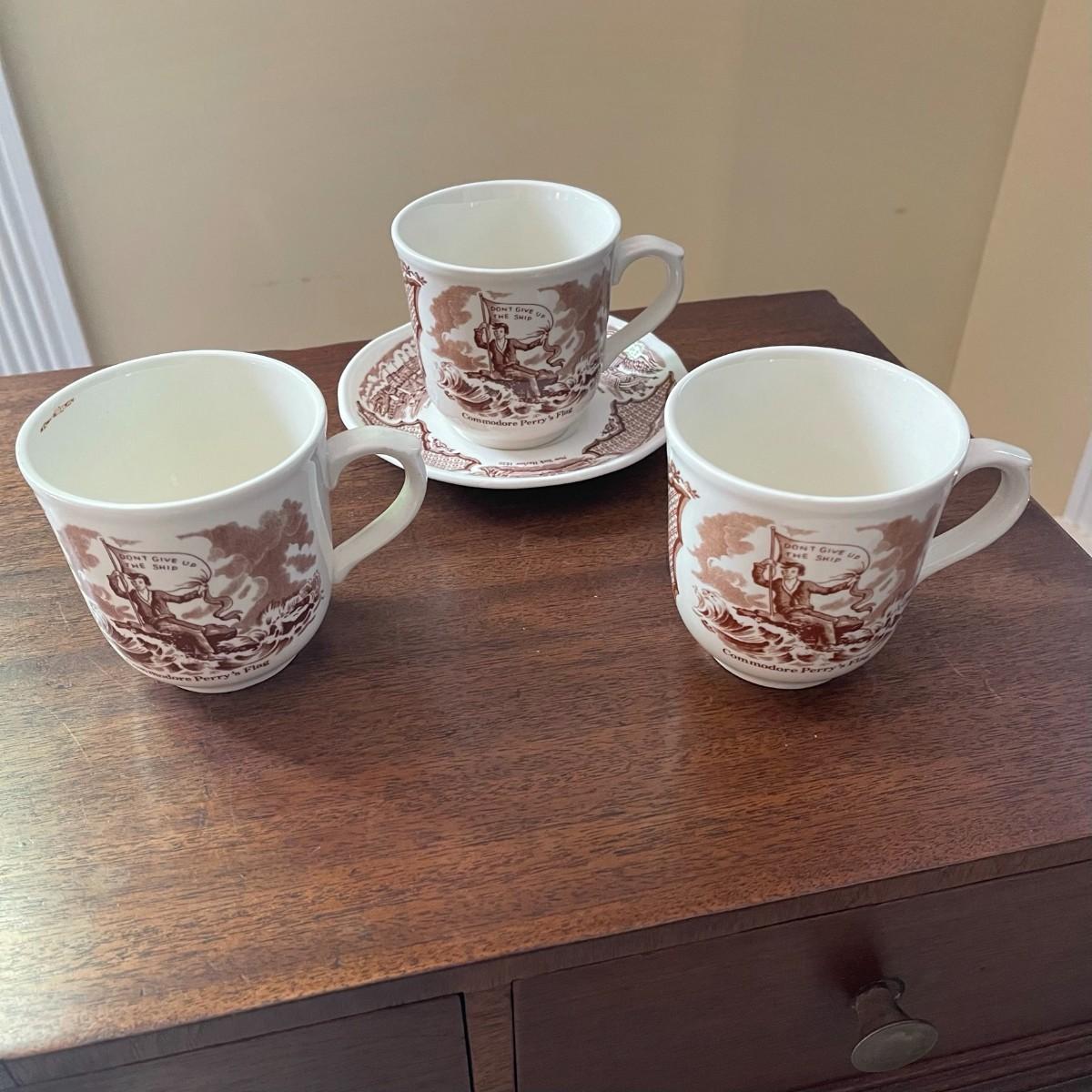 Coffee Cup Visuals include Bowed but not Broken, Commodore Perry's Flag. Measures: 3 1/2 H" x 4 3/4" W with handle x 3 1/2" D, each cup. 3 cups. Saucer Visuals include NY Harbor 1830 and Canton Port 1830. Measure: 3/4" H x 6" Diameter. 1 saucer.