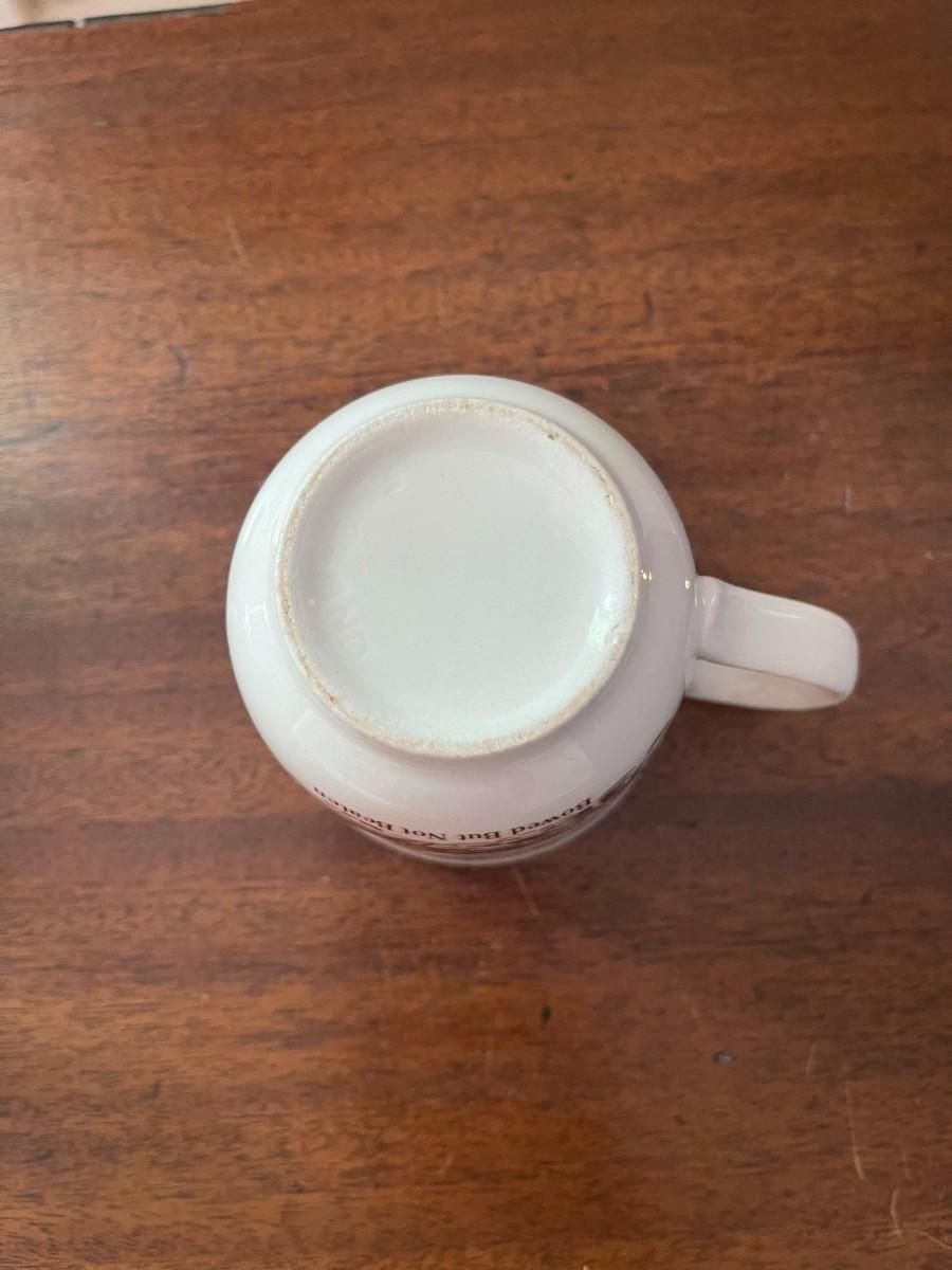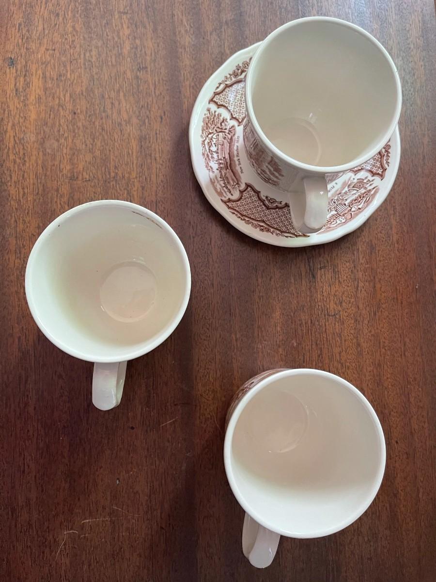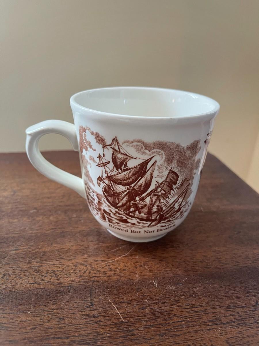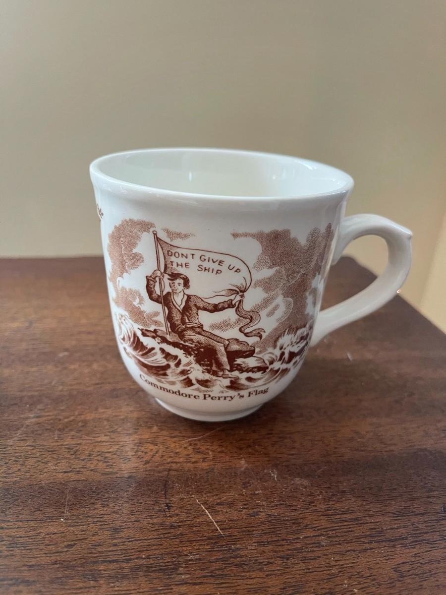 Coffee Cup Visuals include Bowed but not Broken, Commodore Perry's Flag. Measures: 3 1/2 H" x 4 3/4" W with handle x 3 1/2" D, each cup. 3 cups. Saucer Visuals include NY Harbor 1830 and Canton Port 1830. Measure: 3/4" H x 6" Diameter. 1 saucer.