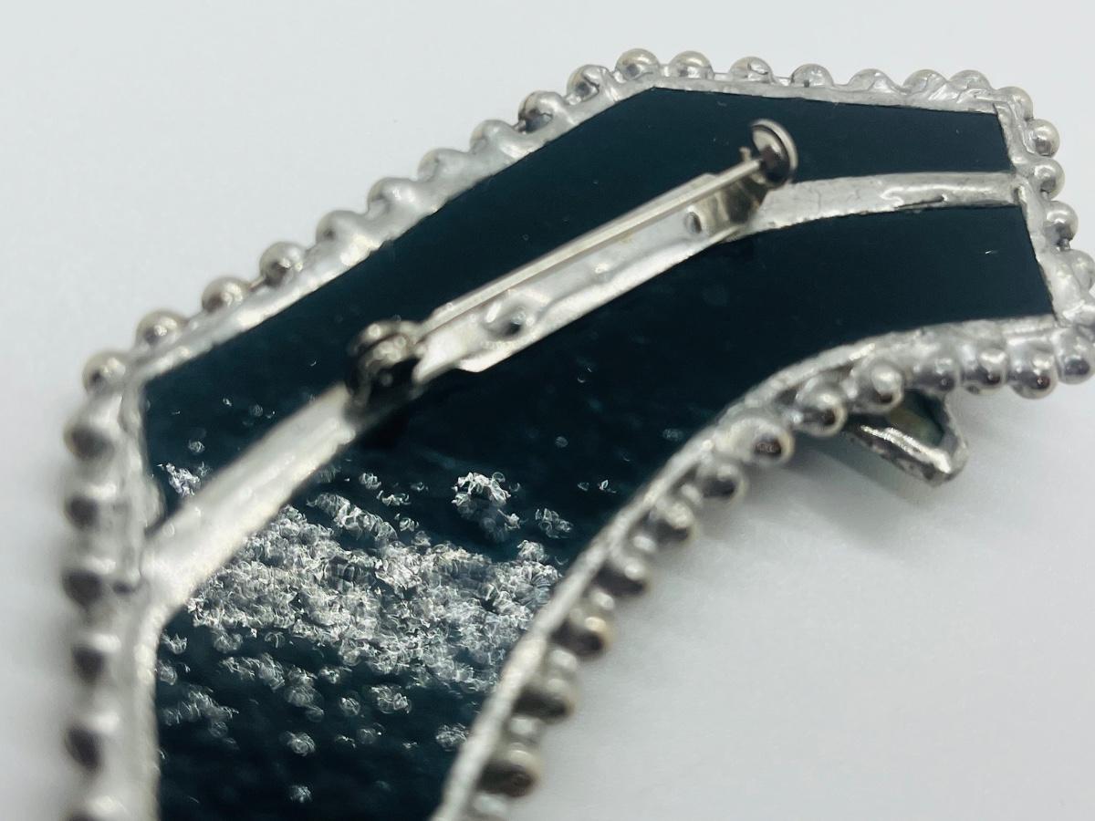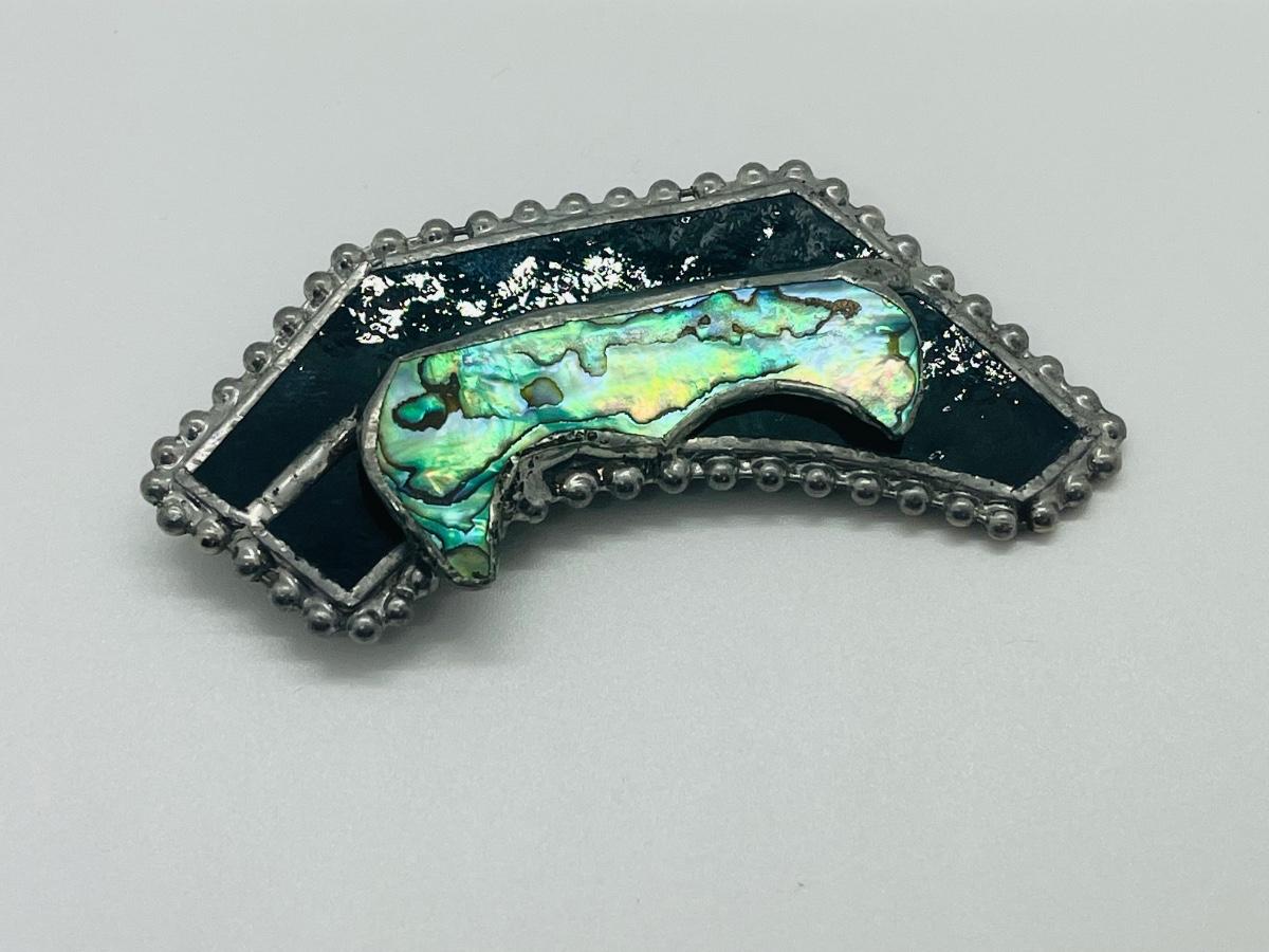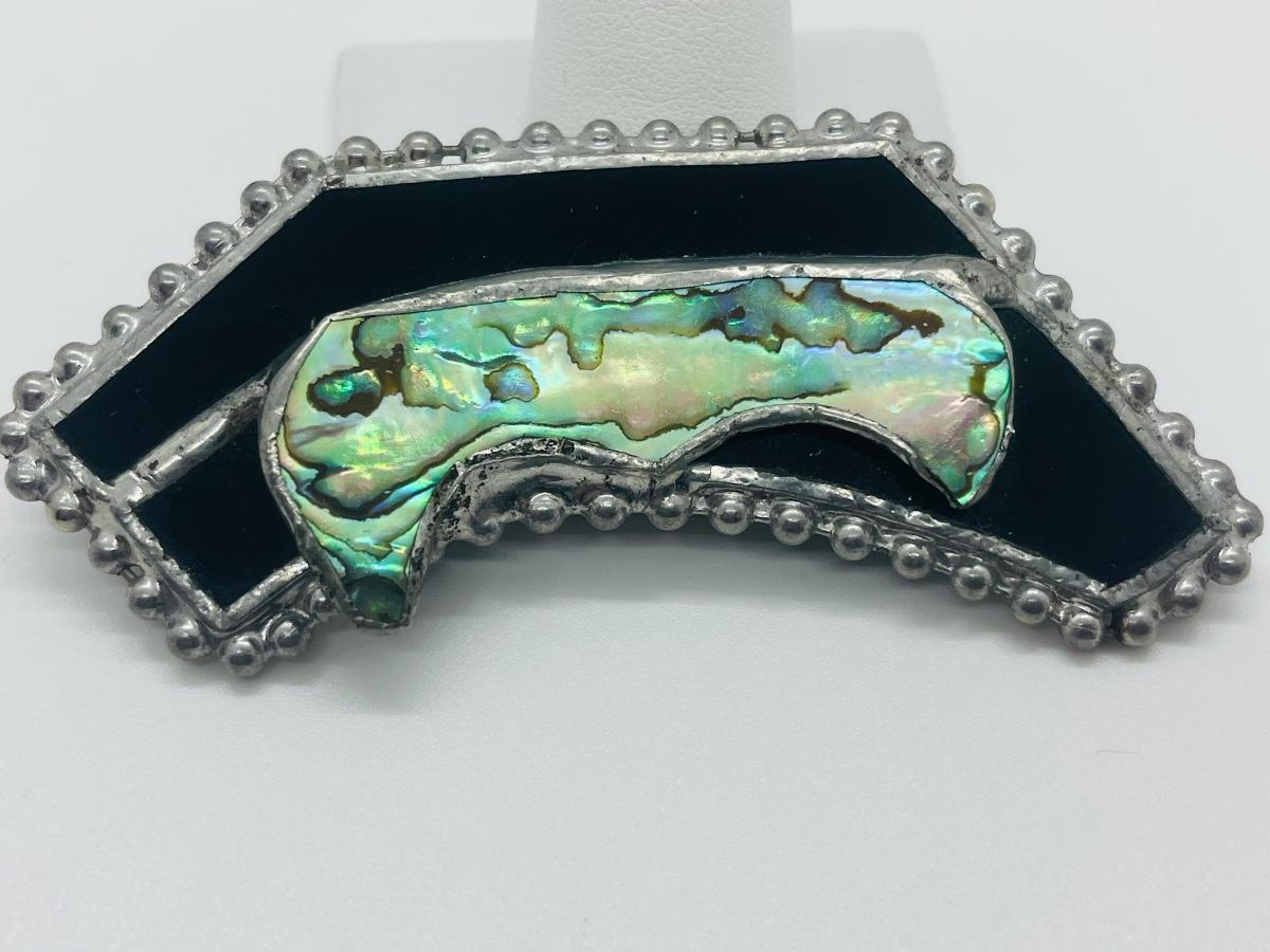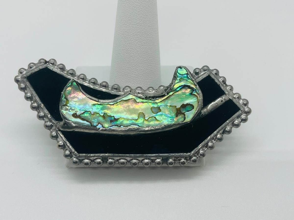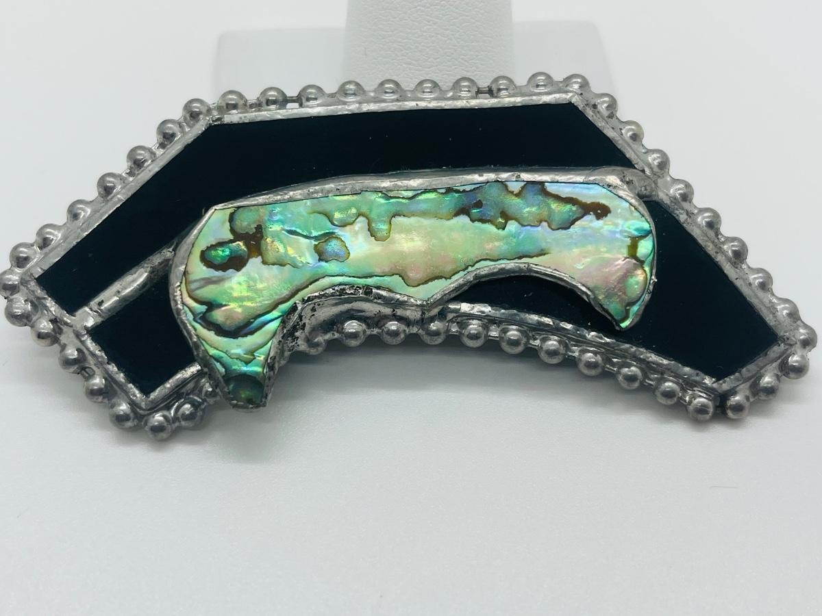 Lot 67: Vintage Sterling Abstract Brooch in Onyx and Abolone