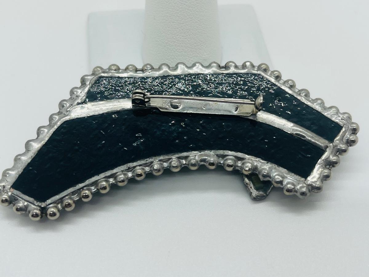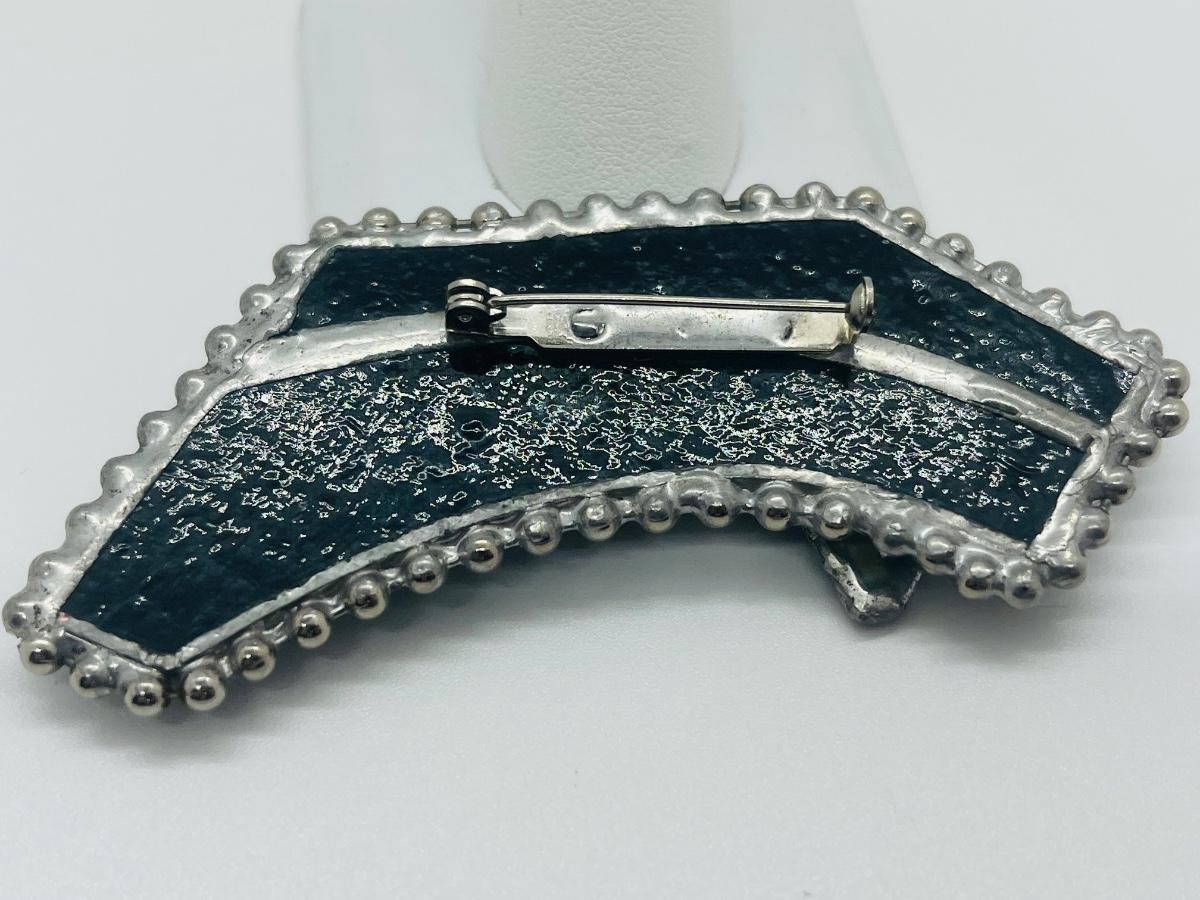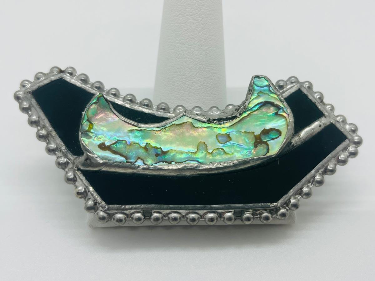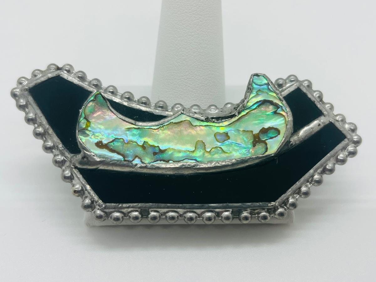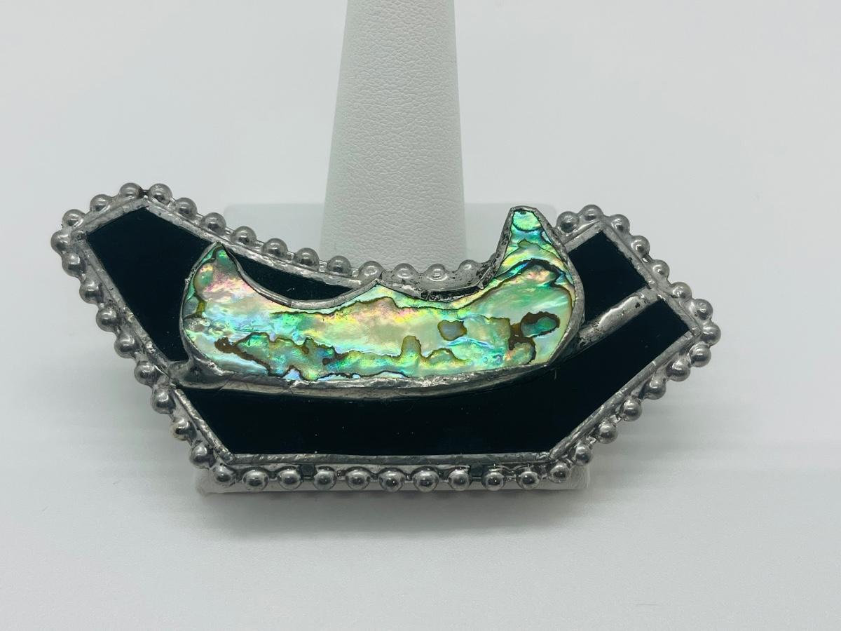 This piece is unmarked but is believed to be a beautiful sterling abstract brooch with onyx and abolone. The client bought from a lot of artists shows and boutiques. This most likely came from one. The pictures show condition, measurements if taken, and what is included in the lot. Due to the large amount that we photograph and the time frame, we are not always able to take measurements. All items unless noted, are pre-owned and have been used, and are untested. Thank you
