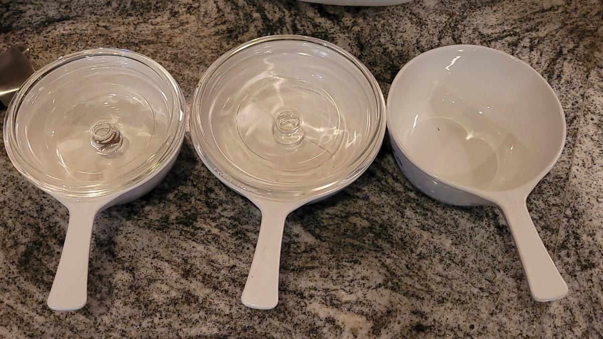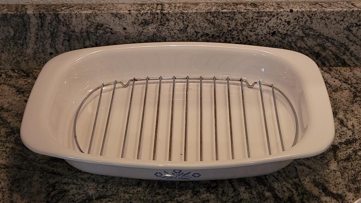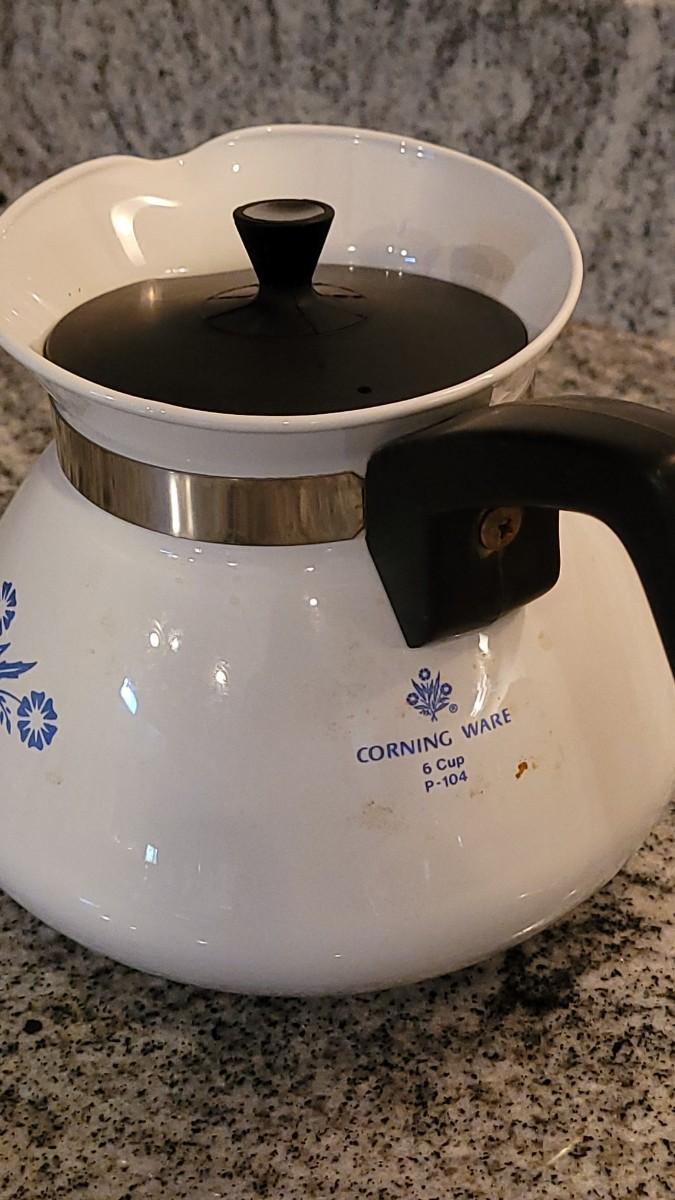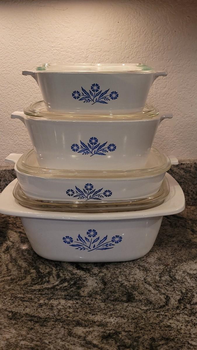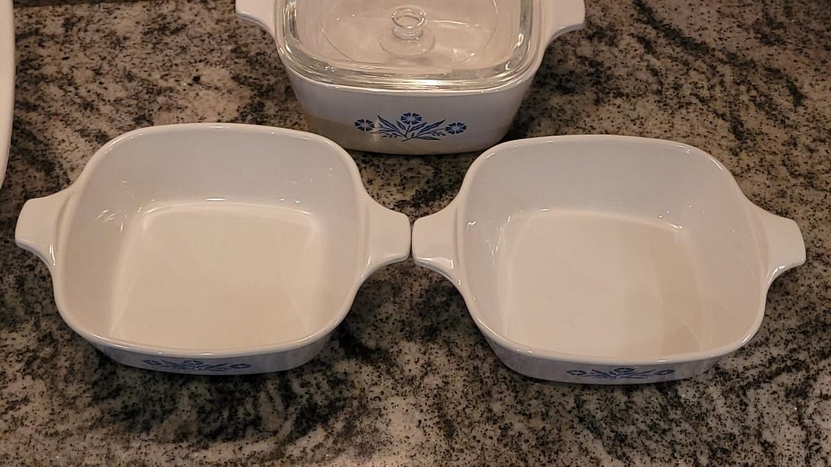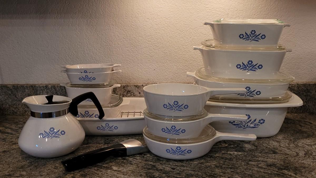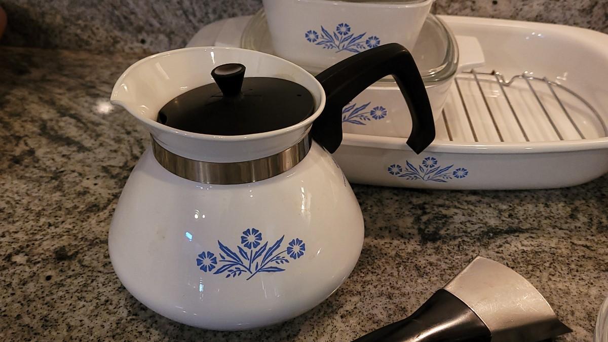 Lot 67: Vintage Corning Ware Blue Cornflower Casserole Dishes, Roasting Pan, Tea Kettle