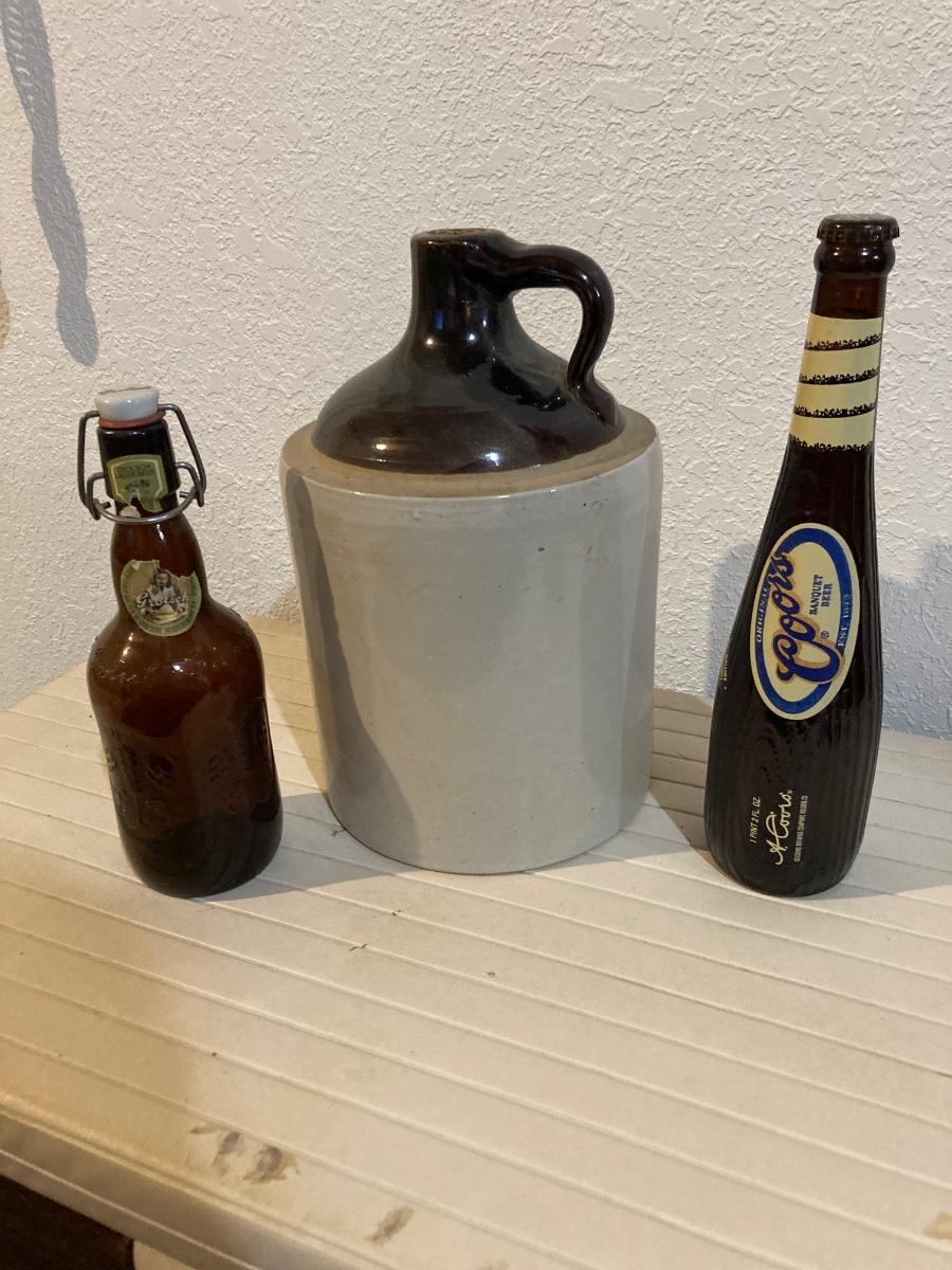 LOT 67 VINTAGE CROCK JUG, COORS AND LOCKING BOTTLE