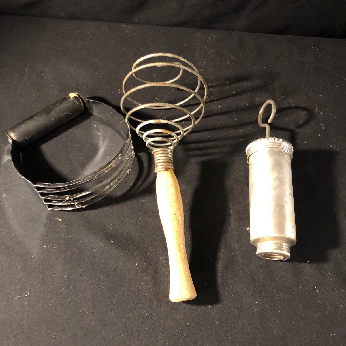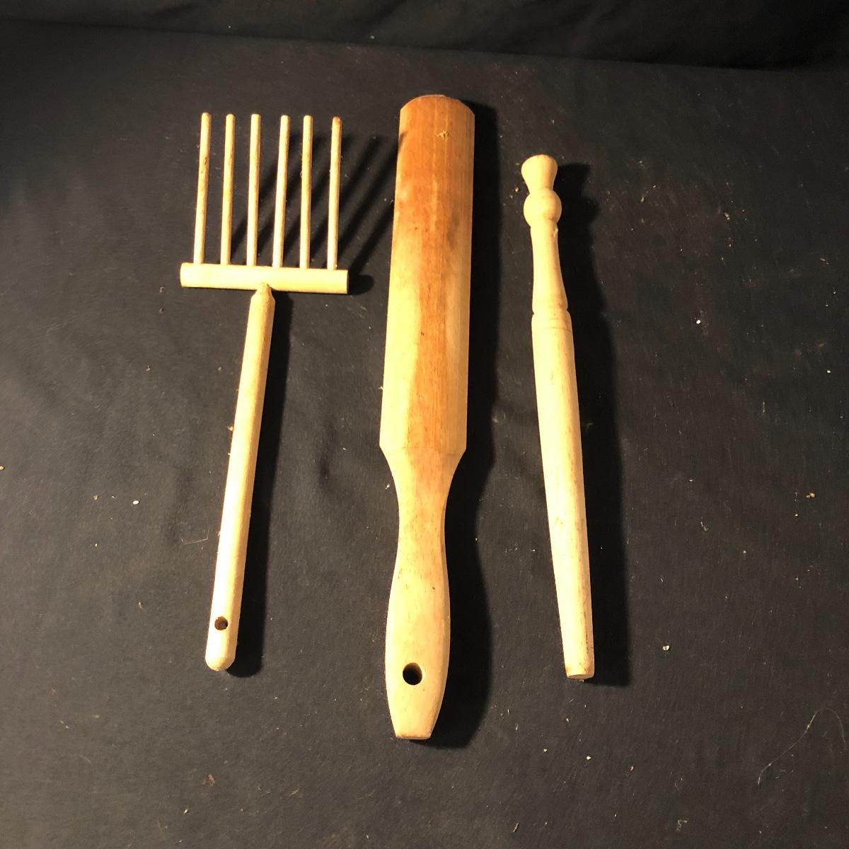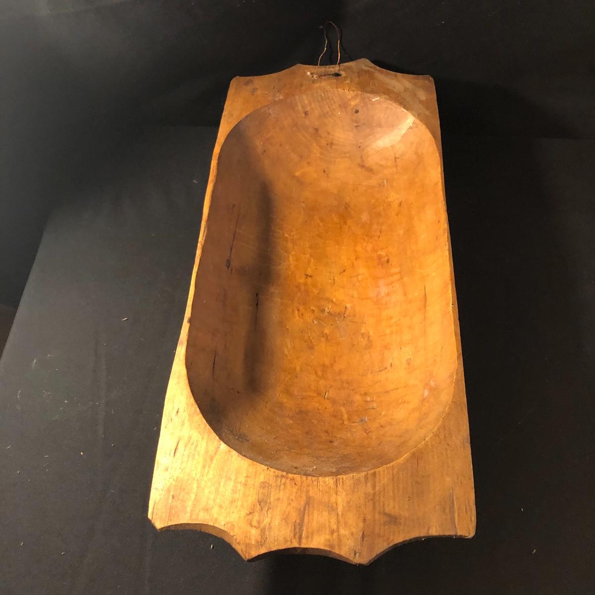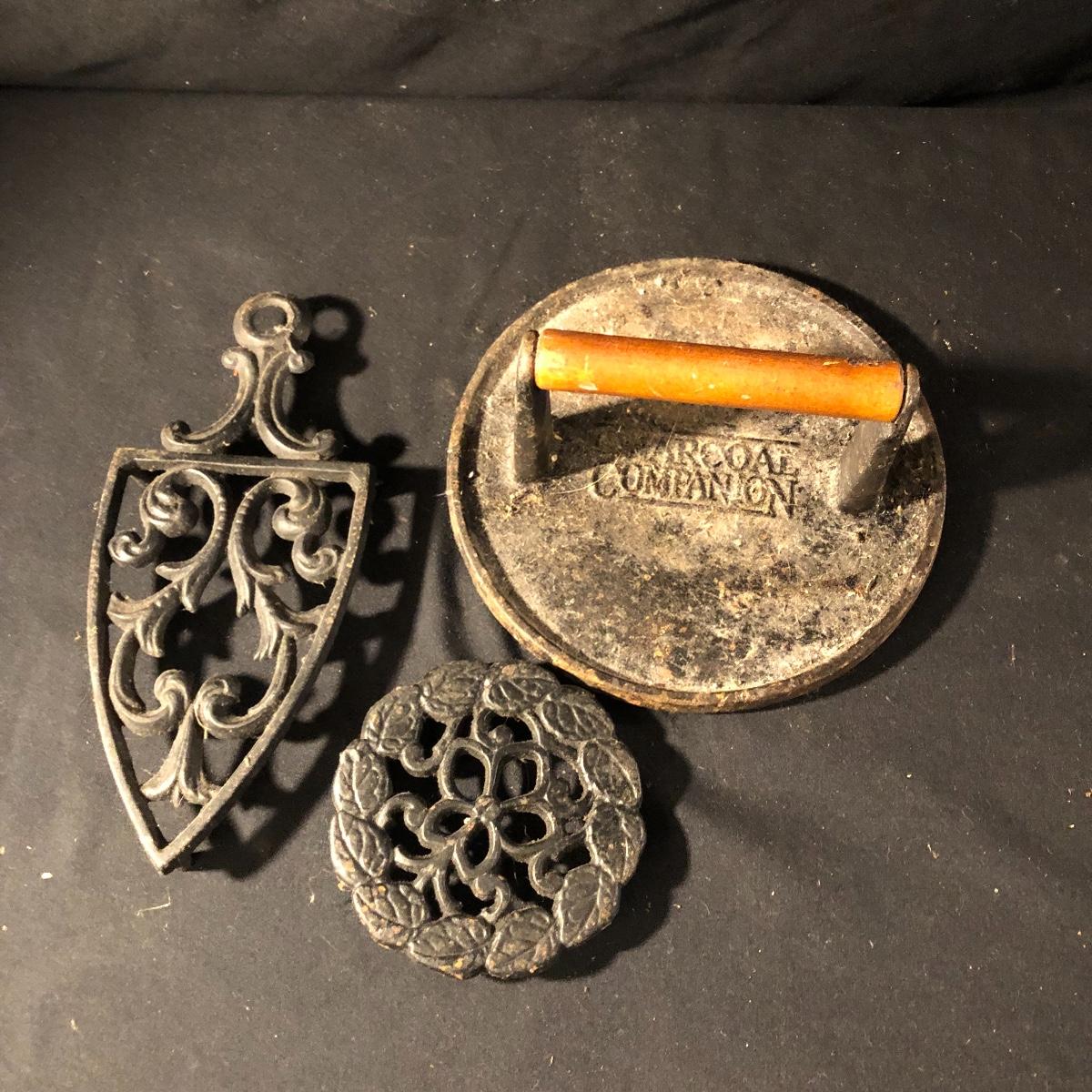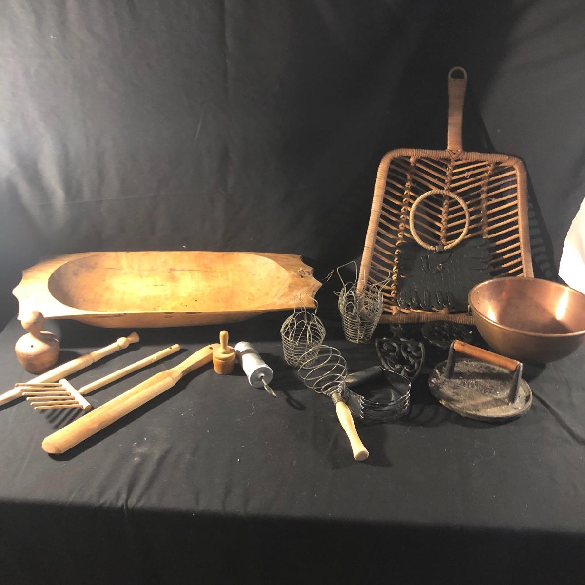 A eclectic mix of Americana items. Lot includes hand carved wooden bowl, copper bowl, butter stamp, large wicker basket with handle, wooden utensils, three wire baskets, Charcoal Companion cast iron press, two cast iron trivets, wooden butter press and a metal wall hanging with towel ring. Handmade wooden bowl measures 9.5” x 23” x 3.5”.