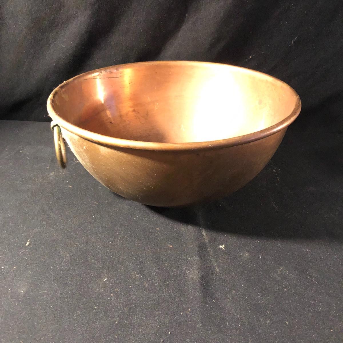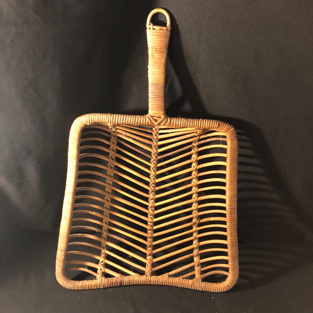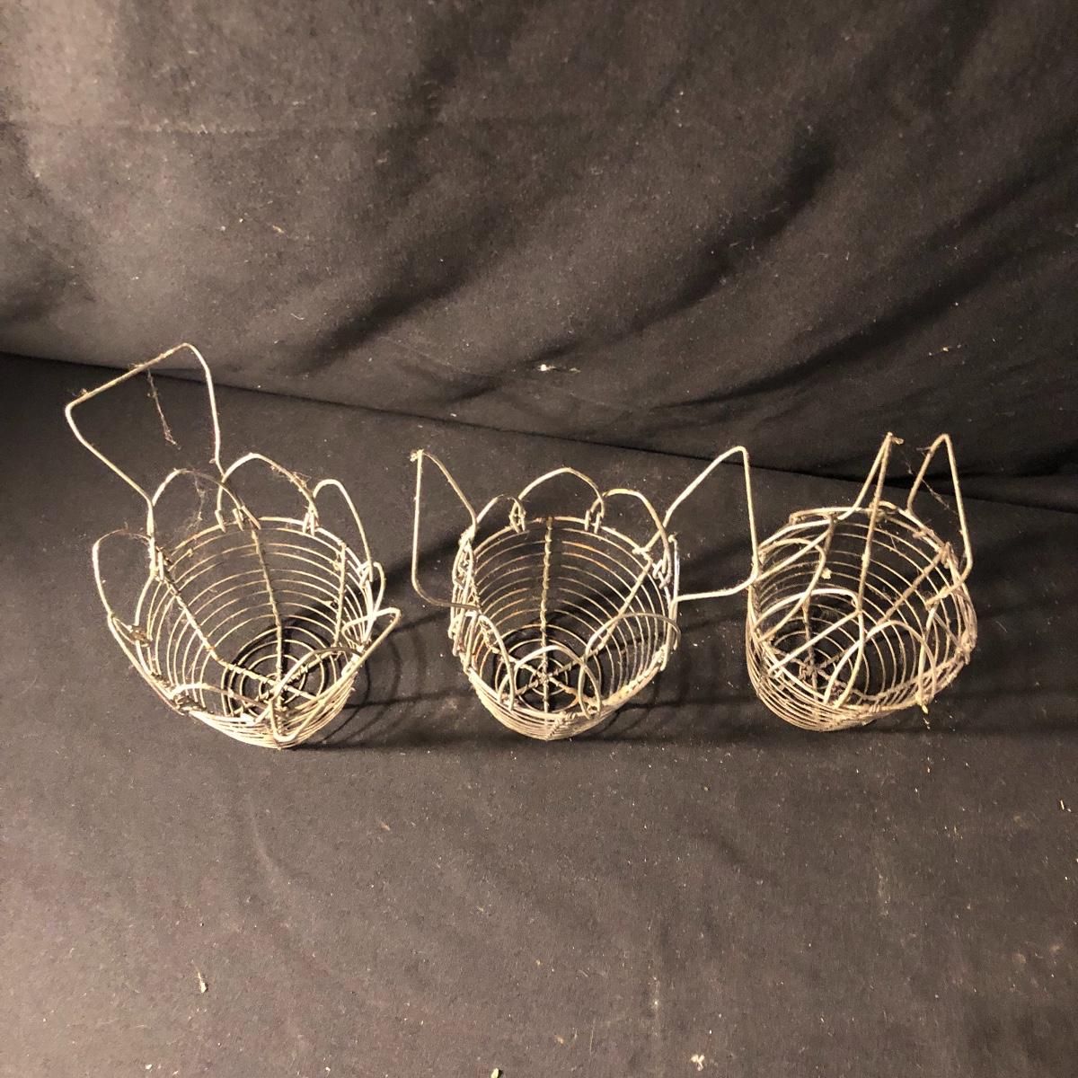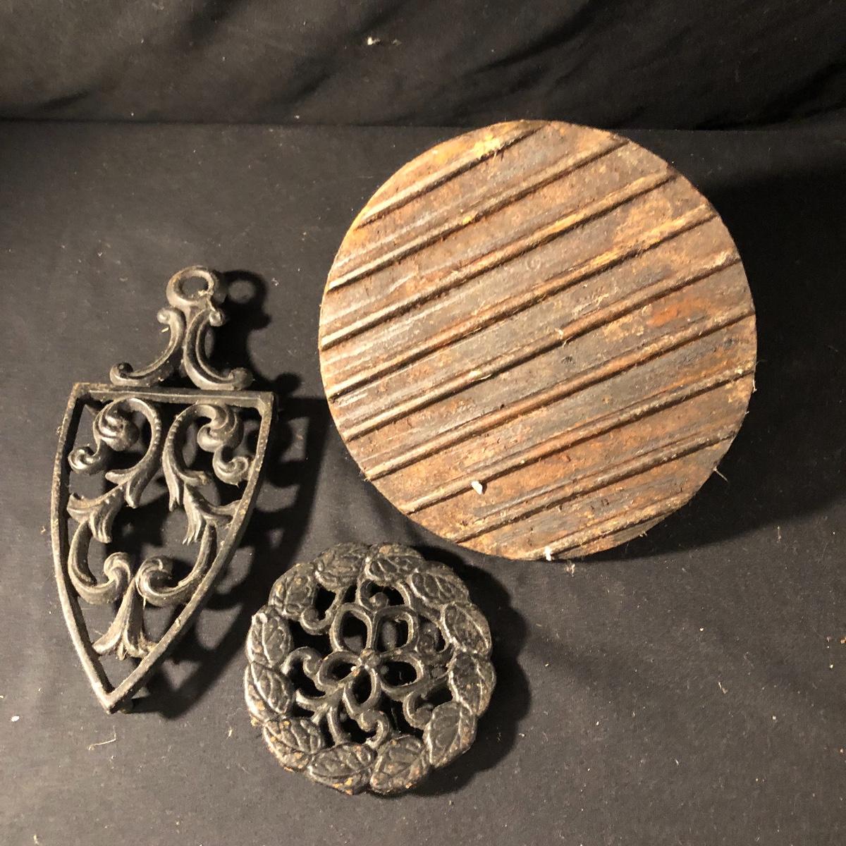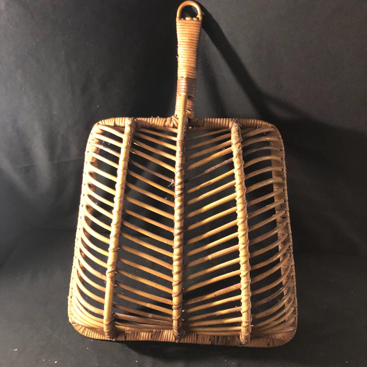 A eclectic mix of Americana items. Lot includes hand carved wooden bowl, copper bowl, butter stamp, large wicker basket with handle, wooden utensils, three wire baskets, Charcoal Companion cast iron press, two cast iron trivets, wooden butter press and a metal wall hanging with towel ring. Handmade wooden bowl measures 9.5” x 23” x 3.5”.