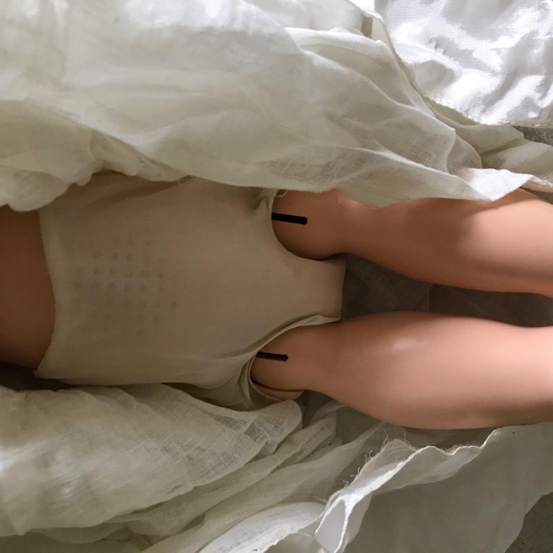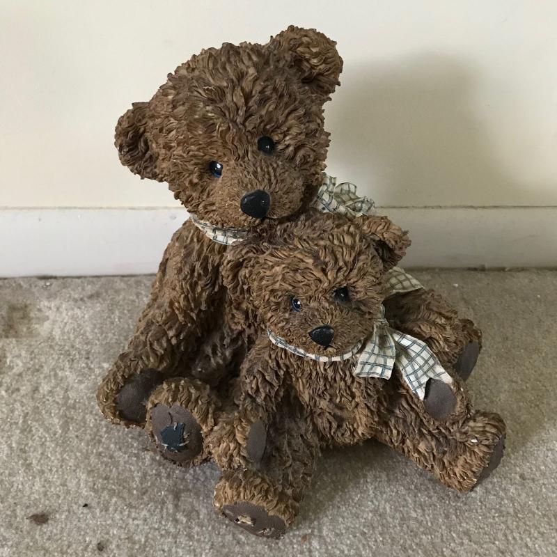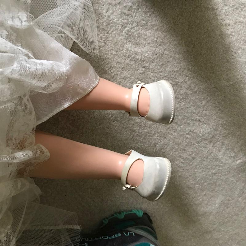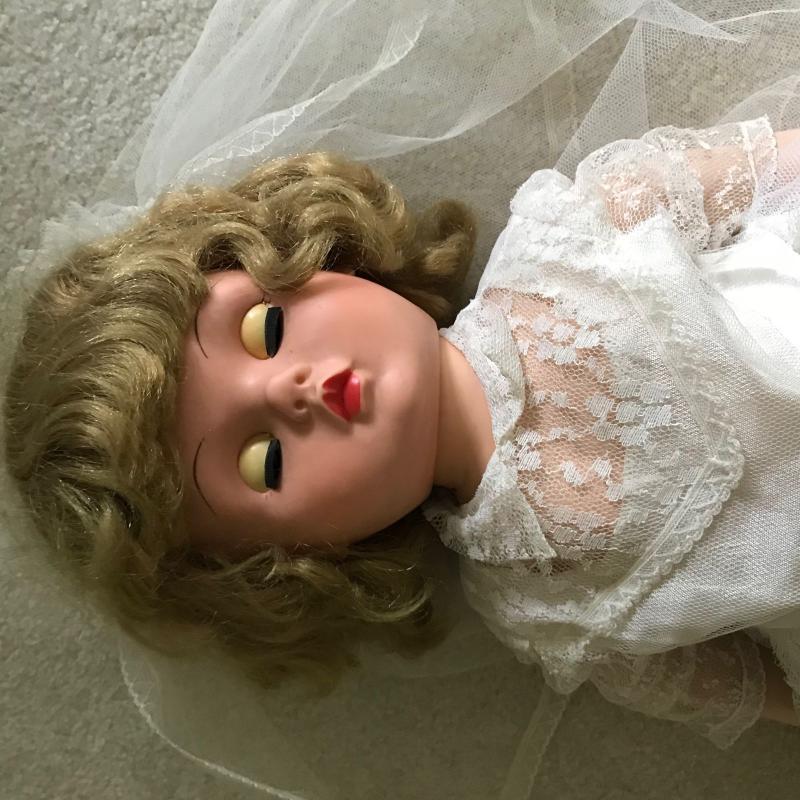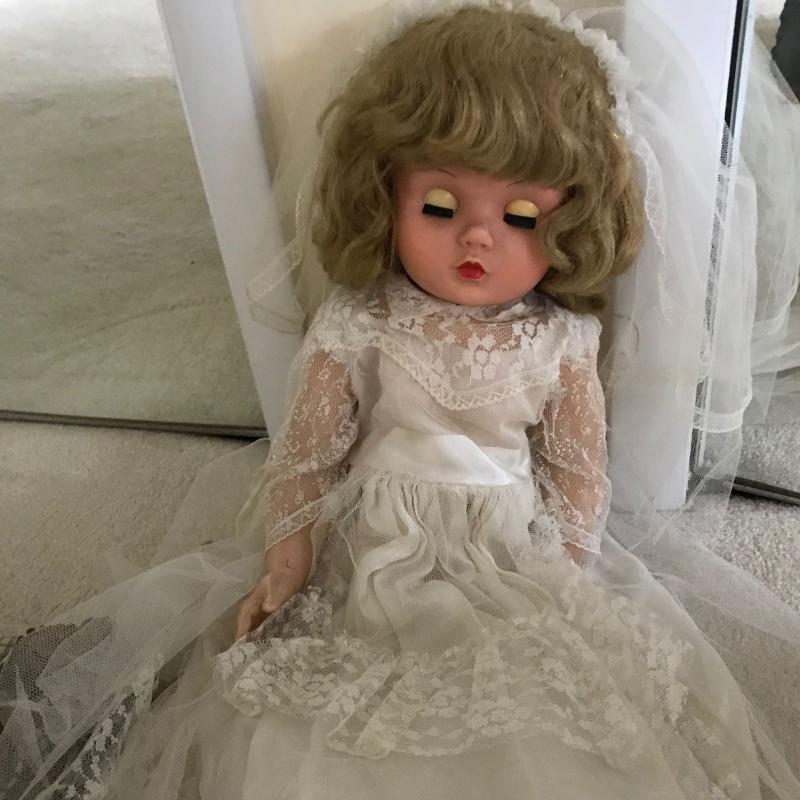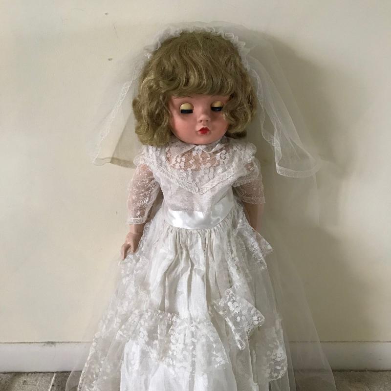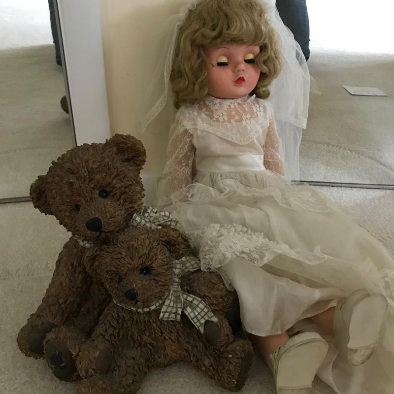 Sayco 28” Antique Doll. Eyes are stuck and do not open (could likely be fixed). She makes a crying sound when moved to lying position. She wearing an antique wedding dress. Lot also includes two bear figurine measuring 9” x 11” x 9” Shipping available