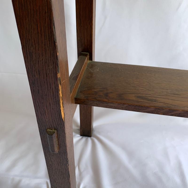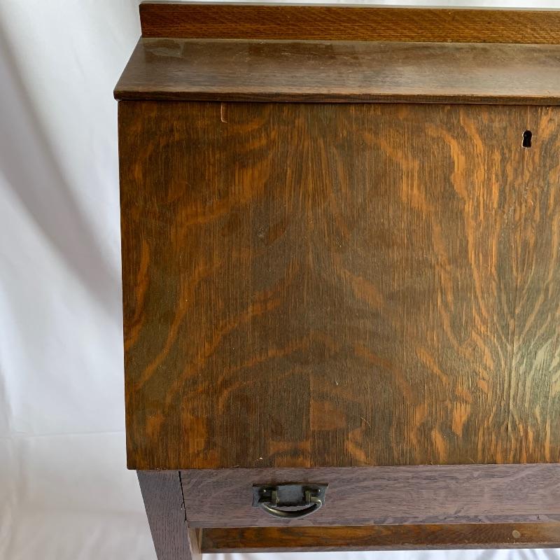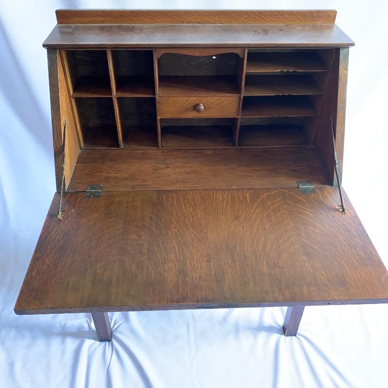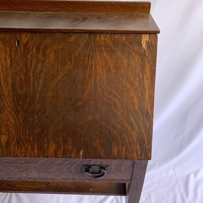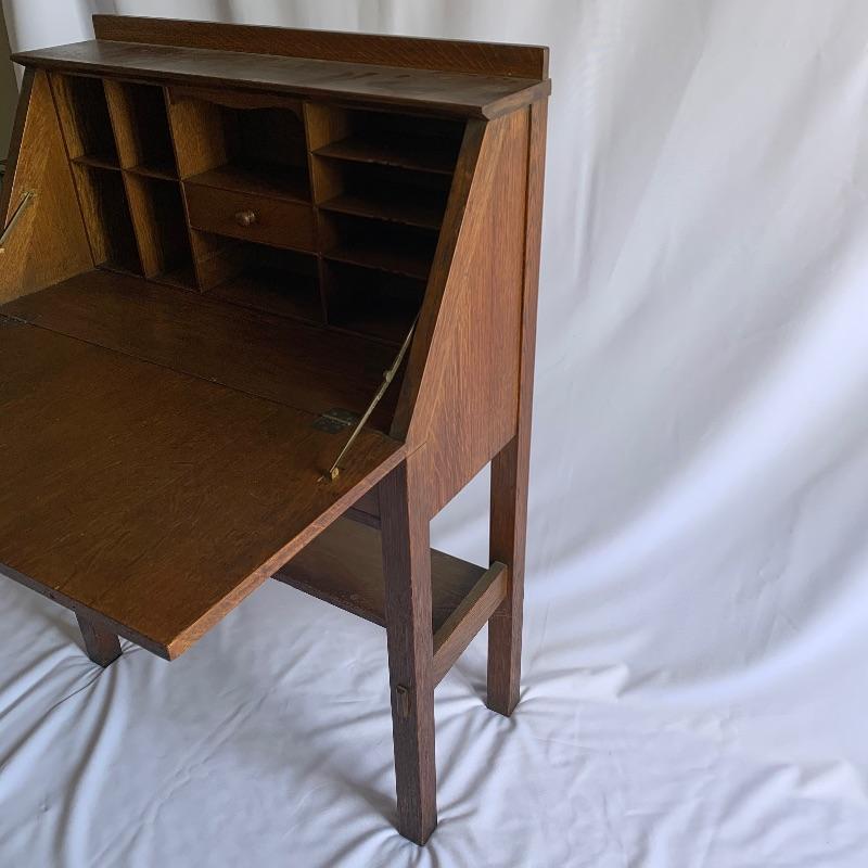 Arts & Crafts secretary desk. Beautiful secretary desk with dovetail drawer that is in good shape. Lots of great built in storage that can be hidden away and extra shelf underneath. Just a few flaws including three pieces chipped on front and one scratch on left front leg, See pictures. Key is missing. Executor states this is a Stickley piece but no found markings. Desk measures 13” x 30” x 43” when closed and 27” x 30” x 43” when open.