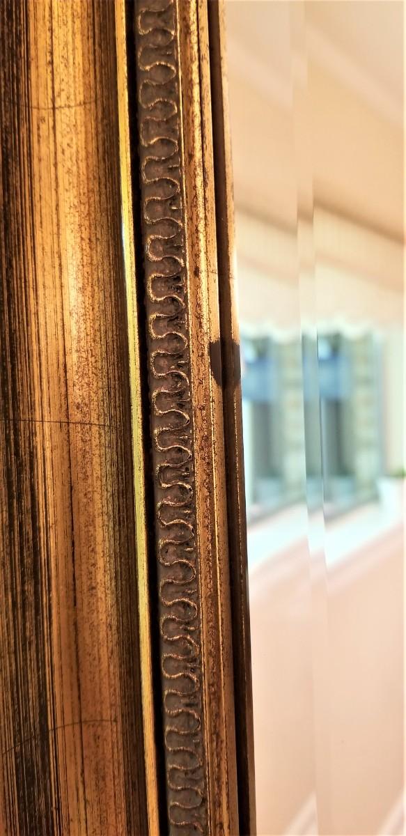 Nice beveled wall mirror with gold gilded frame. One small knick where the gilding is a bit worn (see photo) - easy fix. Measures 36" across, 24" tall.