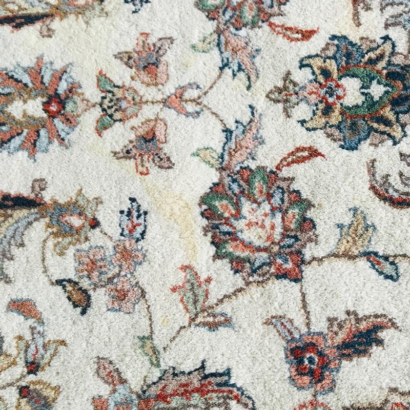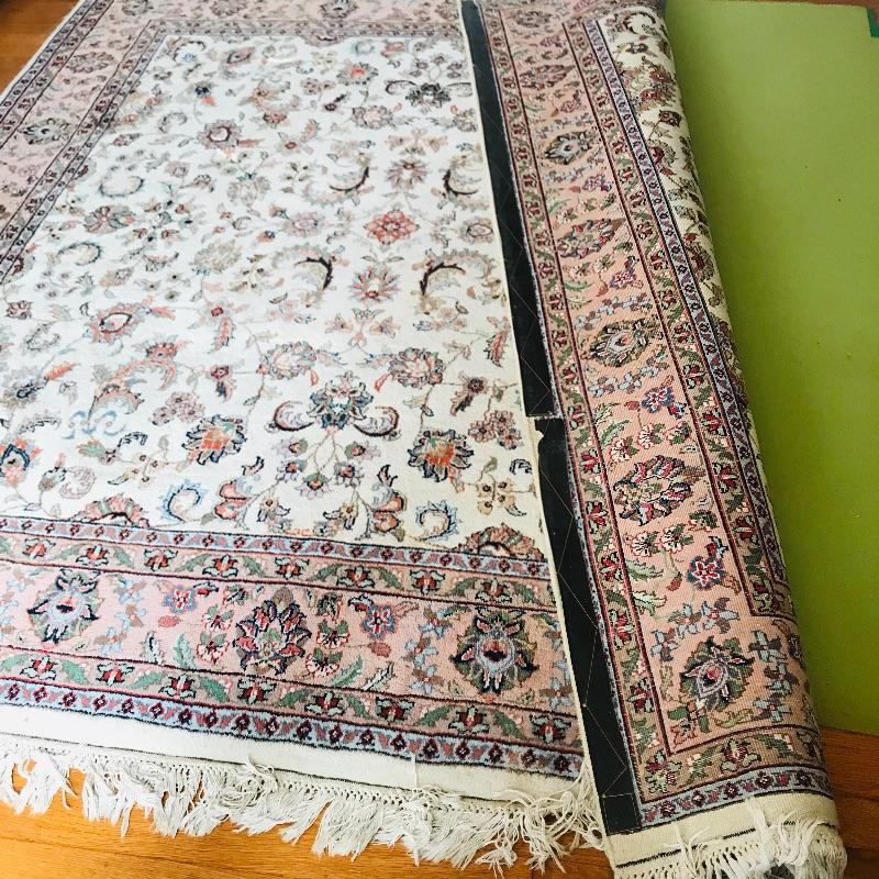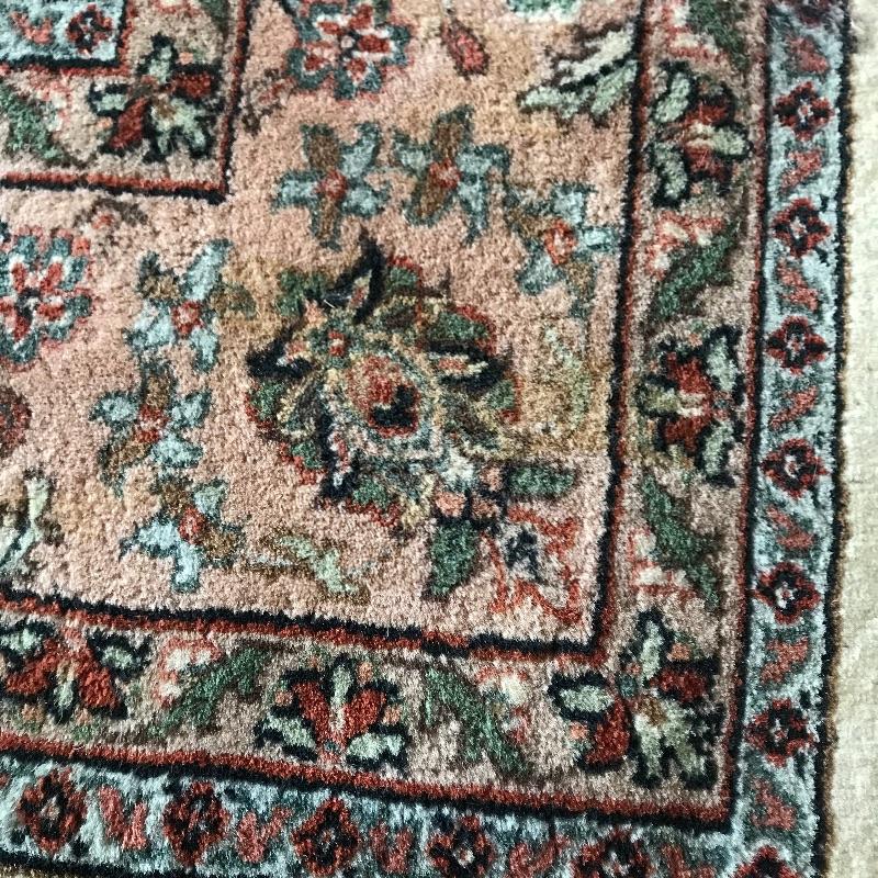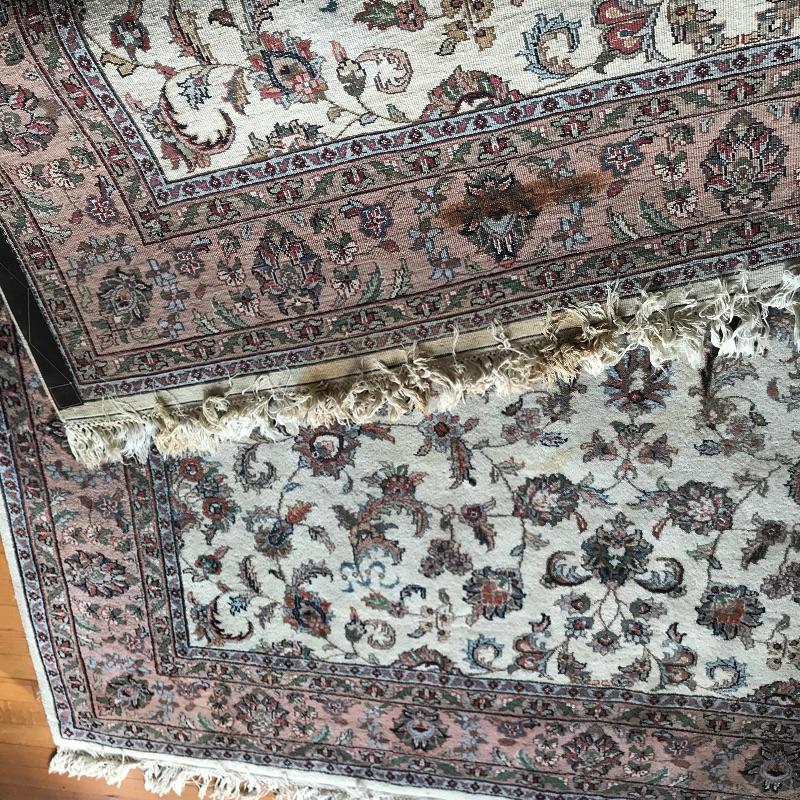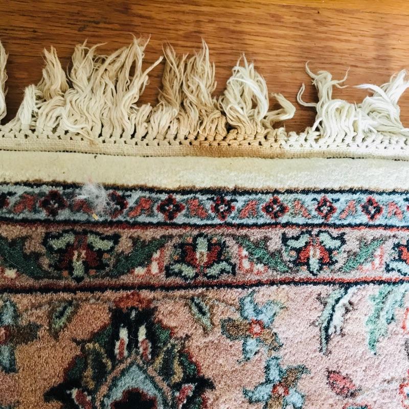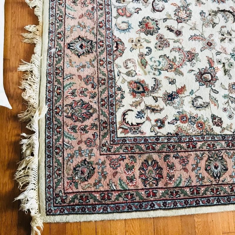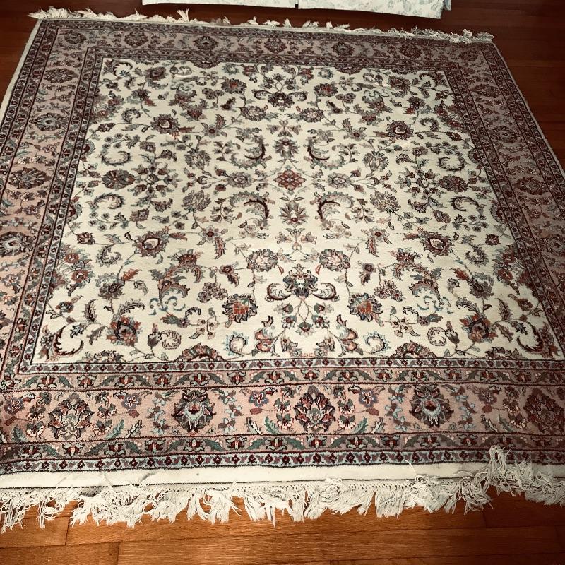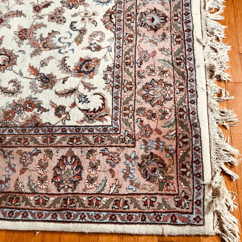 The perfect addition to tie your room together. Great unique square size (well almost square - it's 6'6" x 6'8"). The rug has a woven floral theme with a blush colored border and cream colored center. There are stains found throughout, many along the fringe border, see photos. Rug appears to have a great integrity and will be stellar with a cleaning and stain removal. Rug is almost square measuring 6’6” x 6’8” before fringe border. See photos. No shipping.