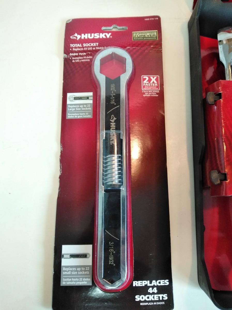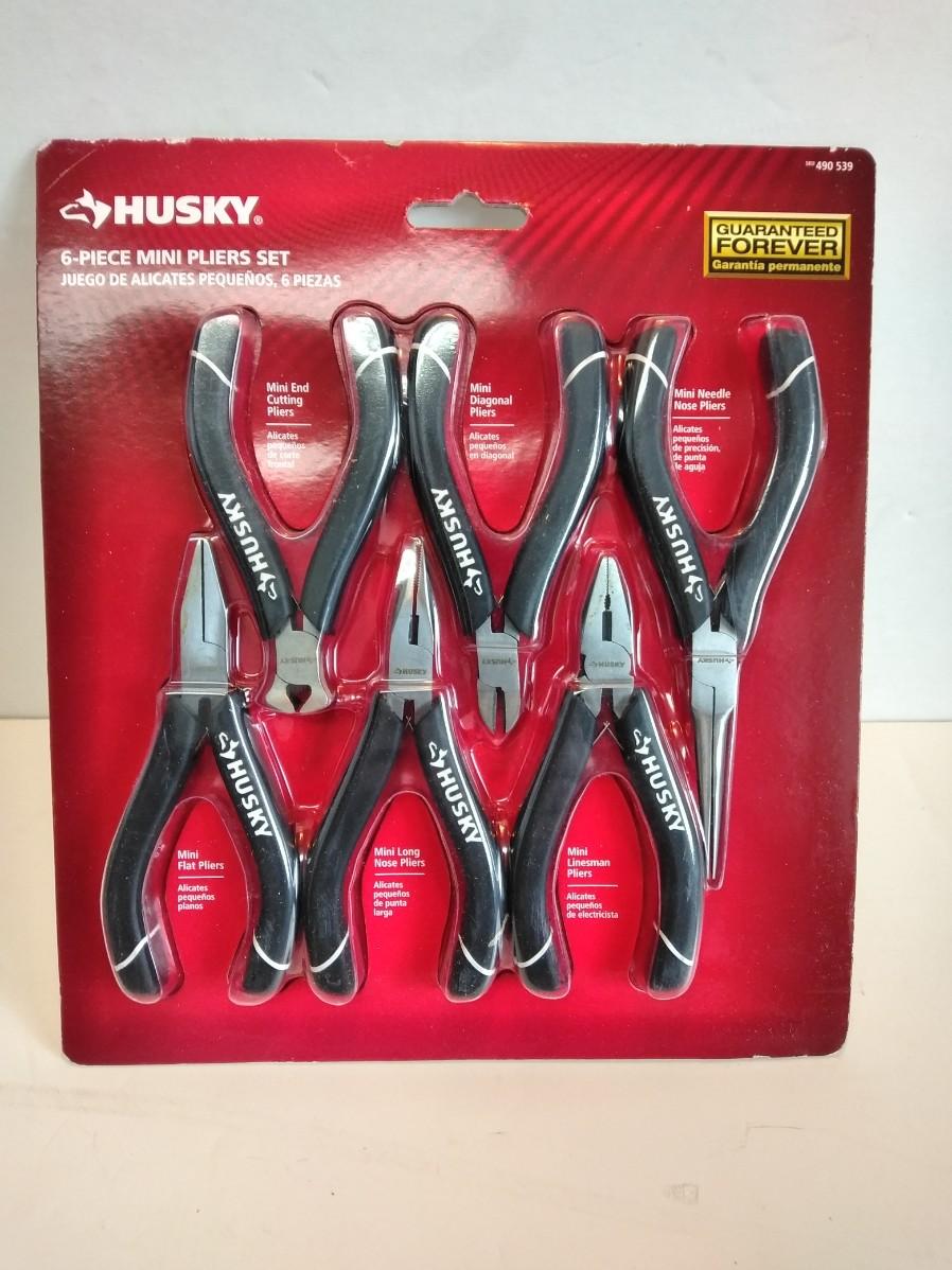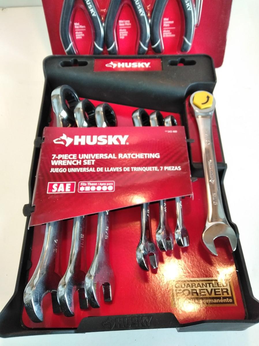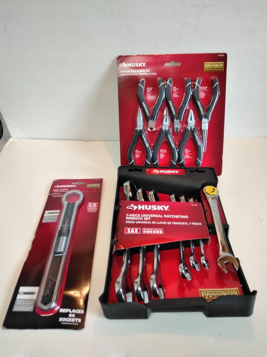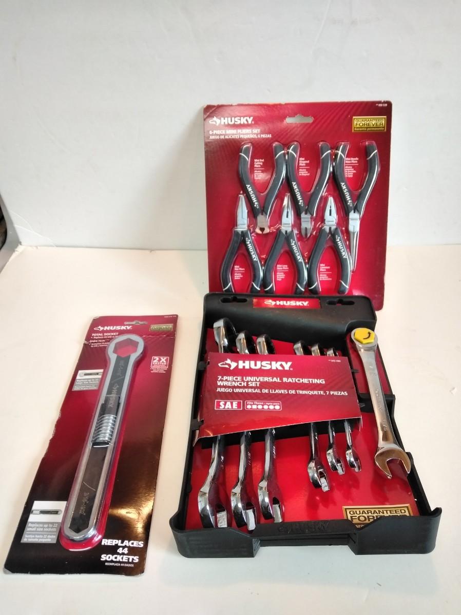 BRAND NEW HUSKY HAND TOOLS 6 PIECE MINI PLIERS SET, TOTAL SOCKET WHICH REPLACES UP TO 22 LARGE AND 22 SMALL SIZE SOCKETS, AND A 7 PIECE UNIVERSAL RATCHETING WRENCH SET.