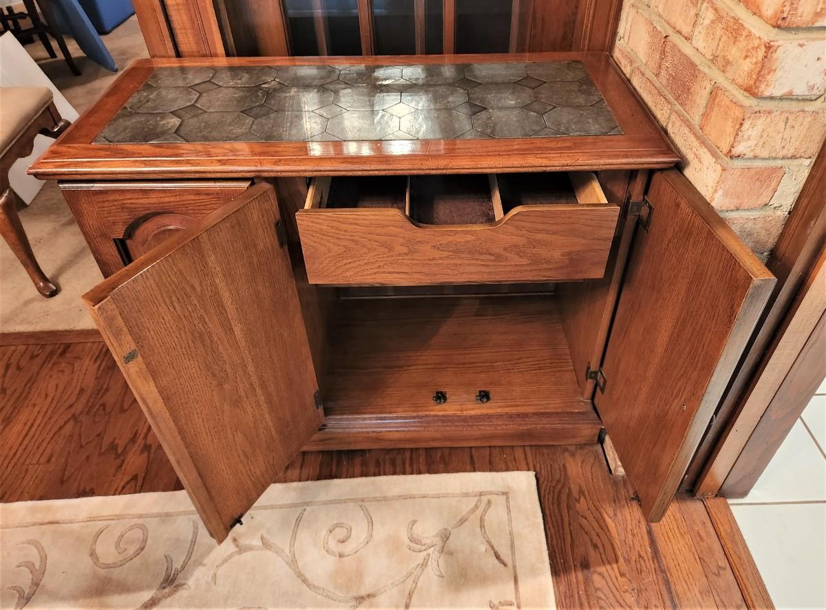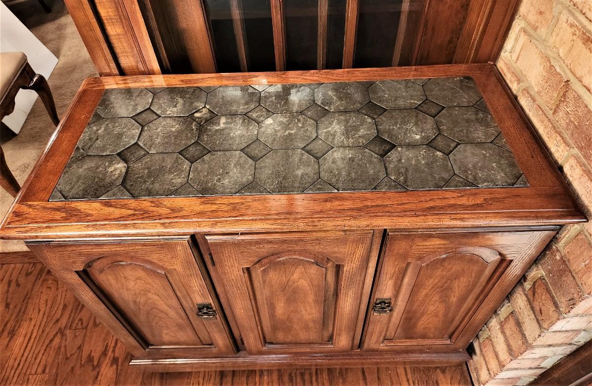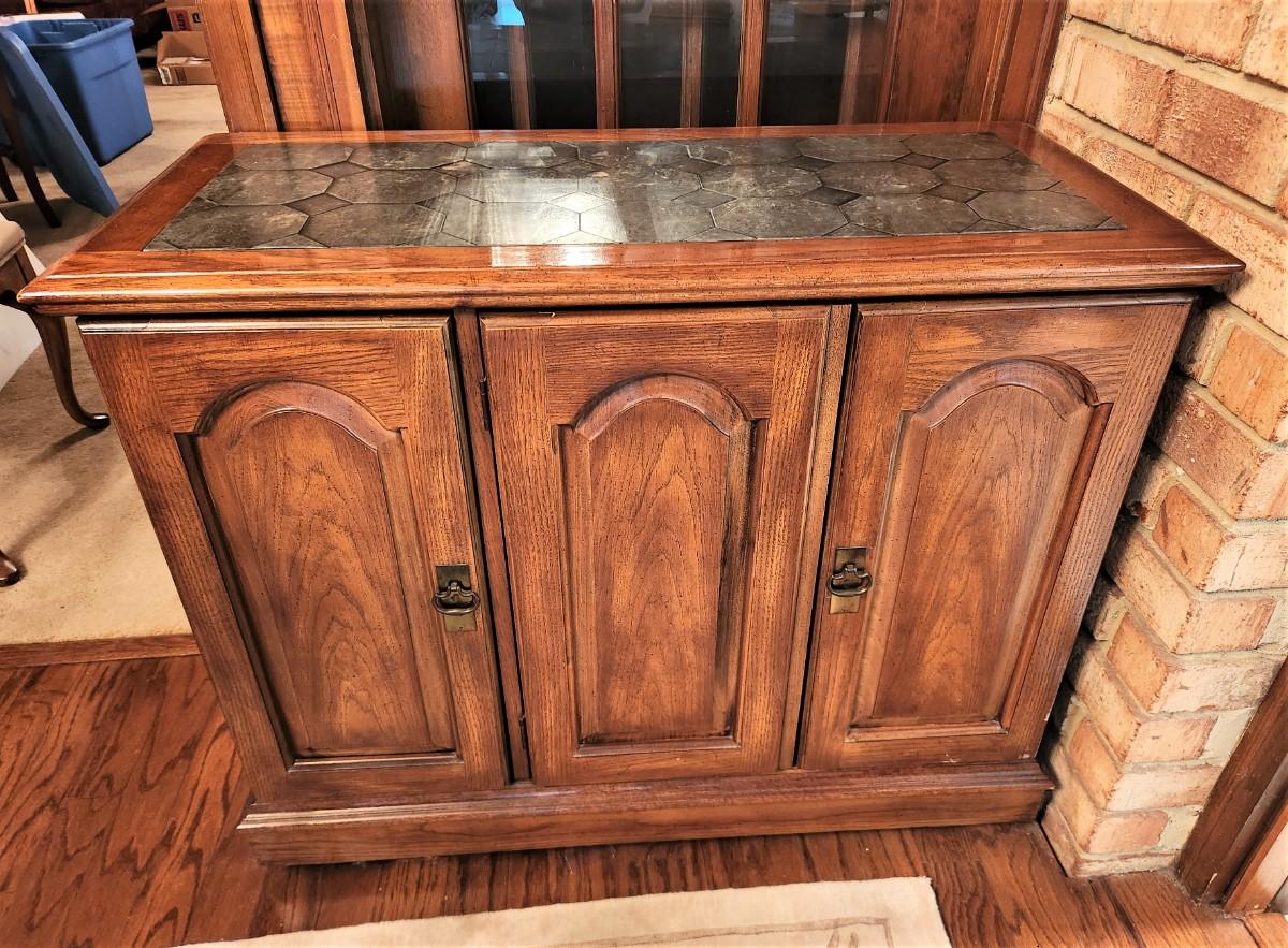 BURKHARDT Server - matches China Cabinet shown earlier - faux tile top, Oak finish, sold wood. On recessed wheels - lots of storage underneath - would make a good bar. 18" deep, 39" across, 31" tall. Good used condition.