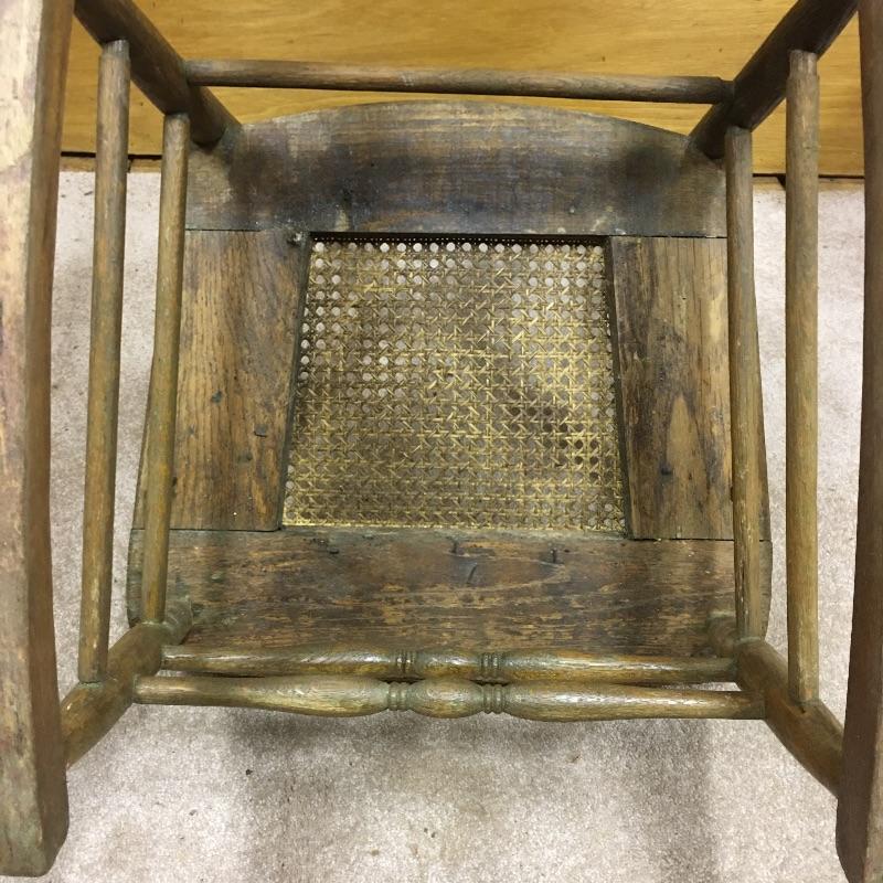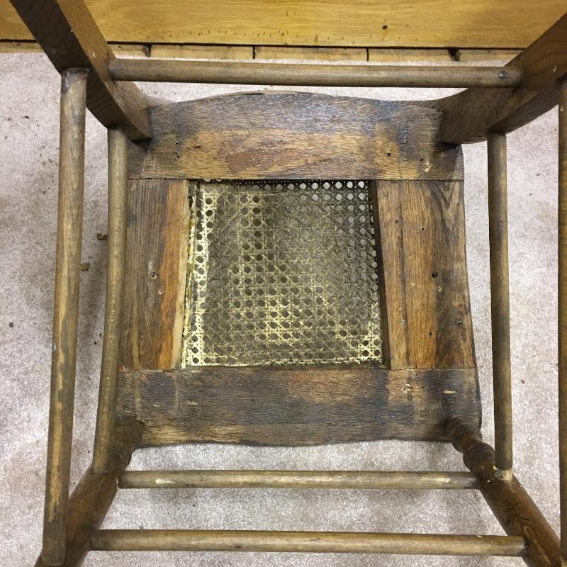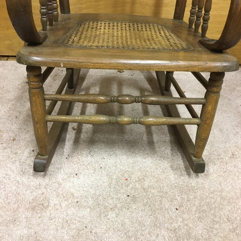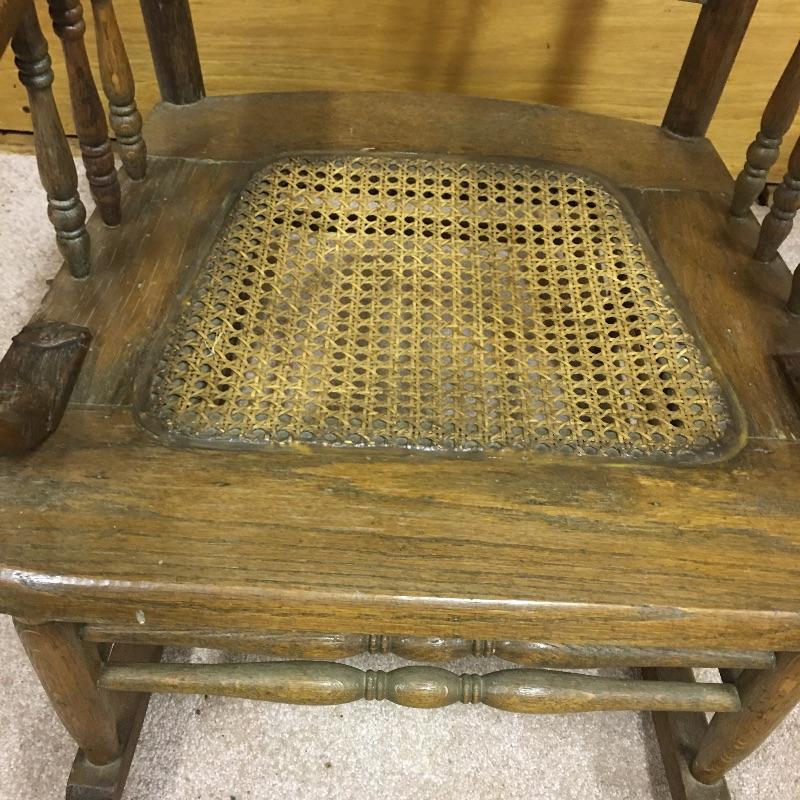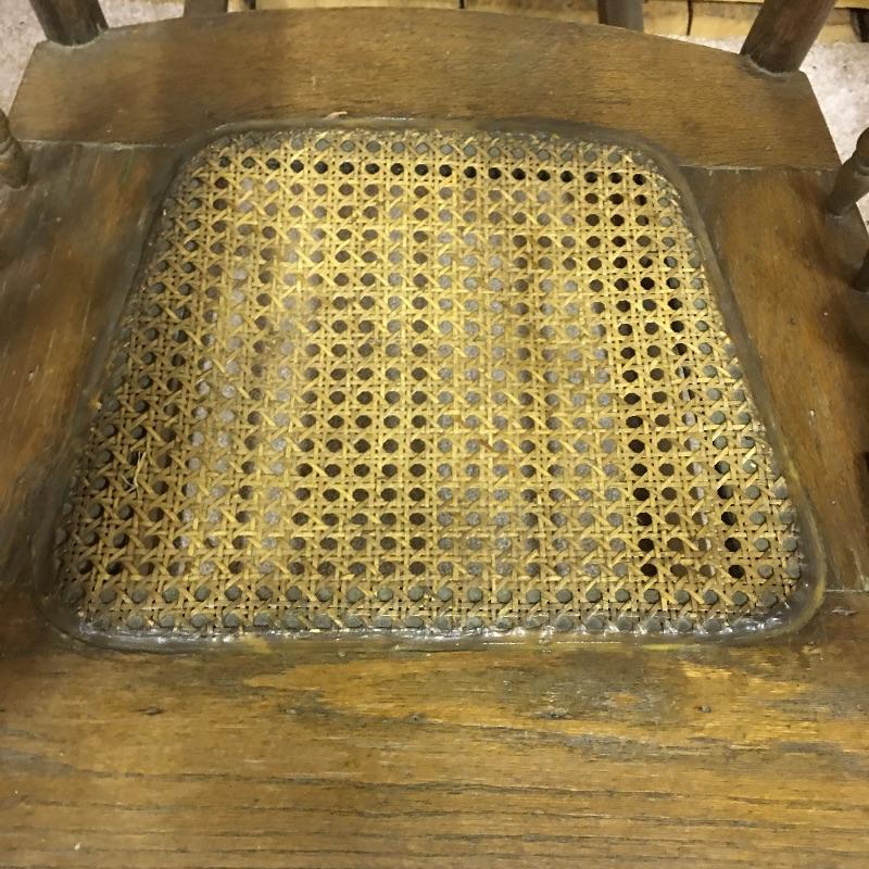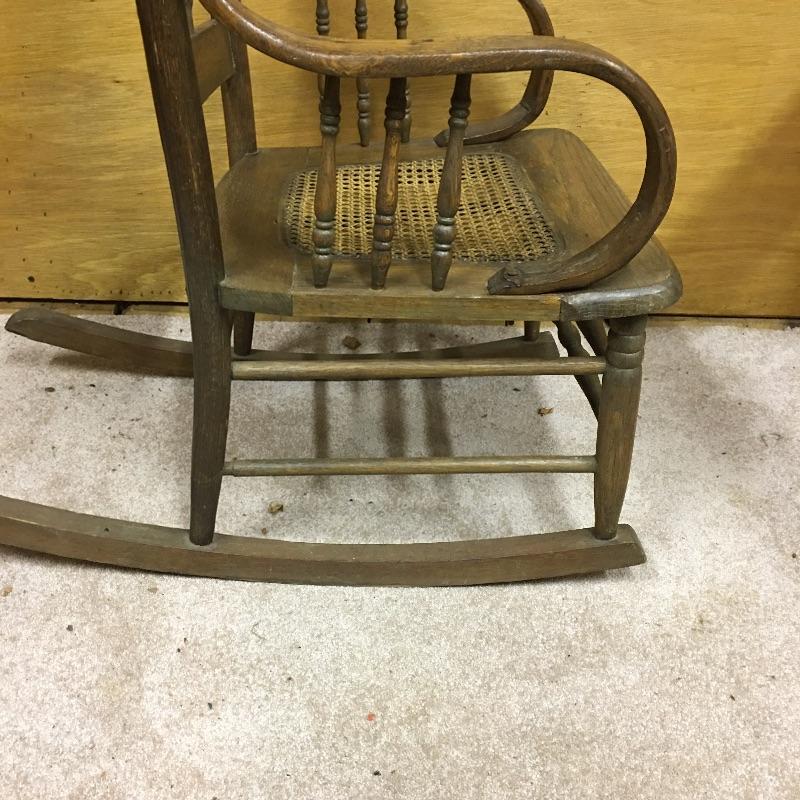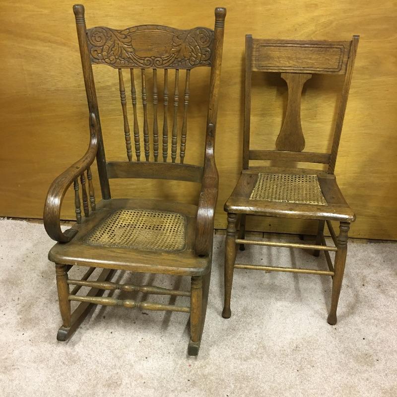 This pair of cane bottom chairs are in good shape with some scratches and nicks, see pictures. The rocker has a carved back with seven spindles and a cane bottom. The chair has been screwed together but appears to be sturdy, see pictures.