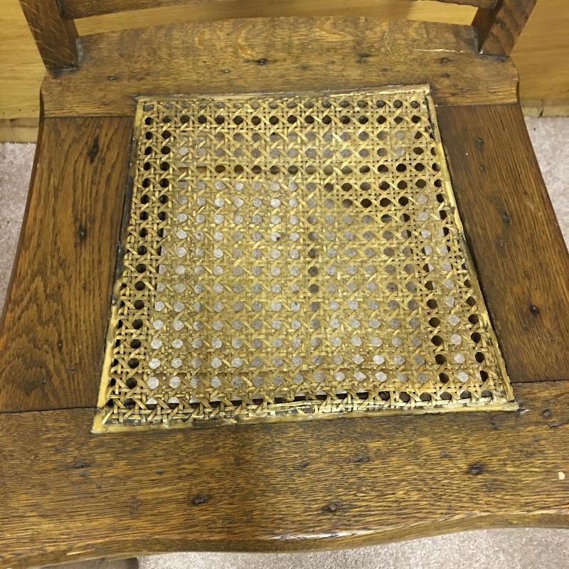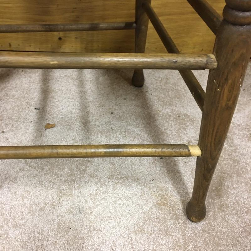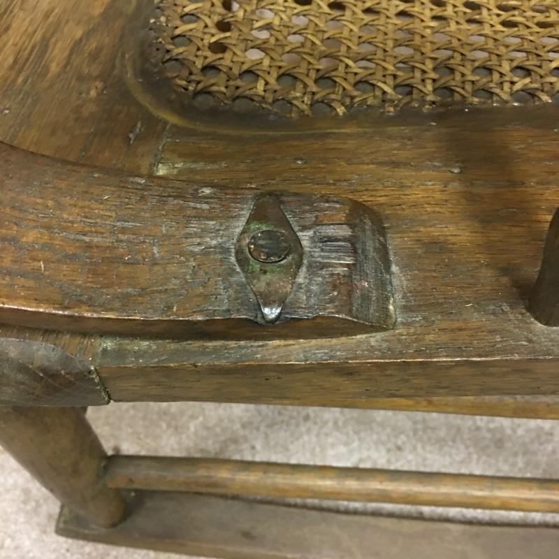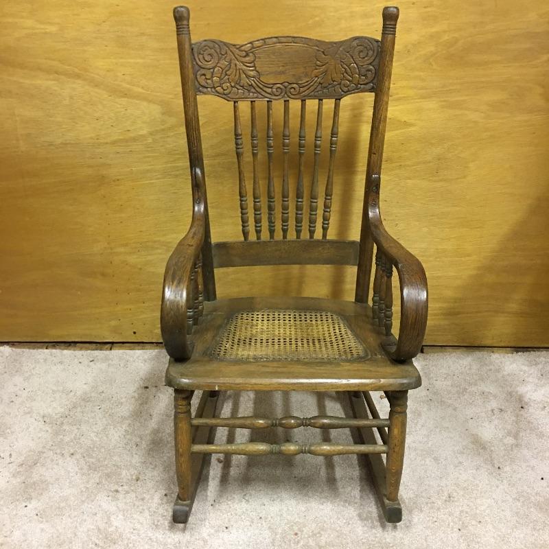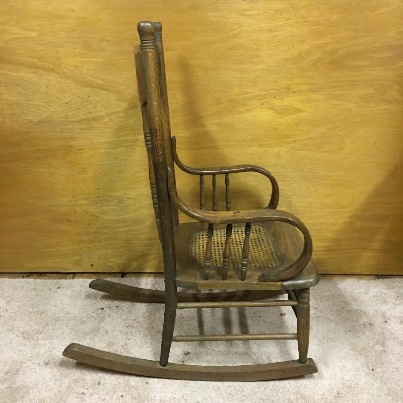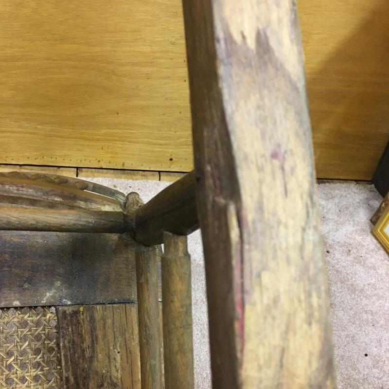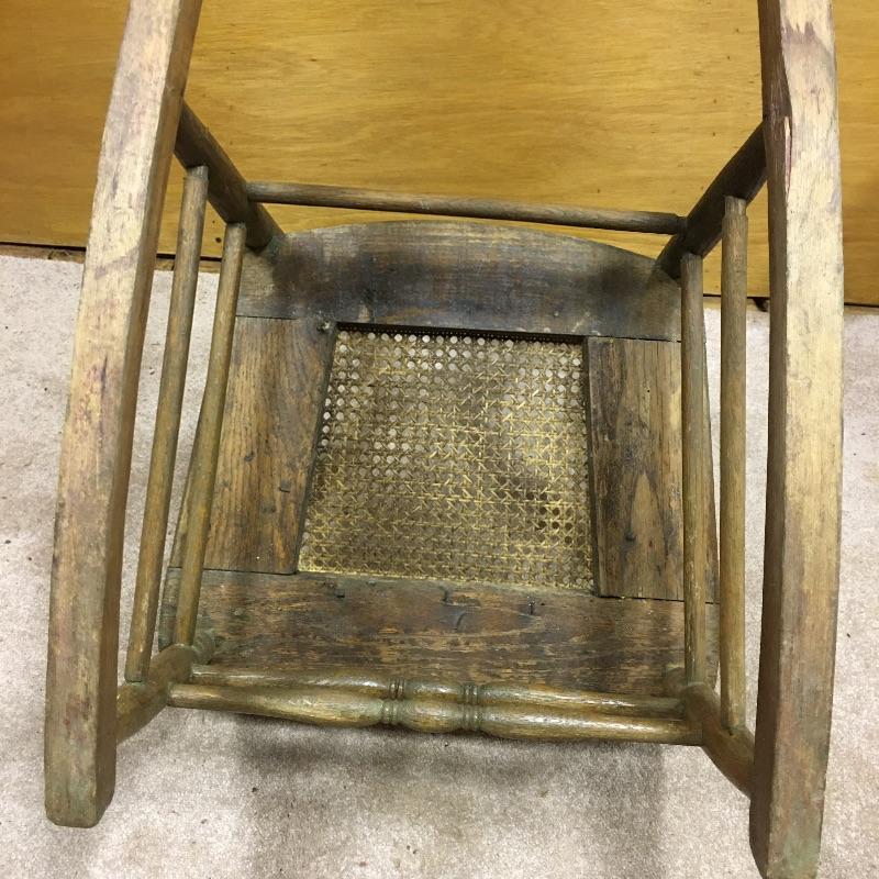This pair of cane bottom chairs are in good shape with some scratches and nicks, see pictures. The rocker has a carved back with seven spindles and a cane bottom. The chair has been screwed together but appears to be sturdy, see pictures.