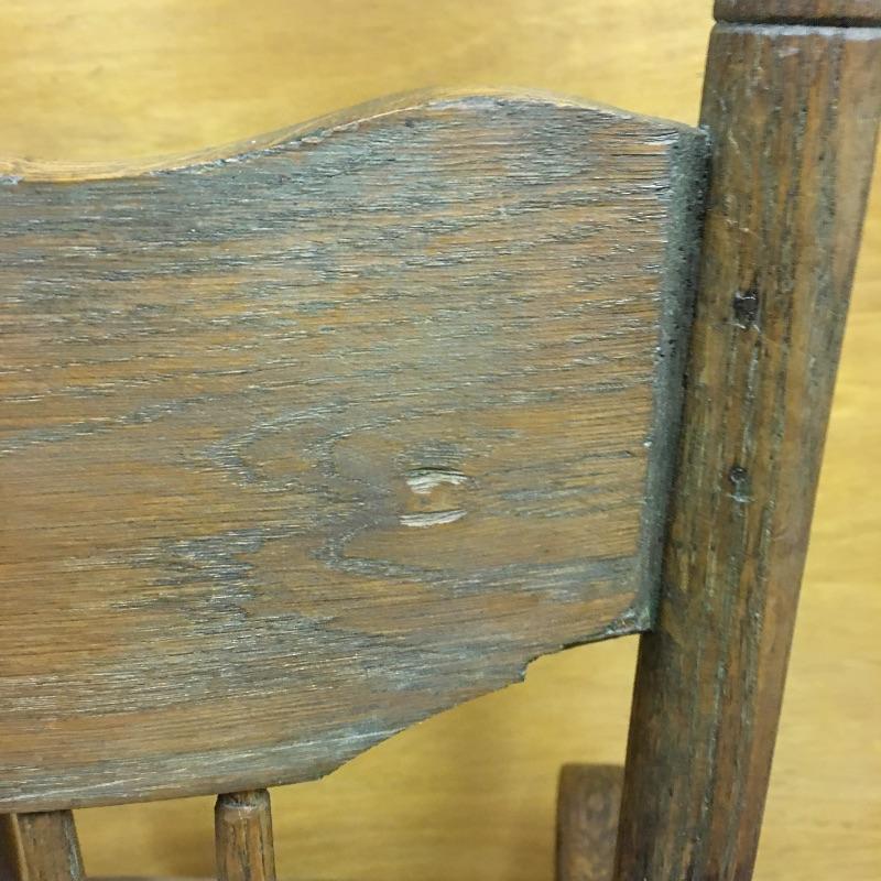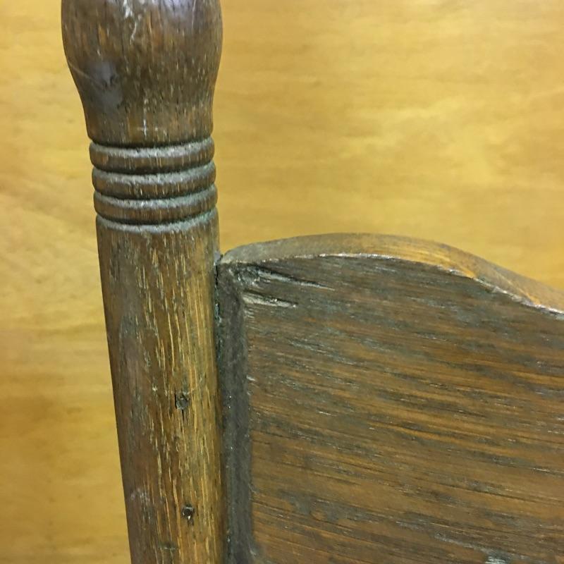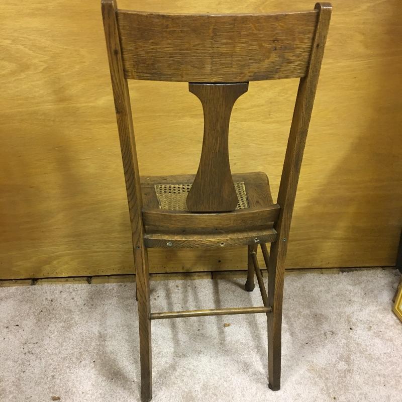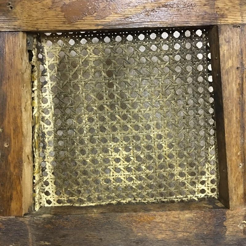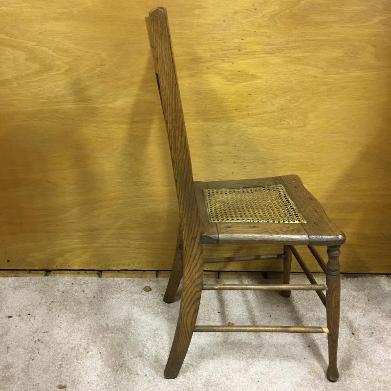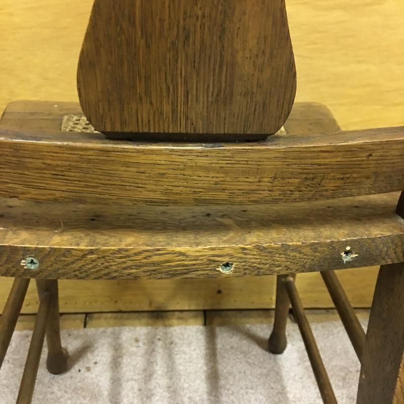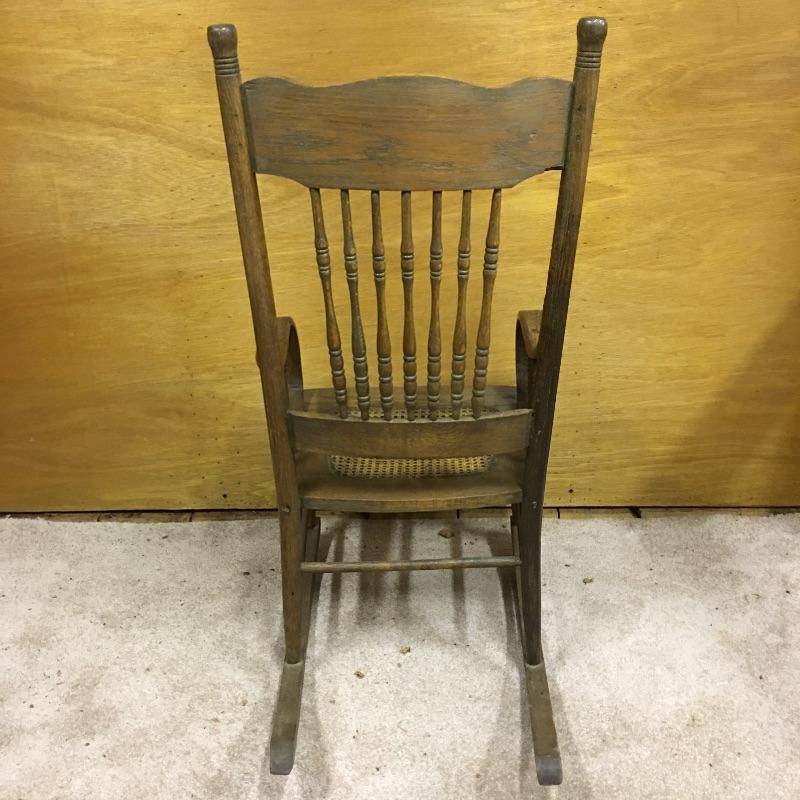 This pair of cane bottom chairs are in good shape with some scratches and nicks, see pictures. The rocker has a carved back with seven spindles and a cane bottom. The chair has been screwed together but appears to be sturdy, see pictures.