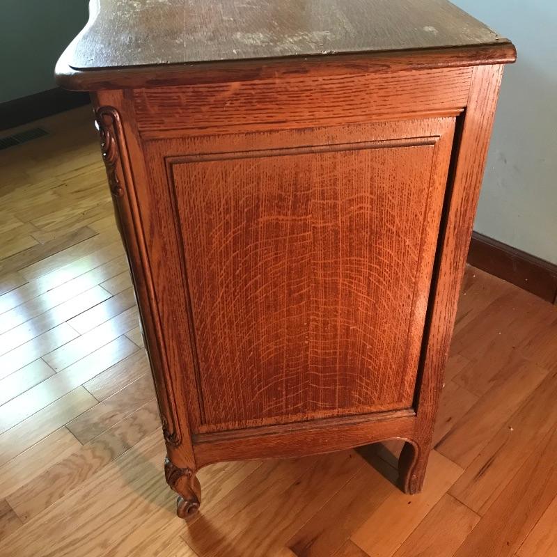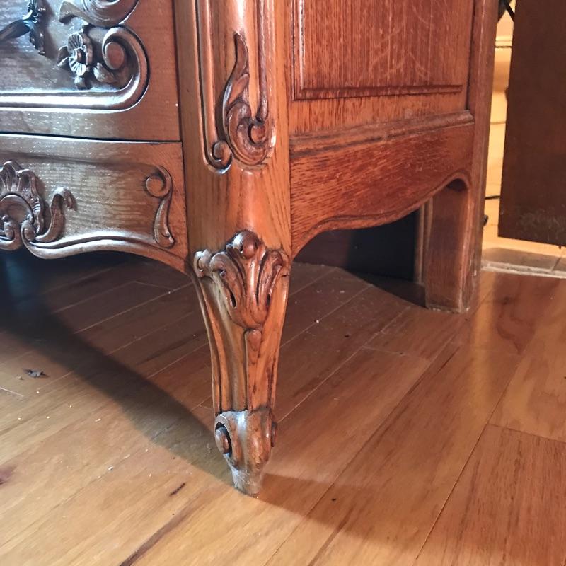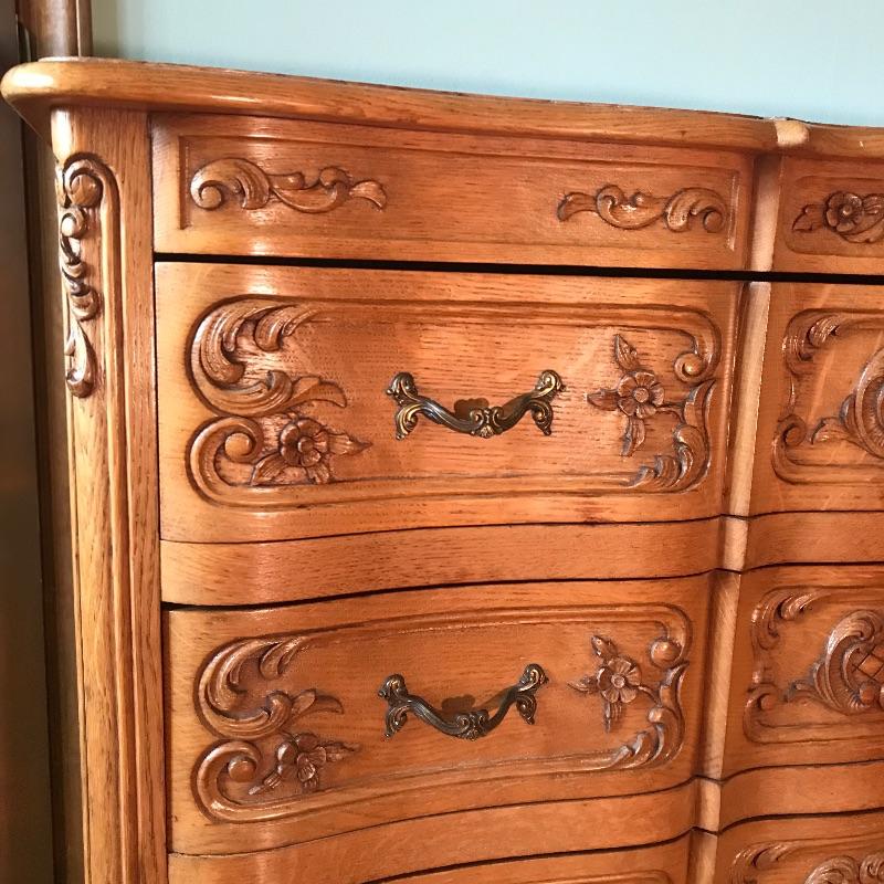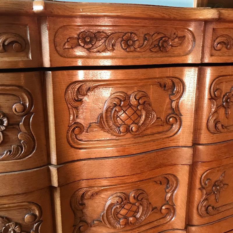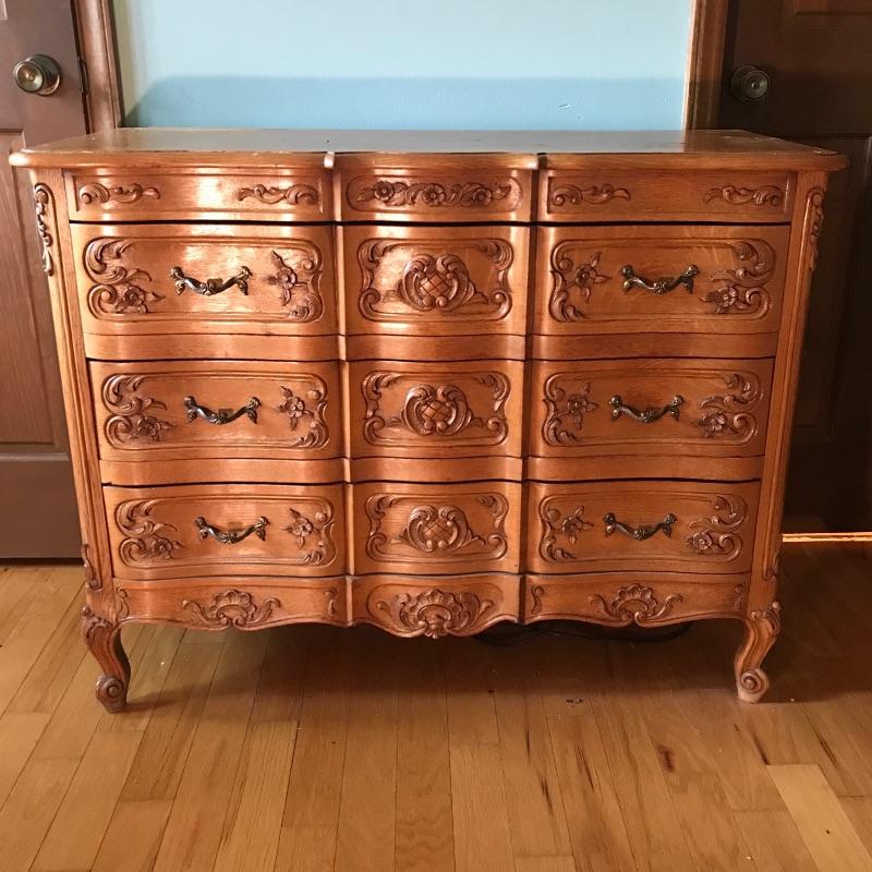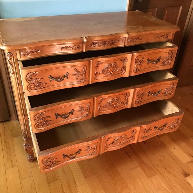 Stunning carved designs throughout this medium colored wooden dresser. This piece has six ornate metal pulls on three smooth gliding drawers. Piece is in very nice shape except the top. It looks like it’s made with veneer and needs repaired, replaced or even just covered up. See photos. The backside can be on display if needed, it has been stained with a unsealed feel. Dresser measures 43” x 20” x 34”. Local pick up only.