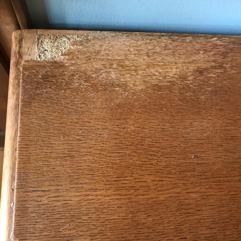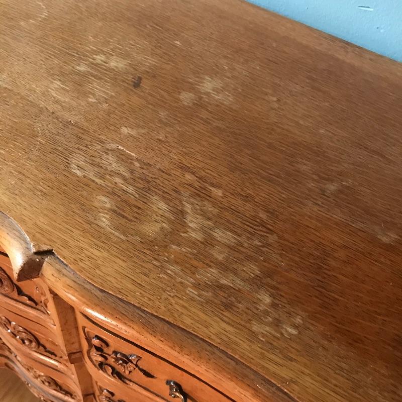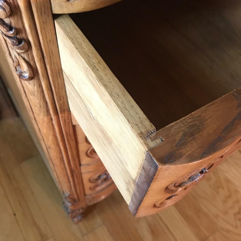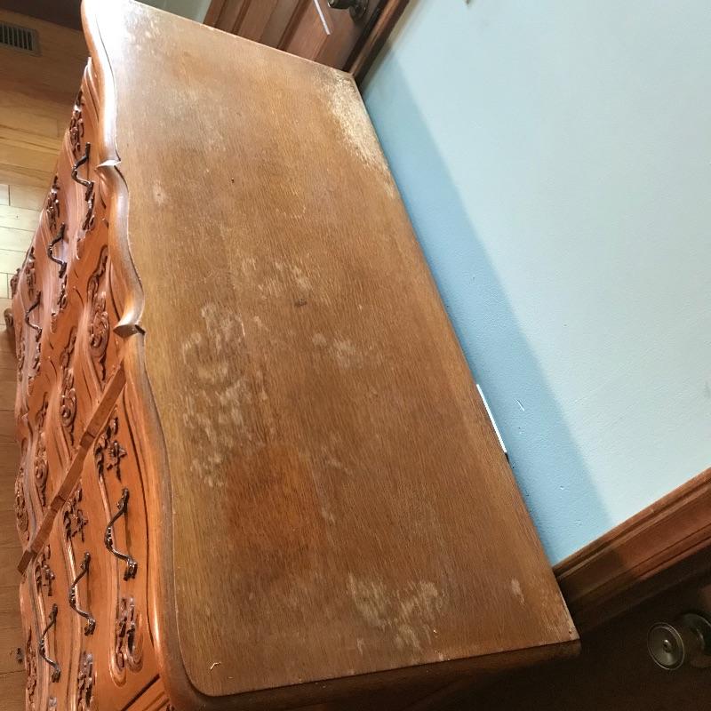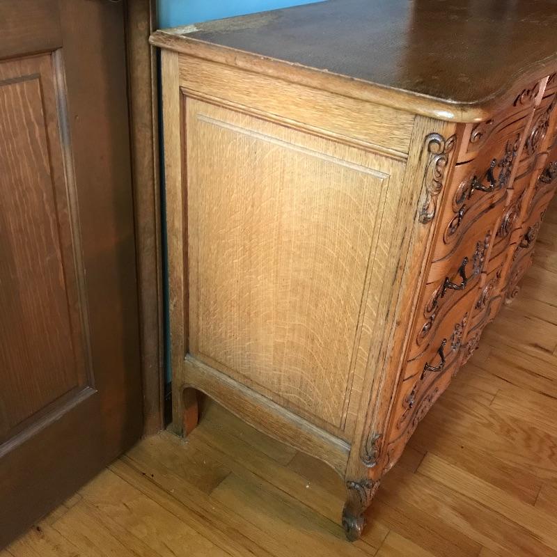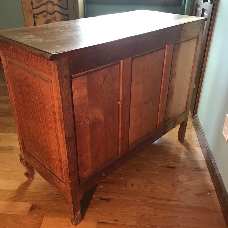 Stunning carved designs throughout this medium colored wooden dresser. This piece has six ornate metal pulls on three smooth gliding drawers. Piece is in very nice shape except the top. It looks like it’s made with veneer and needs repaired, replaced or even just covered up. See photos. The backside can be on display if needed, it has been stained with a unsealed feel. Dresser measures 43” x 20” x 34”. Local pick up only.