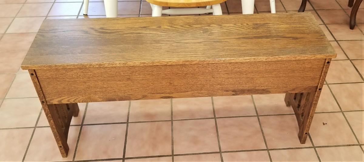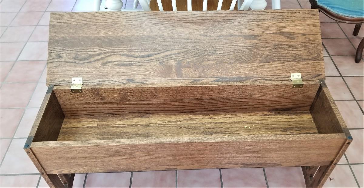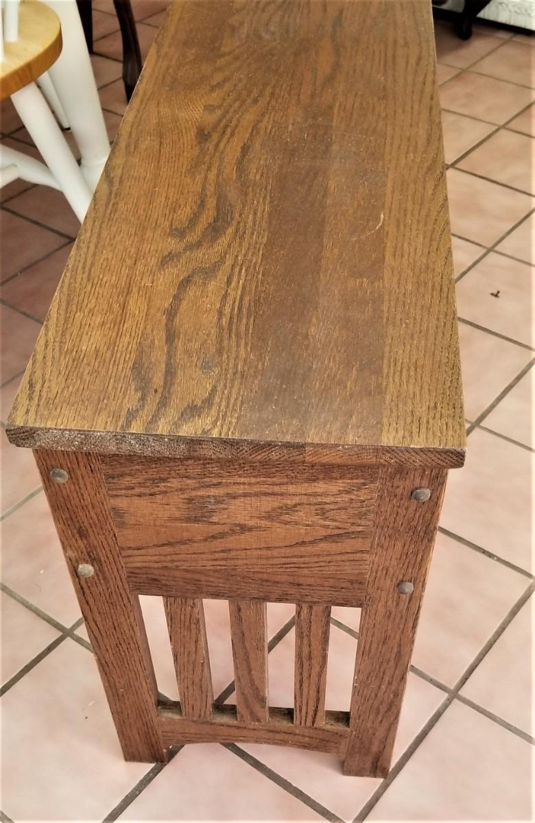 Decorator piece, contemporary Mission-style bench with hinged lid and storage beneath. 11.5" wide, 41.5" across, 19" tall. Sturdy, good condition.