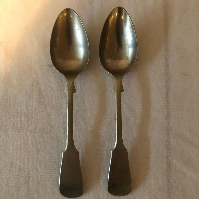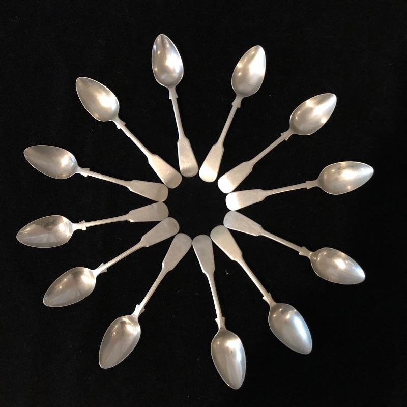 Daniel and Arter D&A matching twelve spoon set. These Fiddleback Pattern spoons are from the turn of the century and are likely silver plated. Marked "Nevada D&A" on back. Each spoon measures 5.5”.
