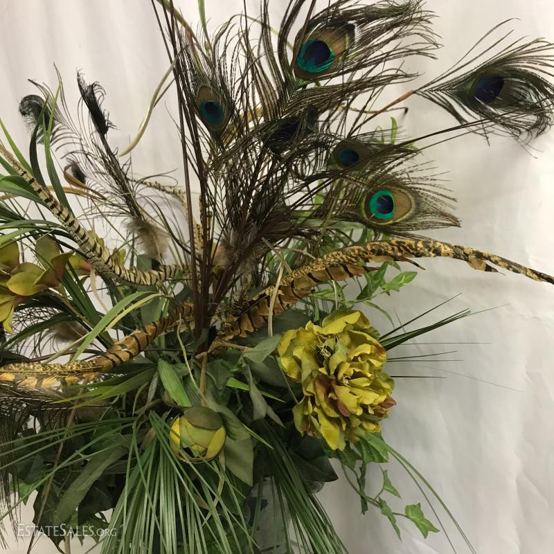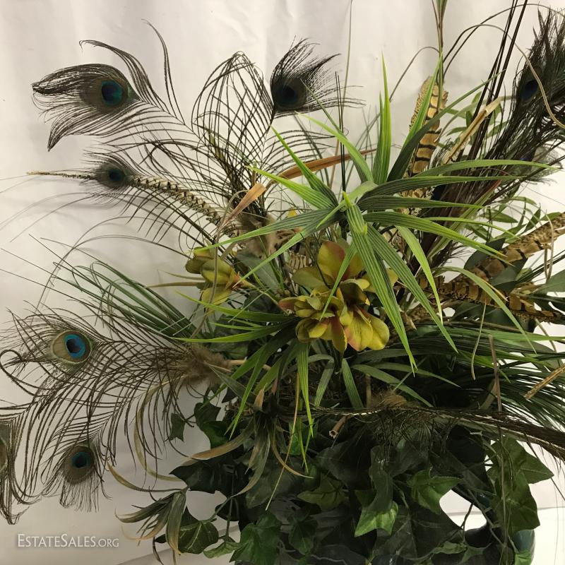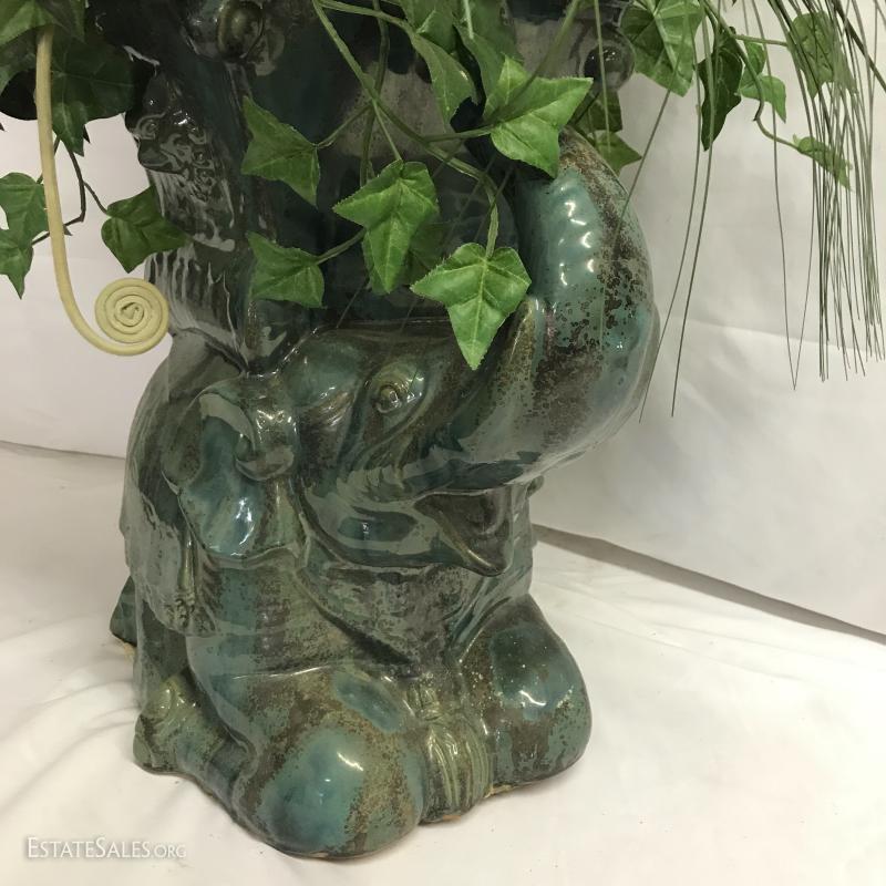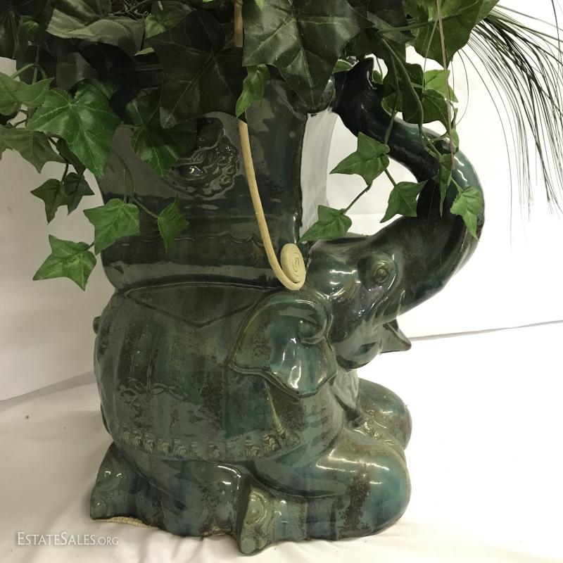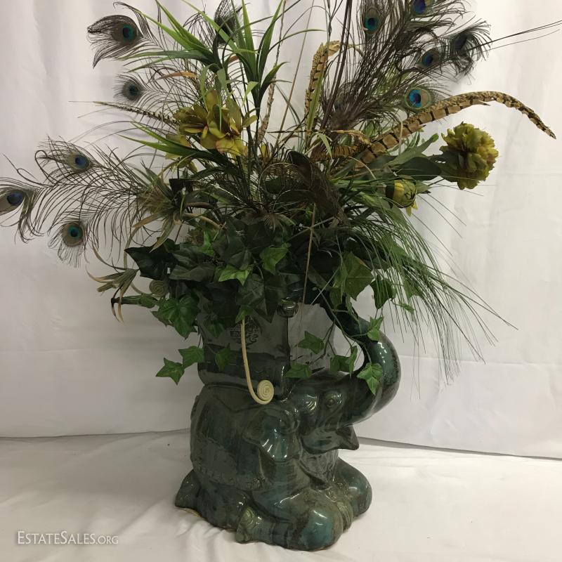 Blueish green elephant planter with flowers and peacock feathers. Floral arrangement can be changed. Elephant only is 16"l x 9"w x 17"h. With plants it is 36"l x 31".