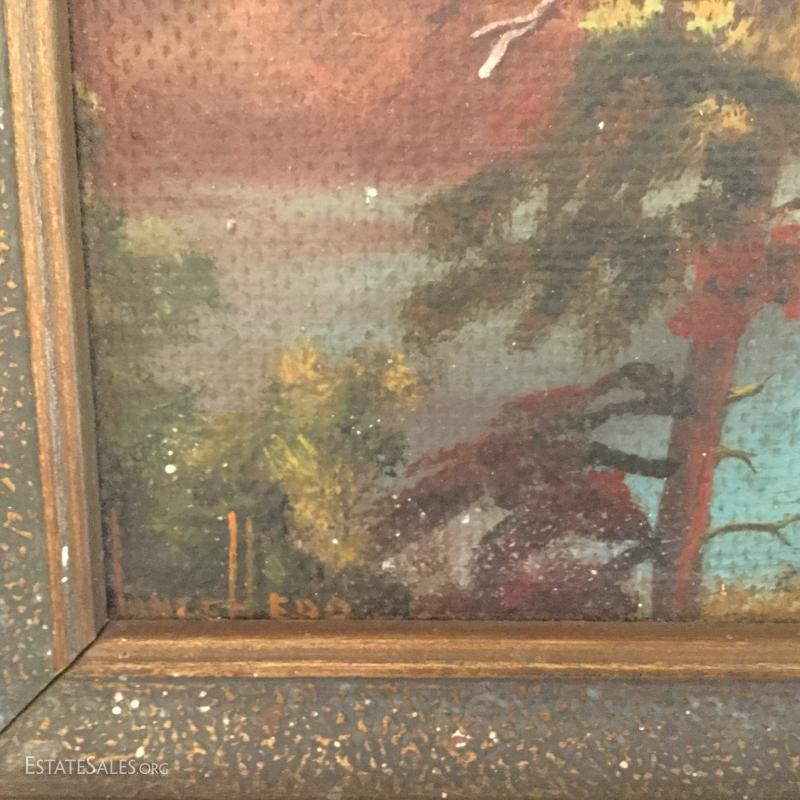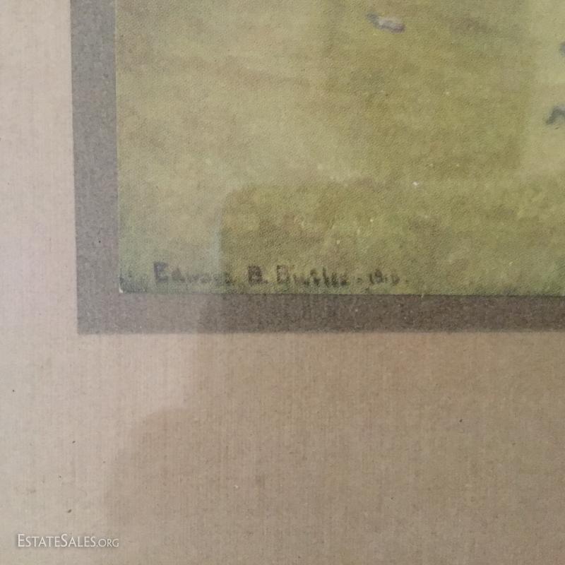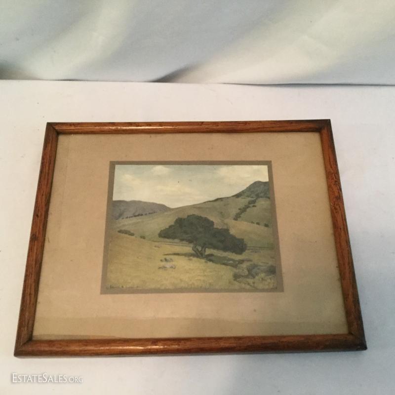 Smaller framed print of tree on hill is 12.5"w x 10"l. Signed Edward Bister. See pic