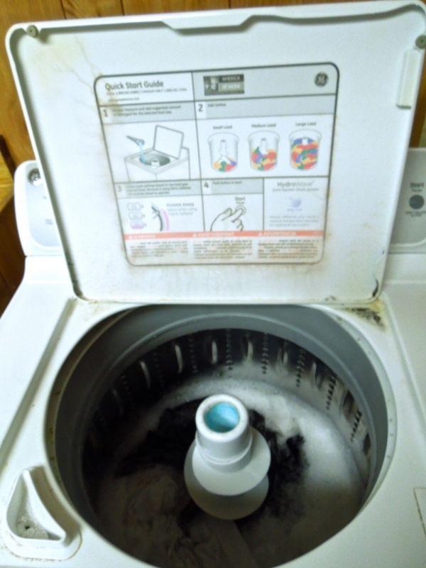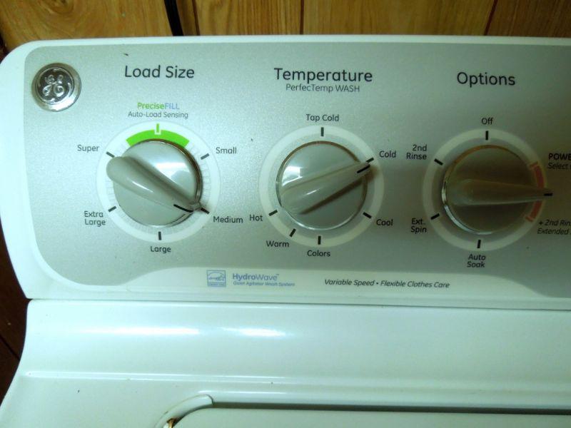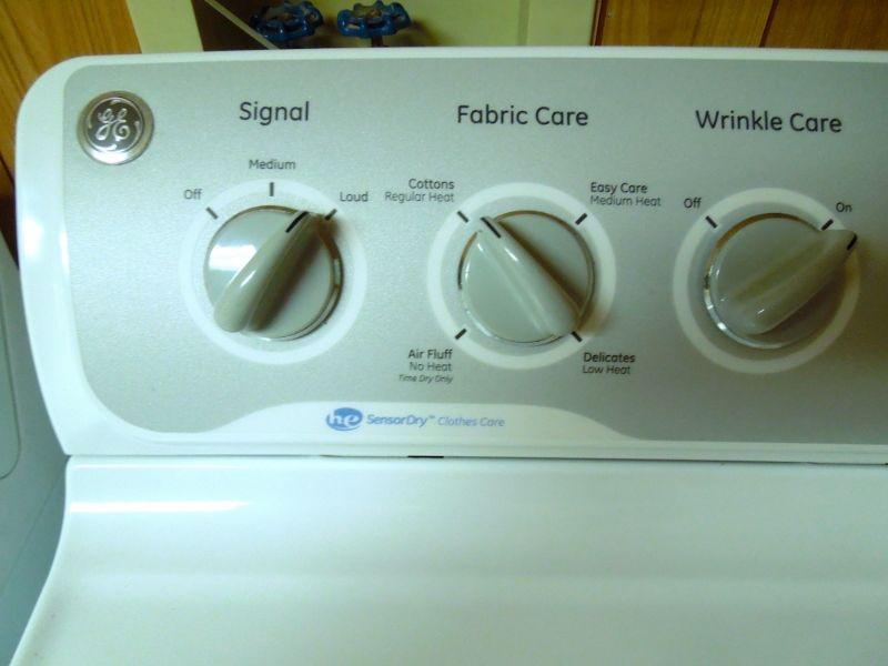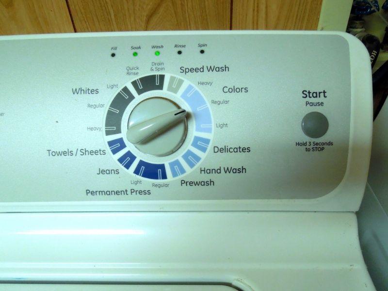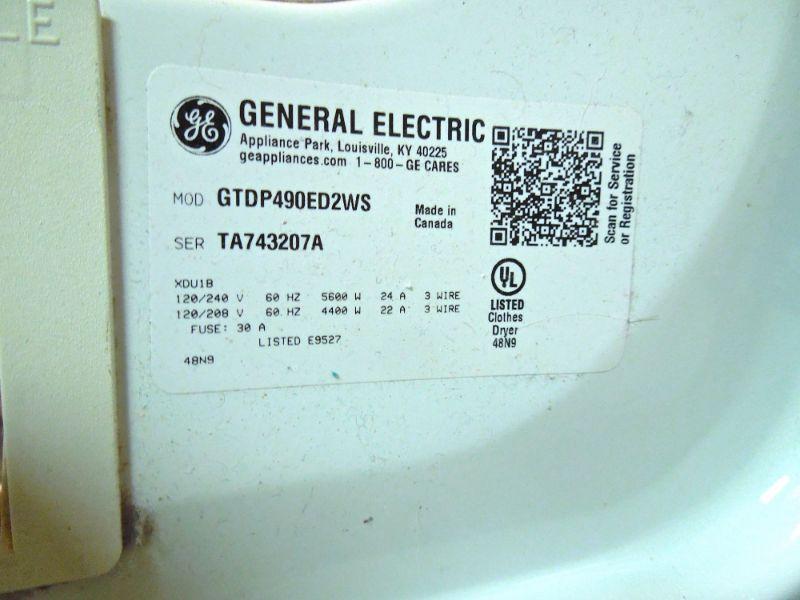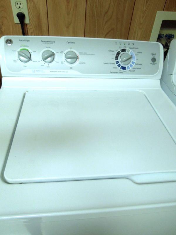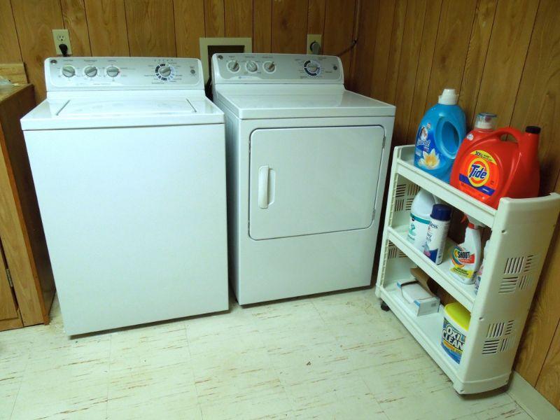 1990's model G.E. top loading washer in good working condition and matching G.E. dryer model GTDP490ED2WS also working. Manuals for both included. A rolling white plastic storage cart with detergents and laundry supplies is also included. some are less than half full.