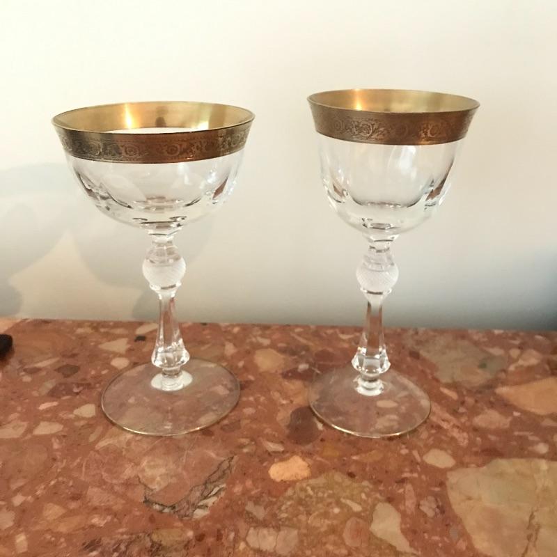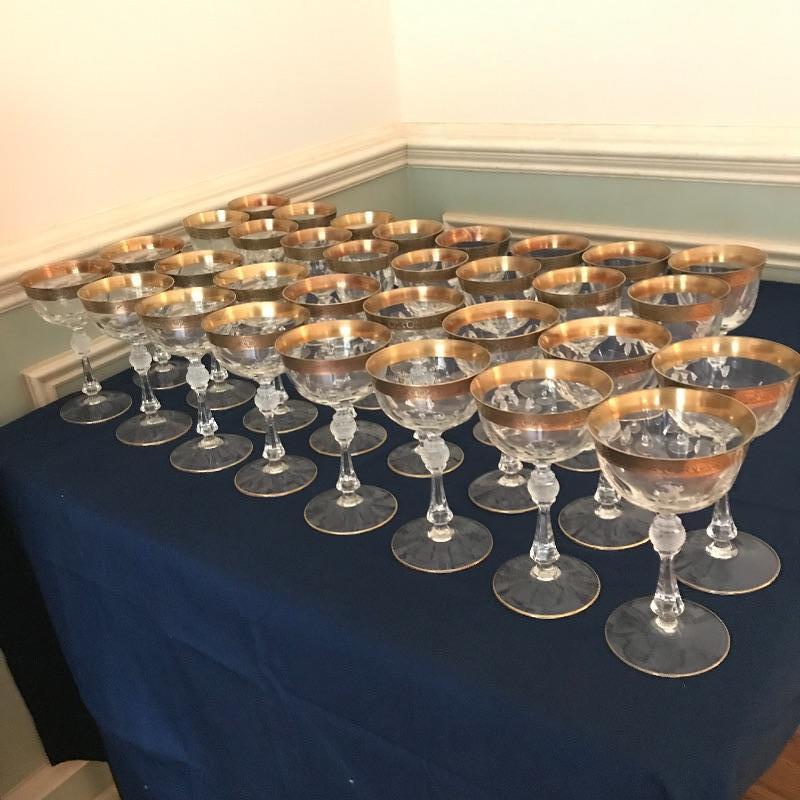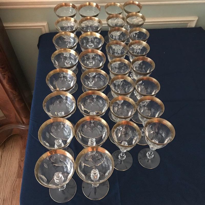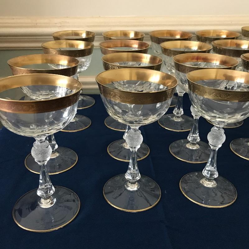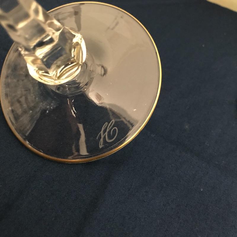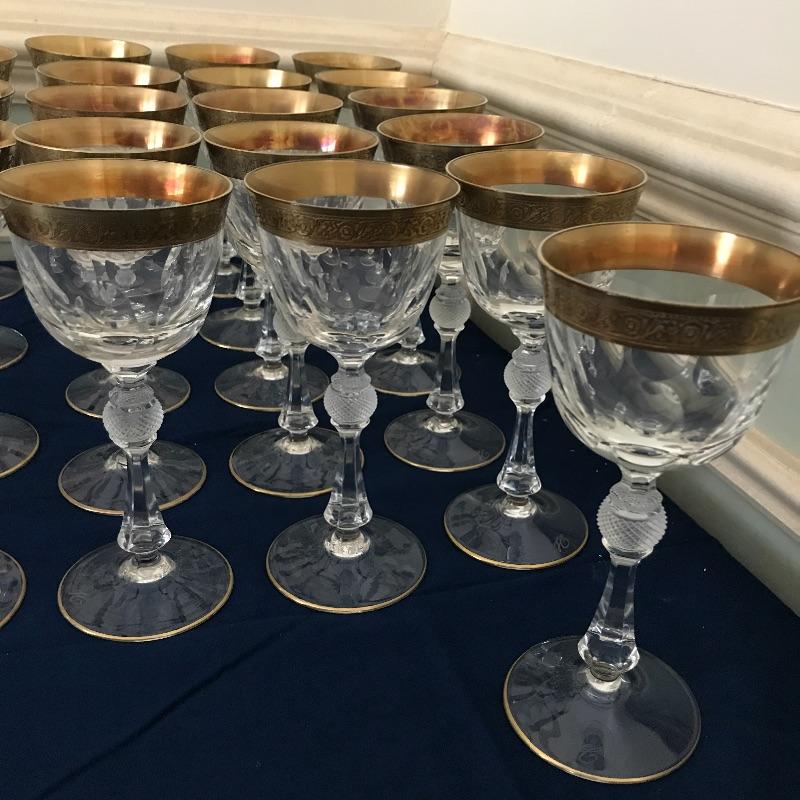 Two sets of 16 Crystal wine glasses with gold rims. One is slightly wider than the other. Purchased in Italy and added a monogrammed”H” on bases. All glass and gold rim in good condition with no visible chips. Shipping available. Please get quote from UPS prior to bidding 828-252-6930