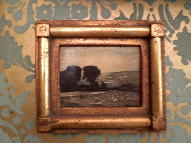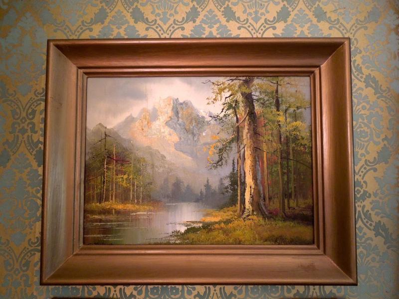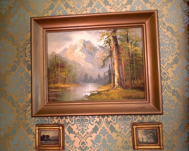 Nice grouping of oil paintings depicting trees and mountains. No signature noted. Larger painting is on canvas and measures 20" x 16". Two smaller are painted molded plaster and measure 5" x 4"