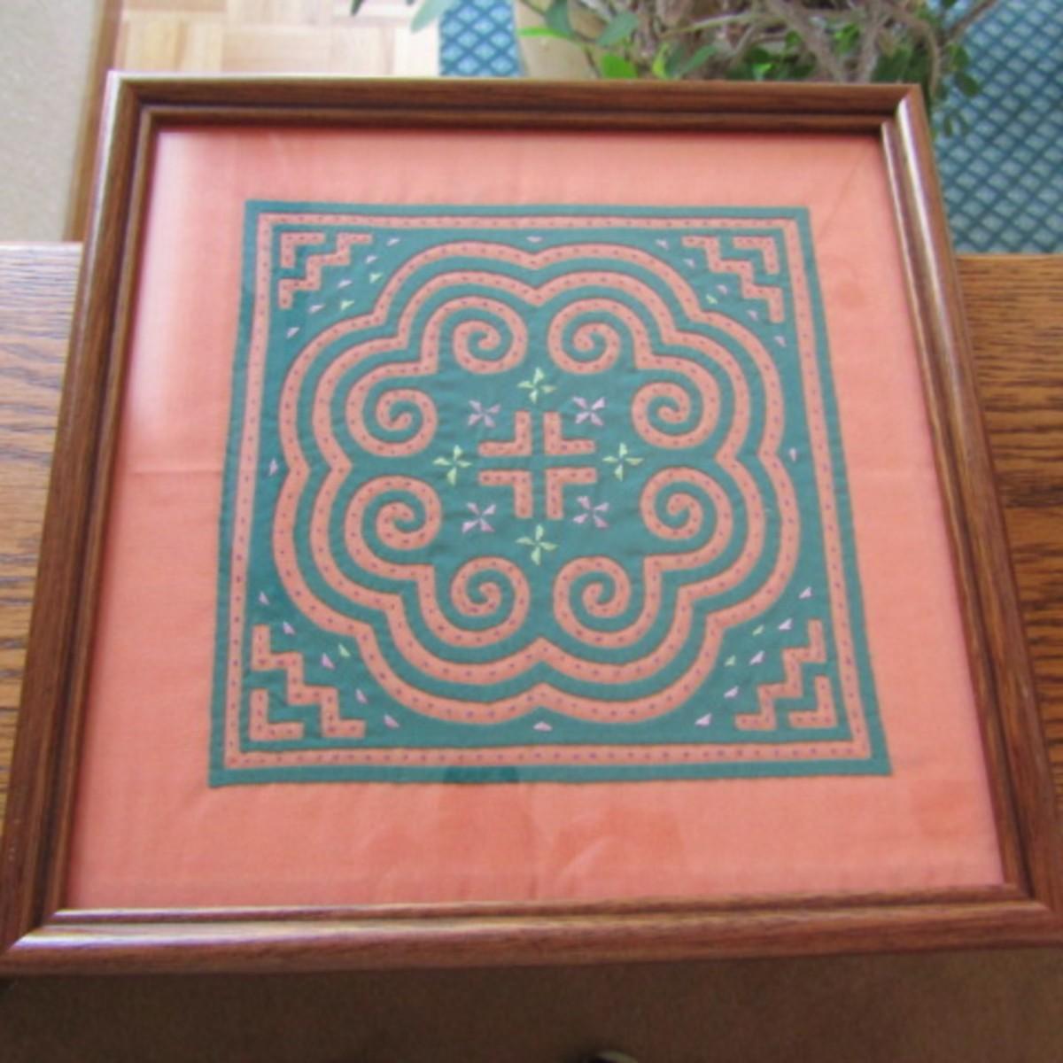 SMALL HAND-STITCHED WALL QUILT 8" SQUARE, KACHINA-LIKE FIGURE AND 2 BOWLS MADE FROM COCONUTS?
