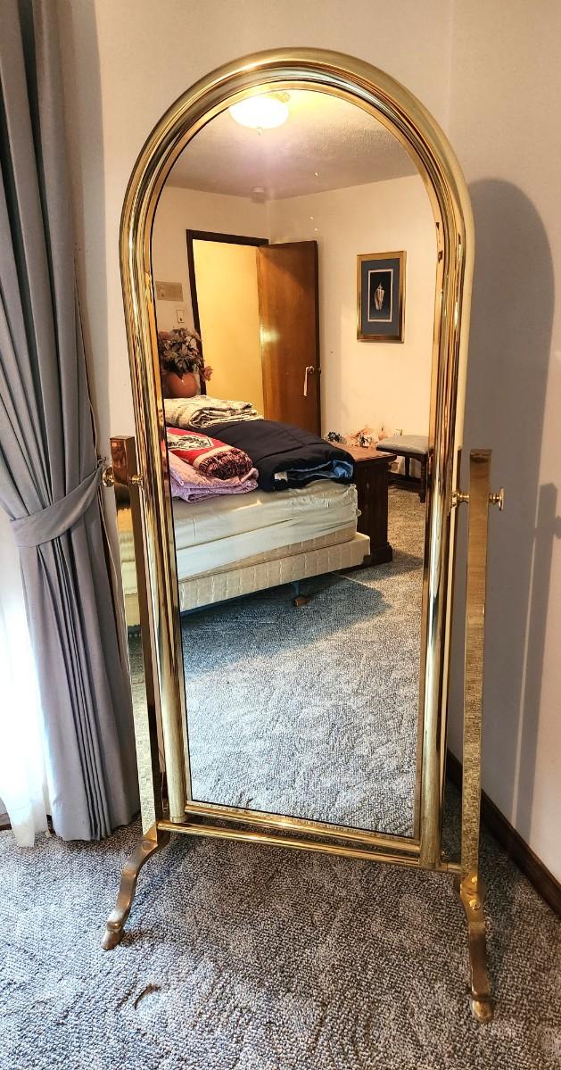 Lovely Brass Finish Standing Cheval Mirror - heavy. 32" across at widest point, 70" tall - good condition.