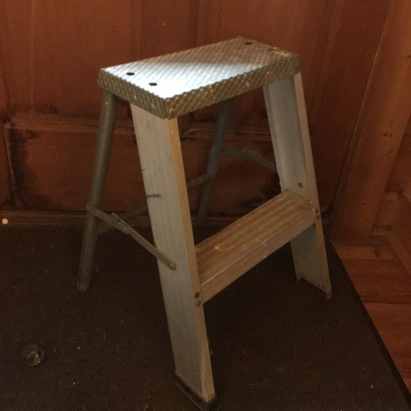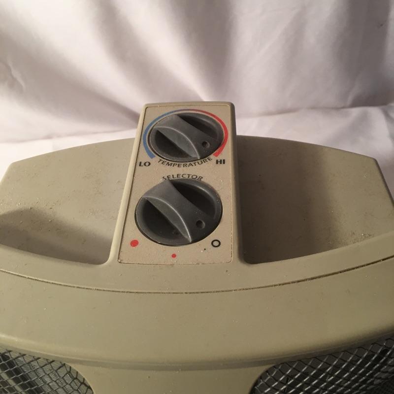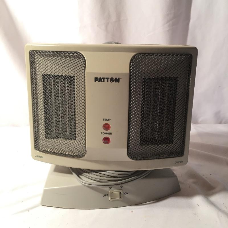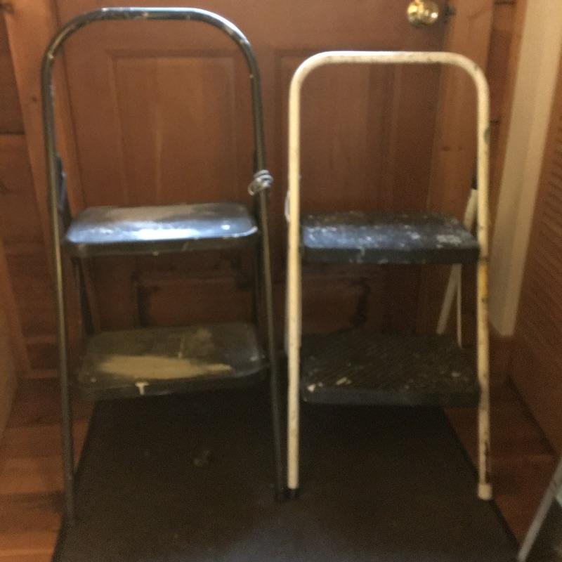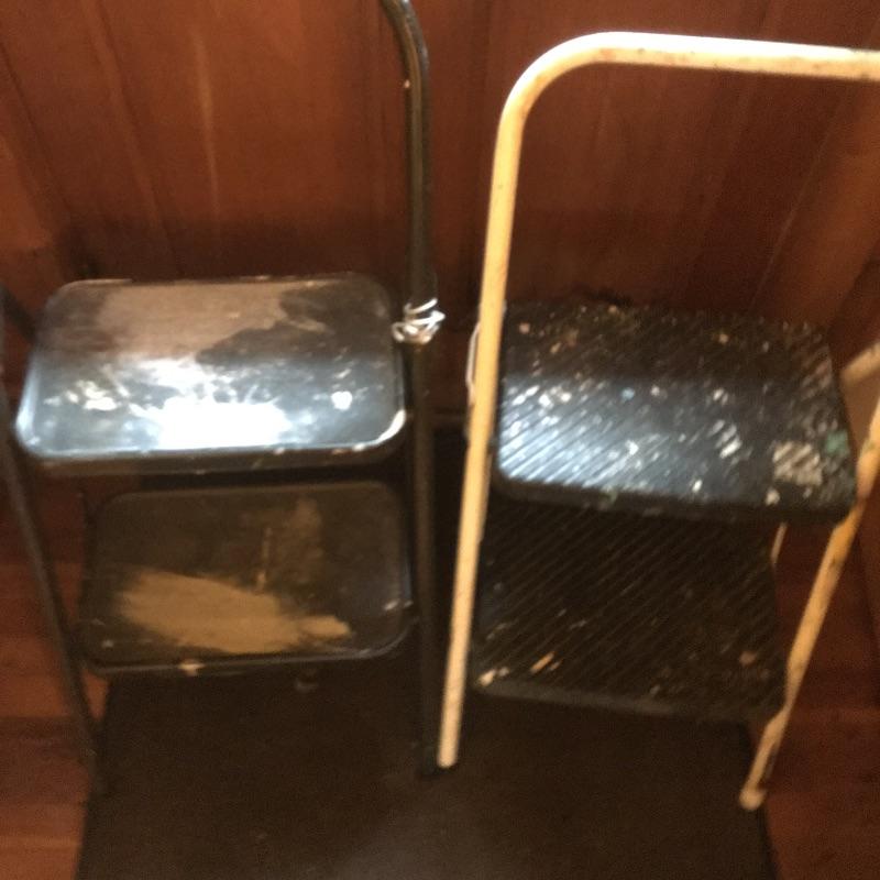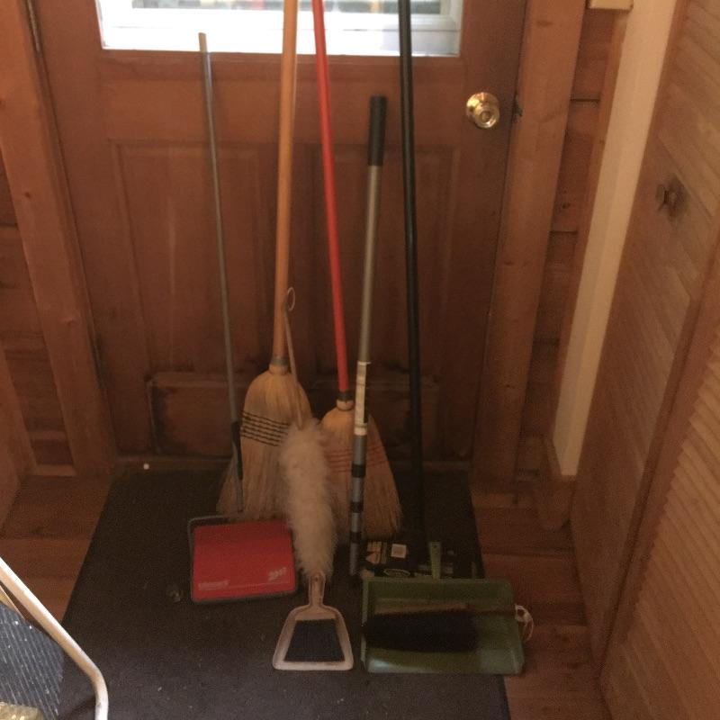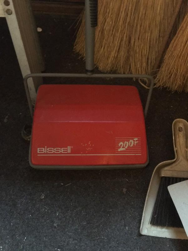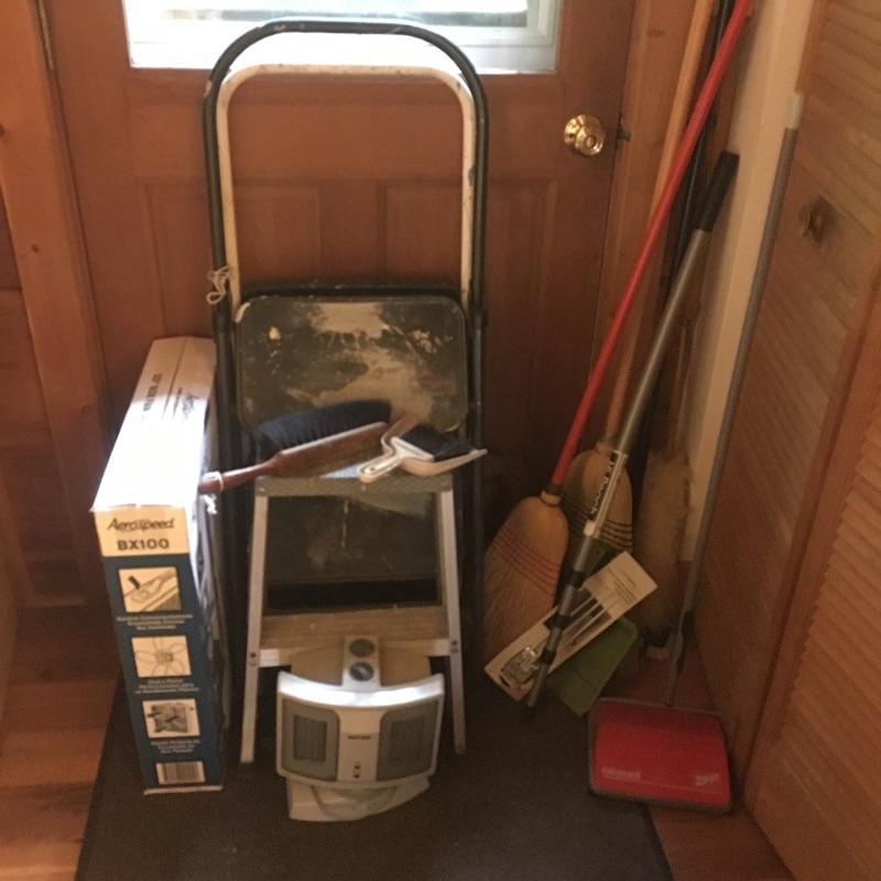 This collection of household supplies includes two step ladders, two brooms, Patton oscillating heater, box fan, Bissell carpet sweeper, pair of dustpans, deck scrubber, duster and more.